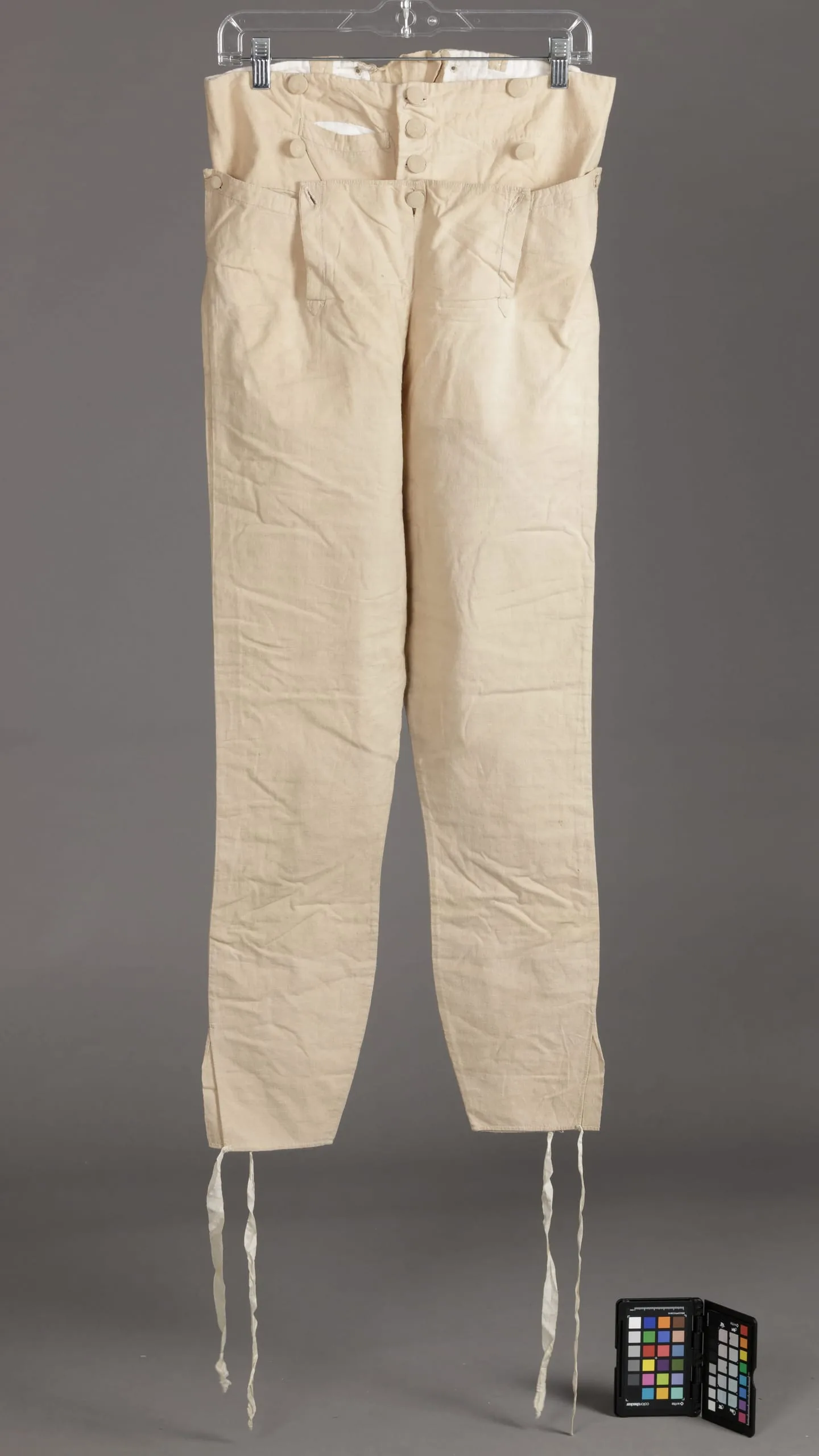 Cream-colored trousers displayed on a hanger, with a wide buttoned waistband, straight legs, and fabric ties at each ankle hem