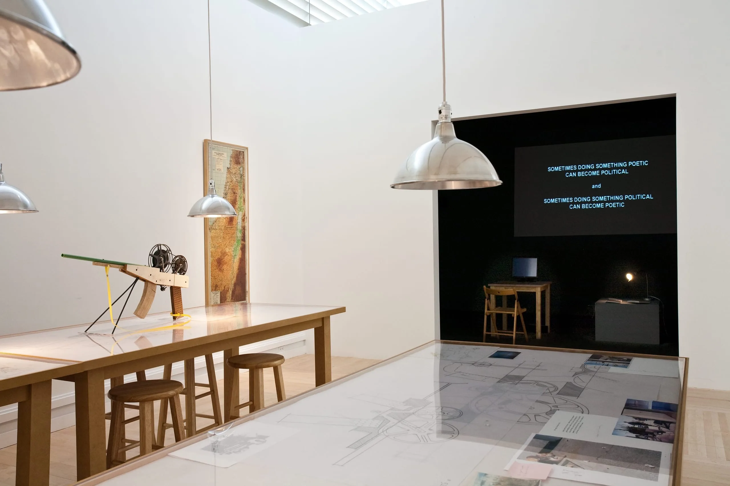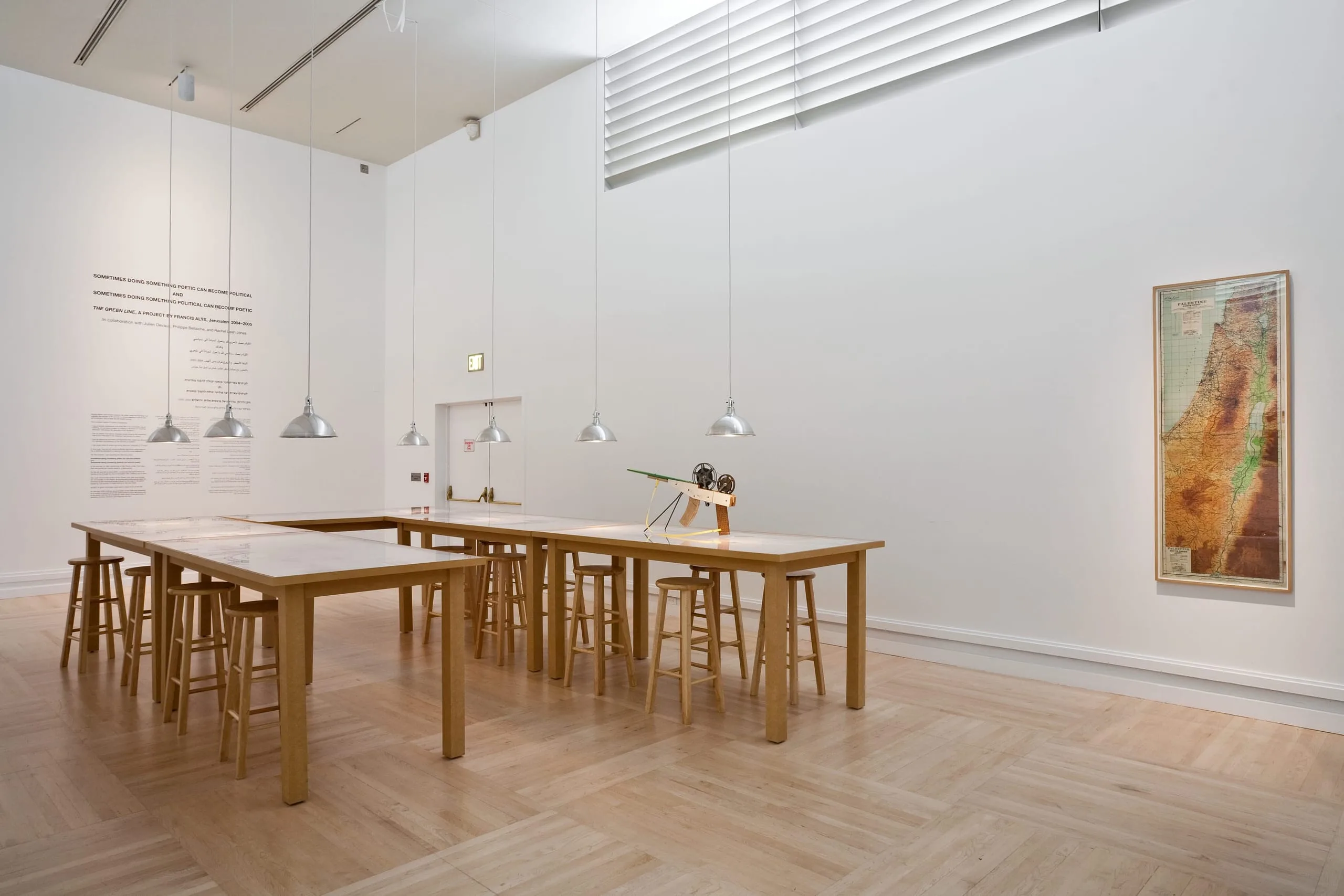 This installation is a powerful reflection on the absurdity of political boundaries, in this case, the Green Line. The Green Line refers to the 1949 armistice lines established between Israel and its neighbors—Syria, Jordan, Lebanon, and Egypt—at the end of the 1948 Arab-Israeli War. Its name was derived from the green pencil used to draw the line on the map during the armistice talks. In June 2004, Francis Alÿs performed a walk in Jerusalem holding a leaking can of green paint, following a portion of the Green Line. Israelis and Palestinians were invited to react spontaneously to the action. Ilona Katzew, 2008