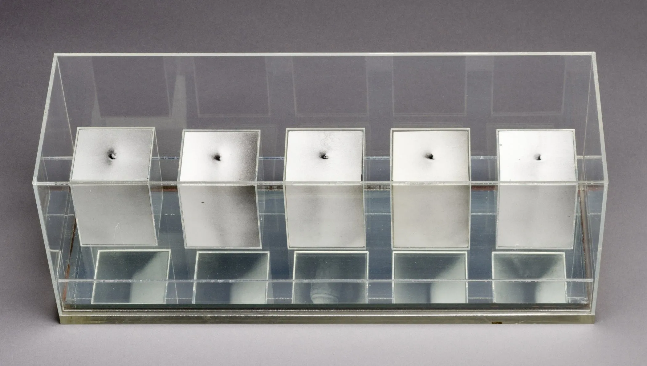- a-e) Photo box: 4 x 3 1/4 x 3 in. (10.16 x 8.26 x 7.62 cm) each; f) Plexi vitrine: 8 1/4 x 22 1/4 x 7 1/4 in. (20.96 x 56.52 x 18.42 cm); g) Plexi base with mirror: 2 3/4 x 21 7/8 x 6 7/8 in. (6.99 x 55.56 x 17.46 cm)