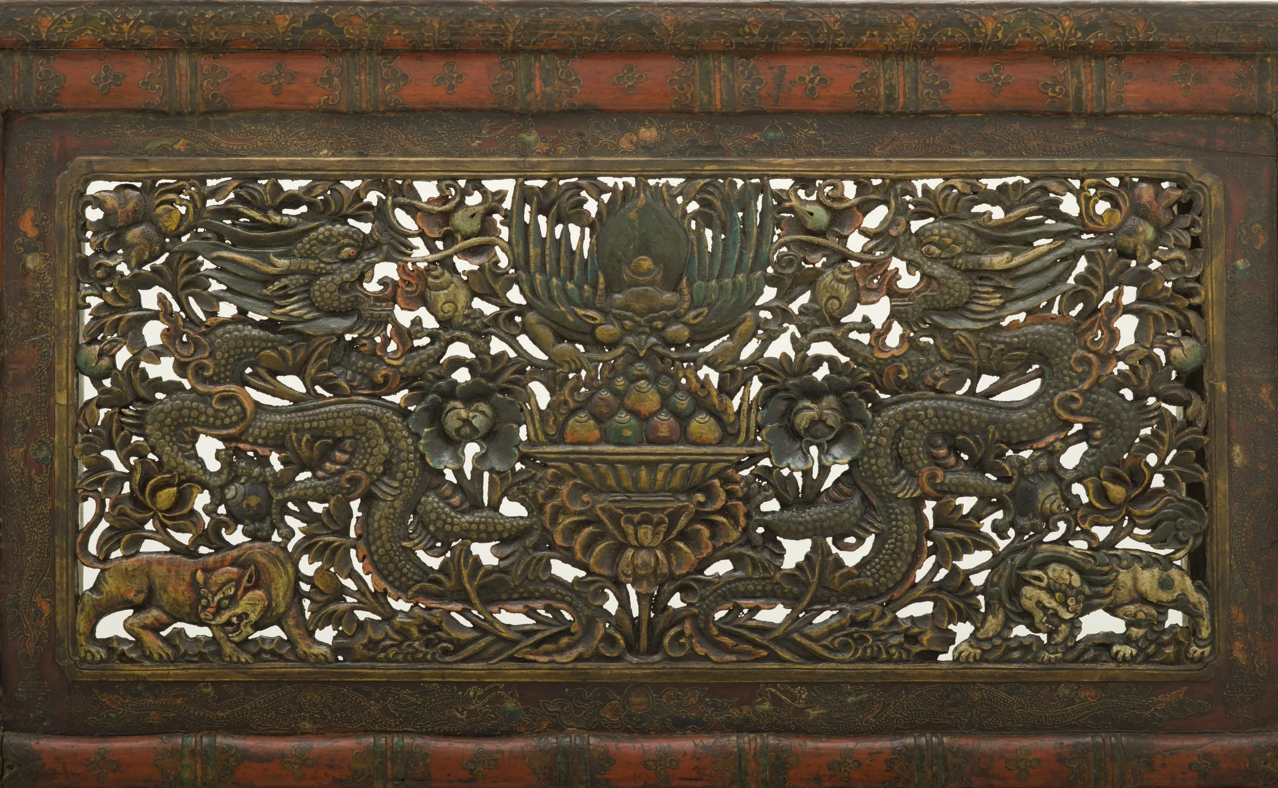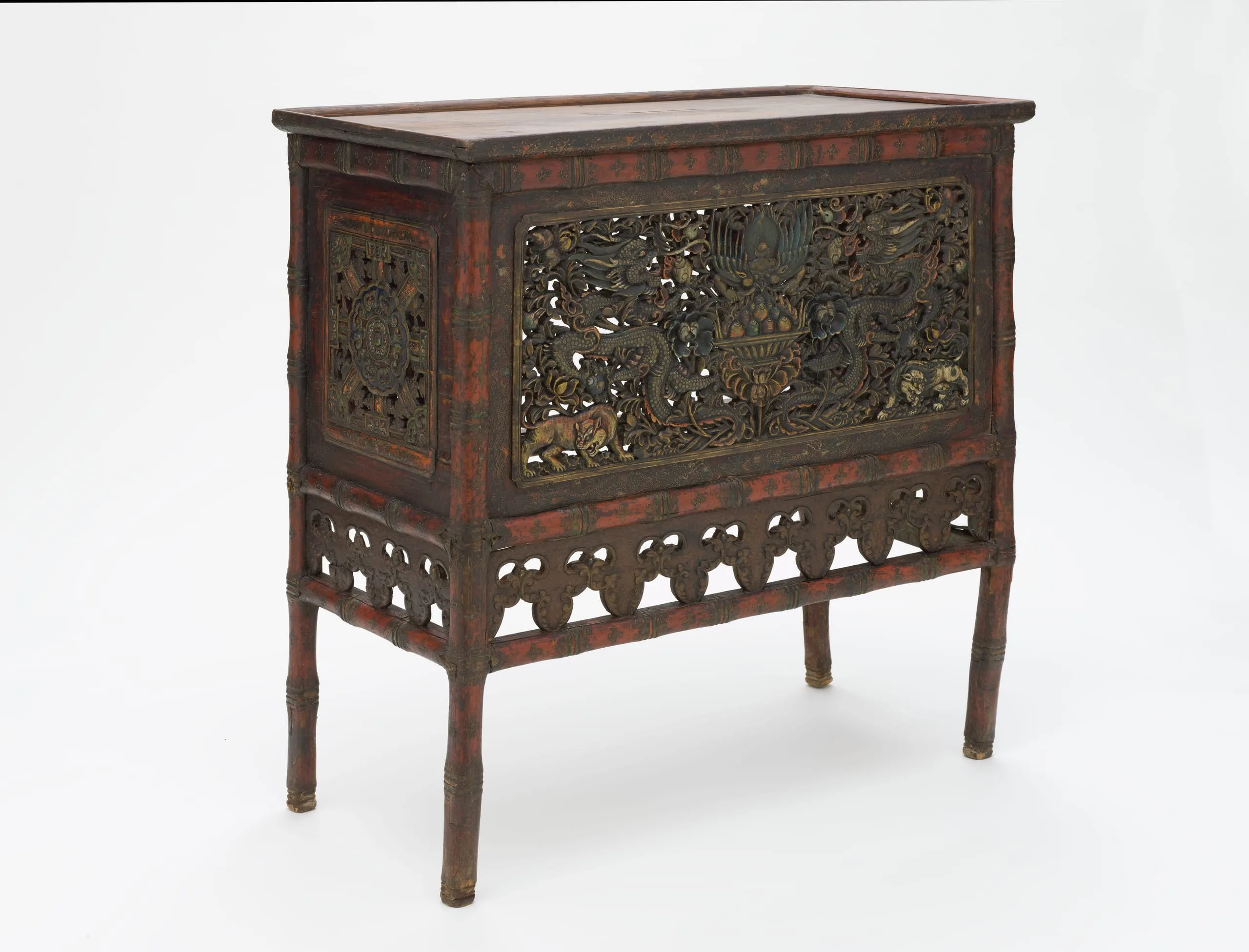 This is an unusually high altar table of the type associated with high lamas or VIPs and typically located next to their thrones. The legs and frame of the table are faux bamboo with raised gesso cloud and jewel designs. The front openwork central panel is carved in the center with the half-avian, half-human Garuda guarding flaming jewels issued from a lotus flanked by rearing dragons bearing flaming jewels, all set in a field of scrolling foliage. A snarling tiger is in the lower left corner, while a snarling snow lion is in the opposite lower corner. The central panel is surrounded by a raised gesso border of dragons and flaming jewels. The rectangular side panels are each adorned with an eight-spoked Buddhist Wheel of the Law (dharmachakra) with blue clouds forming the hub and a central medallion of a multicolored yin-yang or taijitu symbol. Lower narrow panels around the front and sides feature a series of linked cloud forms similar to pendant trefoils.