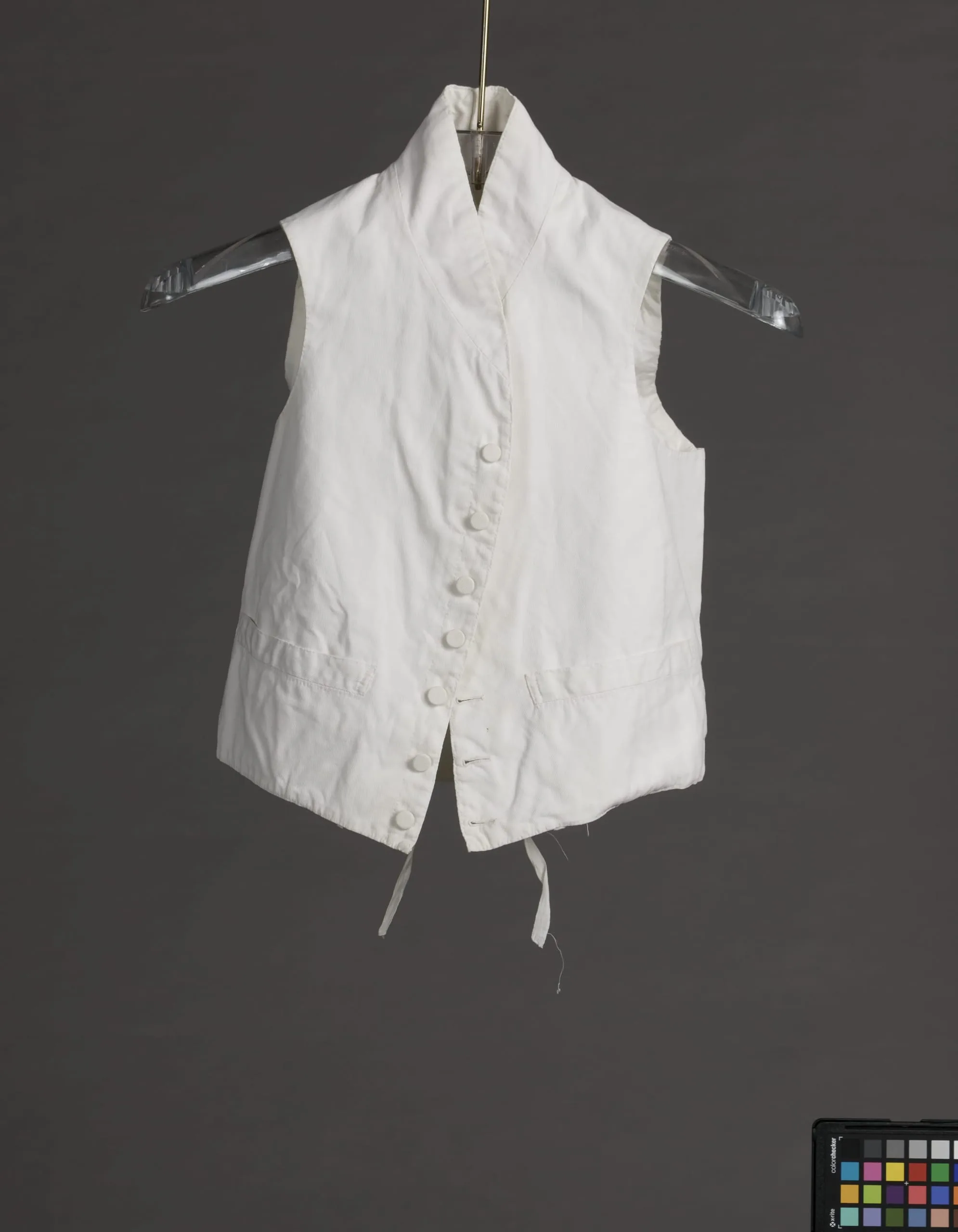 White sleeveless waistcoat with fabric-covered buttons and a standing collar, displayed on a clear hanger against a gray background