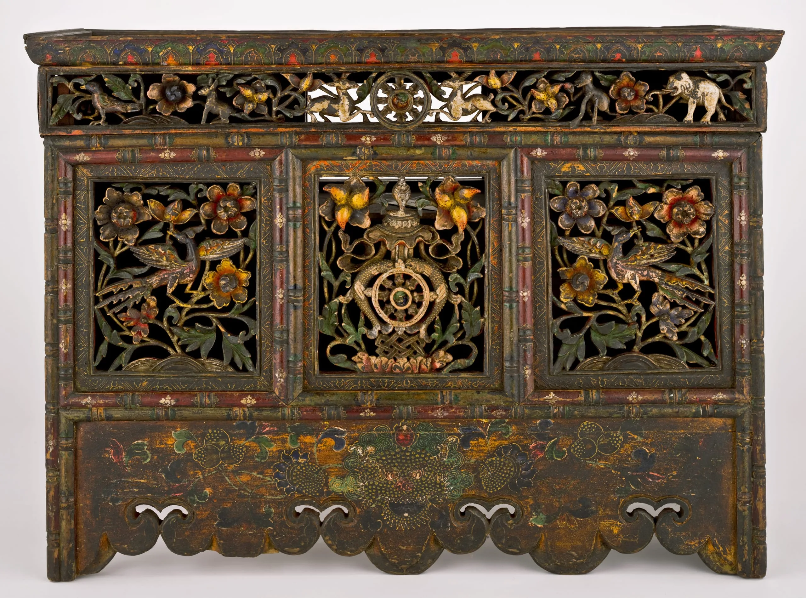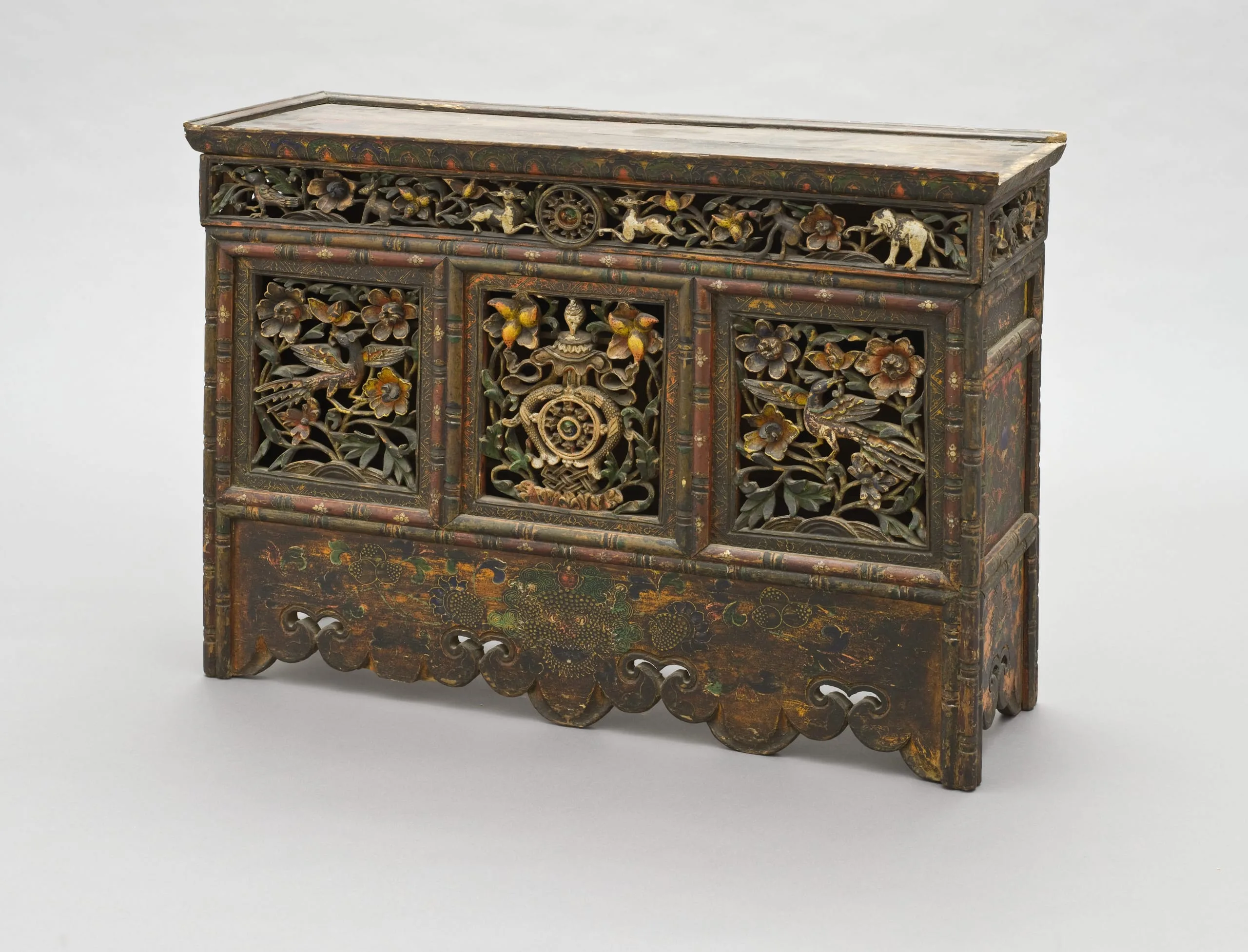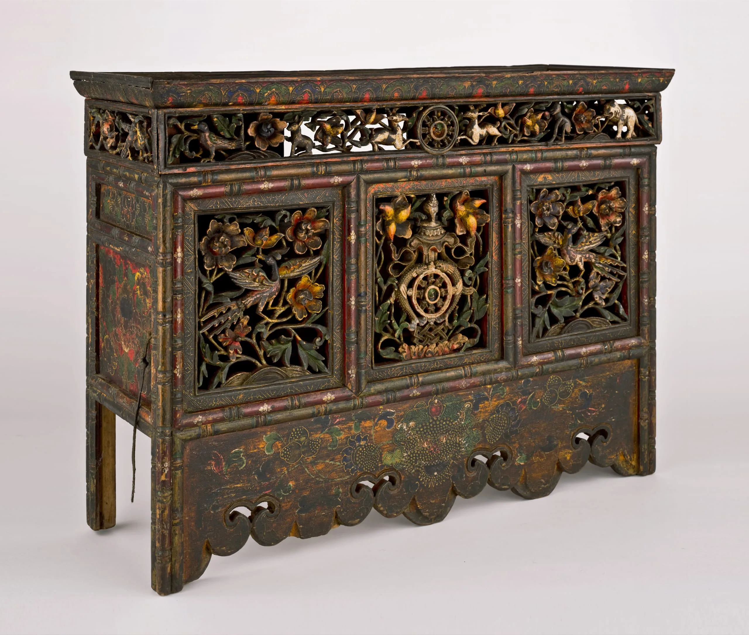 This is a medium height table, which suggests that it was originally used in front of an important lama’s throne in a monastery or in front of a nobleman’s raised seat in a domestic chapel. The openwork central panel ingeniously depicts the Eight Auspicious Symbols of Buddhism by combining seven small symbols to create the larger eighth symbol, the vase. The flanking front panels each depict birds amidst foliage. In the top panel two deer flank the Buddhist Wheel of the Law, representing Buddha Shakyamuni’s First Sermon in the Deer Park at Sarnath, India. The table’s bottom apron is carved in a cloud pattern and adorned with the face of a mythical animal, the zipac, which is an apotropaic symbol resembling the Indian "Face of Glory" (kirttimukha). The upper end panels are also openwork with a bird on a flowering vine. The lower end panels are painted with four motifs and a precious jewel. The proper right lower panel is also a door to access the table’s interior shelving. On the rear of the table is a sliding door.