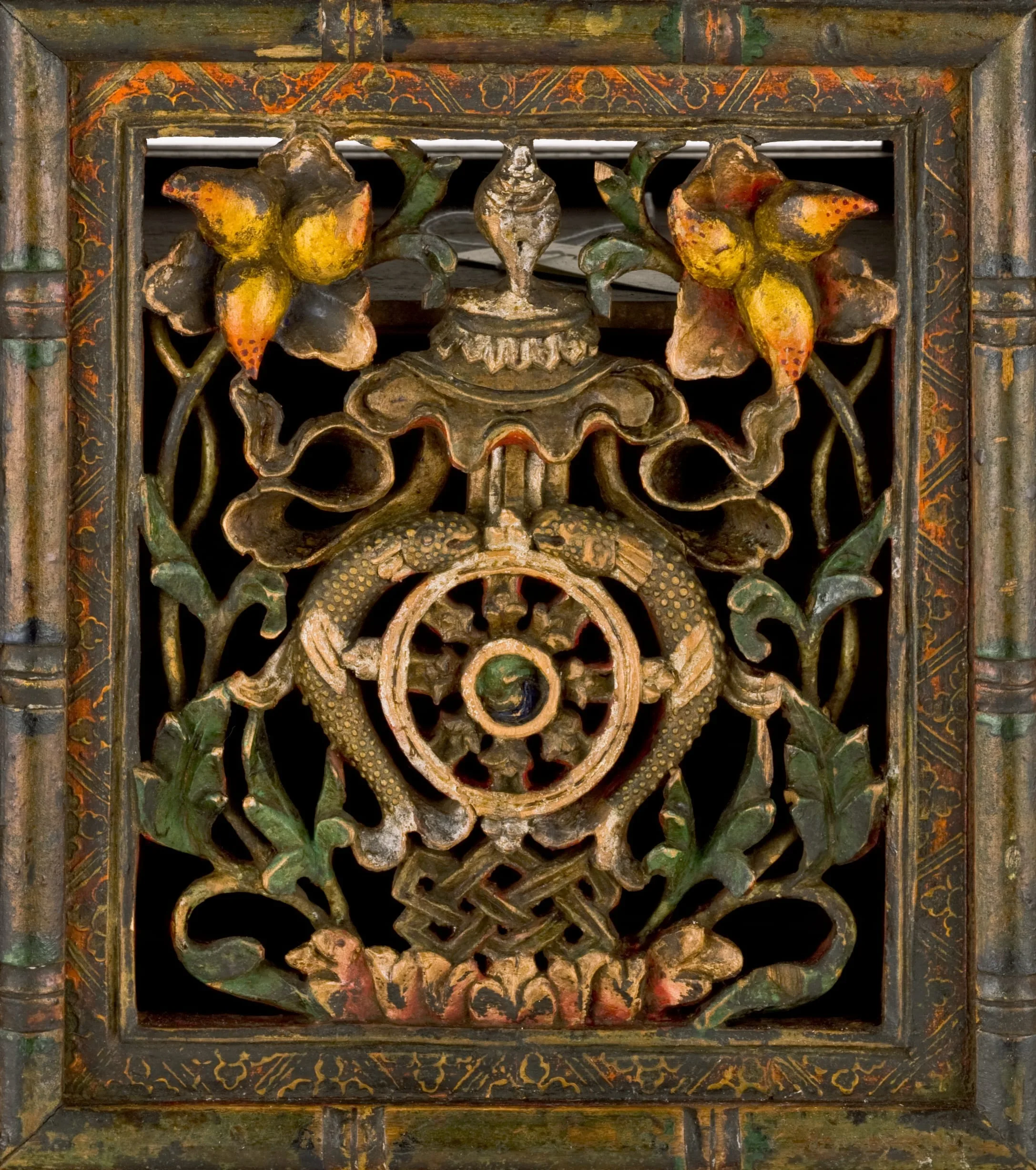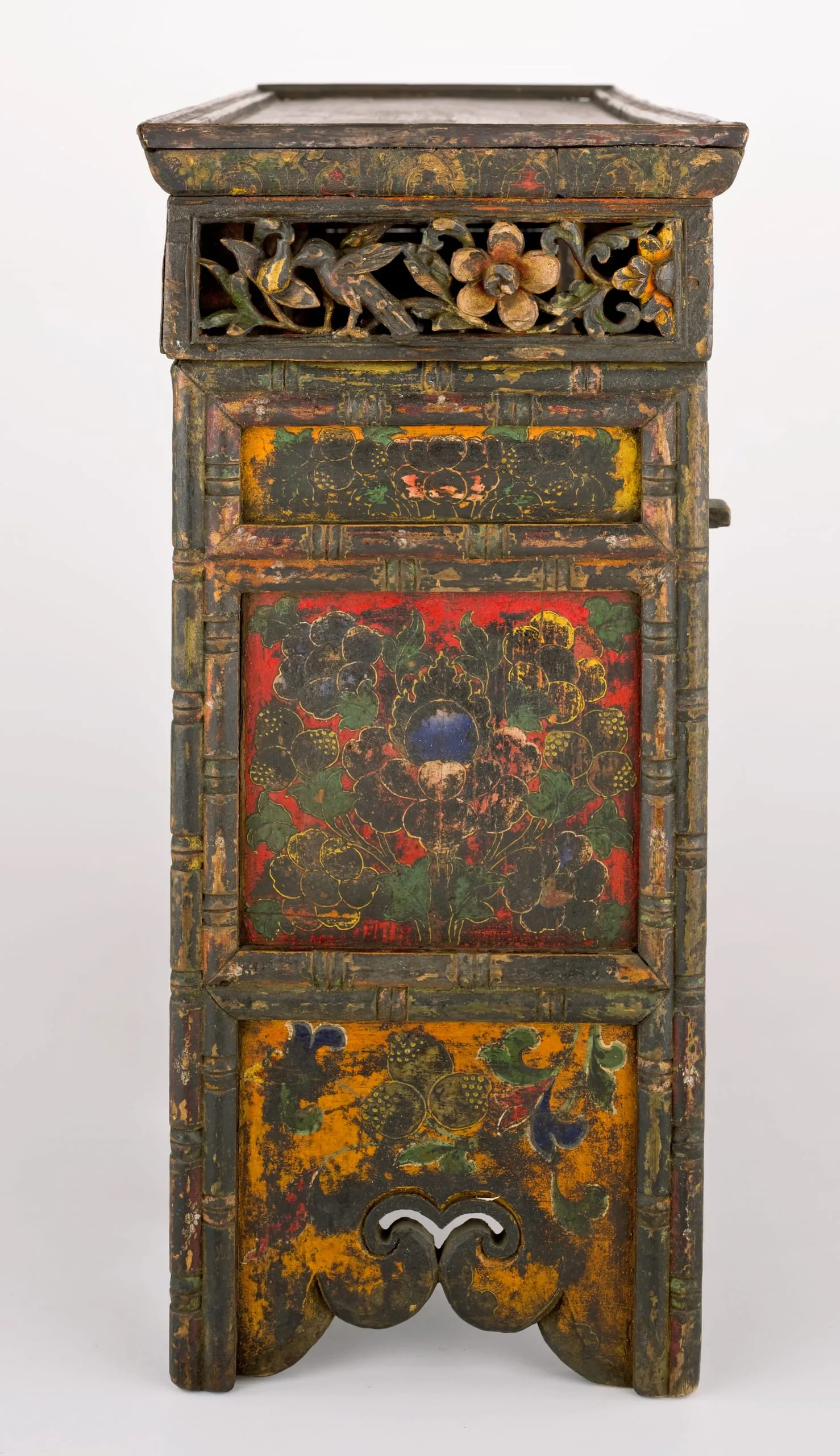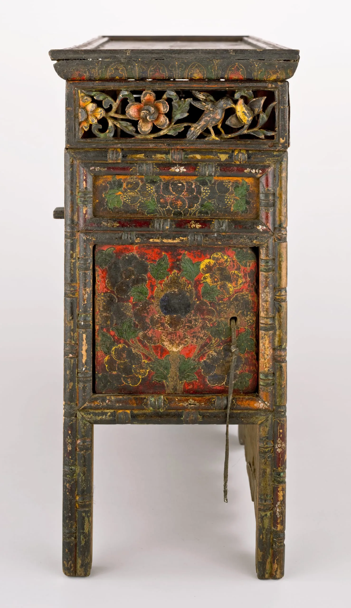 This is a medium height table, which suggests that it was originally used in front of an important lama’s throne in a monastery or in front of a nobleman’s raised seat in a domestic chapel. The openwork central panel ingeniously depicts the Eight Auspicious Symbols of Buddhism by combining seven small symbols to create the larger eighth symbol, the vase. The flanking front panels each depict birds amidst foliage. In the top panel two deer flank the Buddhist Wheel of the Law, representing Buddha Shakyamuni’s First Sermon in the Deer Park at Sarnath, India. The table’s bottom apron is carved in a cloud pattern and adorned with the face of a mythical animal, the zipac, which is an apotropaic symbol resembling the Indian "Face of Glory" (kirttimukha). The upper end panels are also openwork with a bird on a flowering vine. The lower end panels are painted with four motifs and a precious jewel. The proper right lower panel is also a door to access the table’s interior shelving. On the rear of the table is a sliding door.