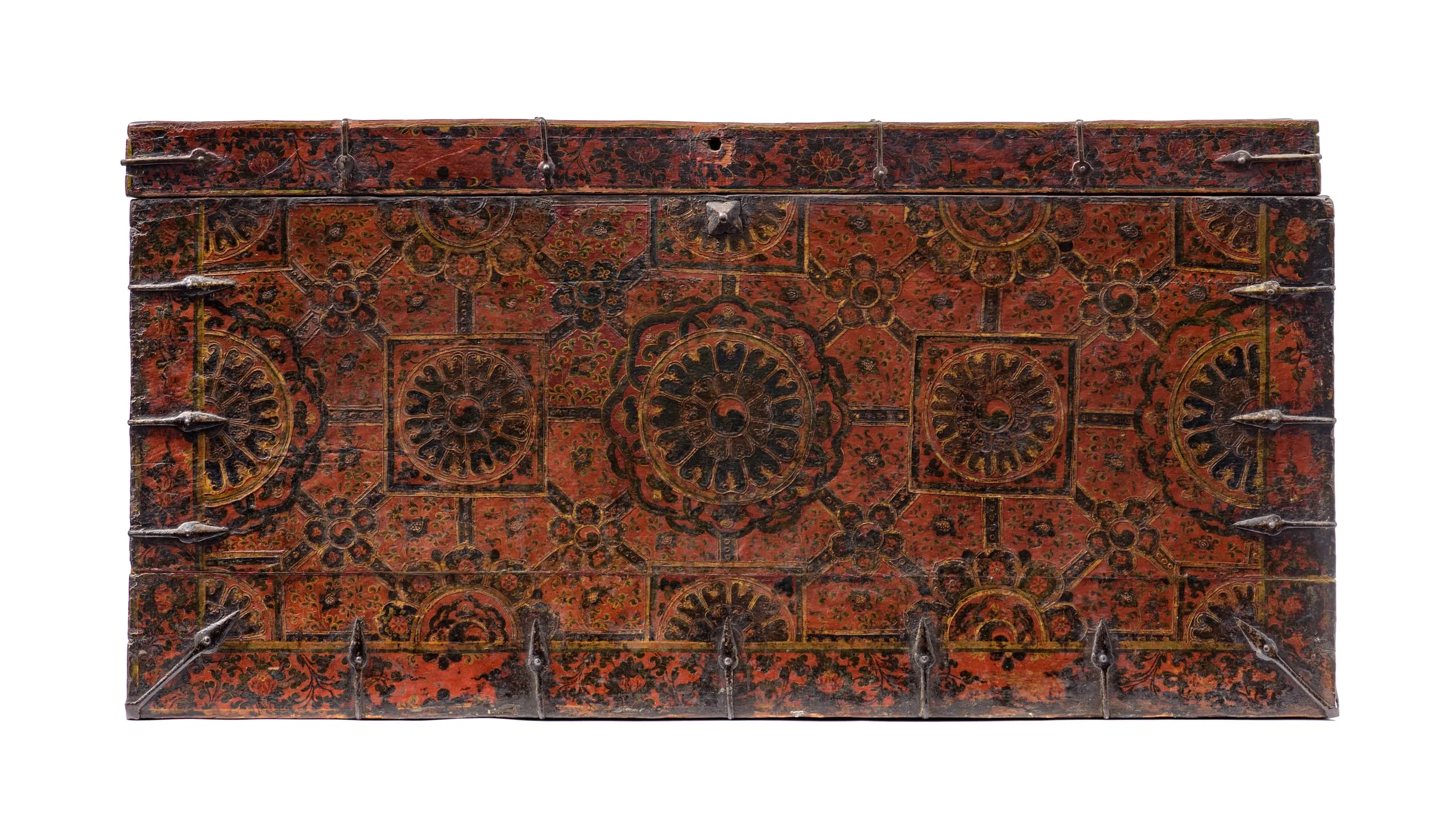 The painted decoration on the exterior of Tibetan furniture is often determined by the intended function of the particular piece of furniture. For example, the painted renditions of intricate textile designs found on some trunks suggests that they were used to store luxury textiles imported from China, India, and Europe. One of the most important textile designs is a latticework motif called kati rimo (brocade), which can be traced back to the Mongol culture of the Yuan Dynasty in China (1279-1368) and even earlier in the western Islamic world. This exquisite trunk is embellished with painted kati rimo designs on the front. It has been fitted with reinforcement metal fittings and a now-incomplete locking hasp. See also M.2006.156.1, M.2006.156.3a-b, and M.2013.183.2. The kati rimo design on this trunk differs from that on M.2006.156.1 in that the proportions and color palette differ.