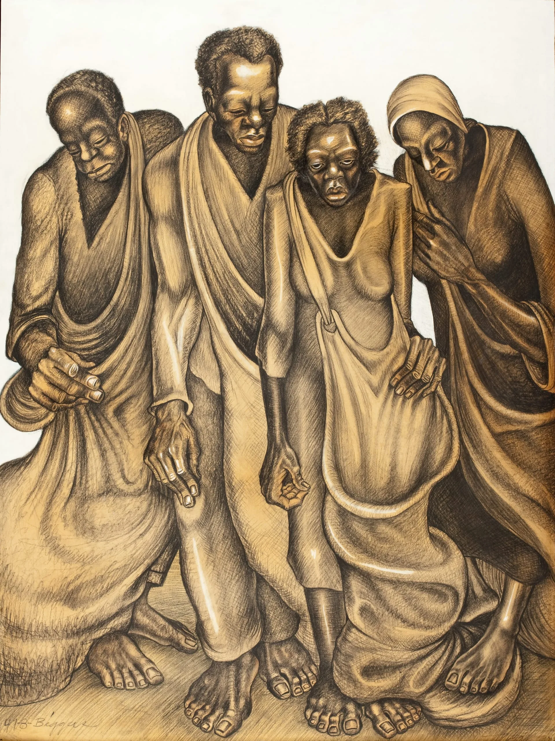 John Biggers translated the heritage of African life into American art, the essence of his long career in the South. Biggers was born in 1924 in Gastonia, North Carolina into a large family that made education their highest priority. In 1937, Biggers's mother enrolled him in Lincoln Academy, a private boarding school for African American children in Kings Mountain, North Carolina. There Biggers was taught by a former missionary to West Africa, who encouraged the students to embrace African heritage.