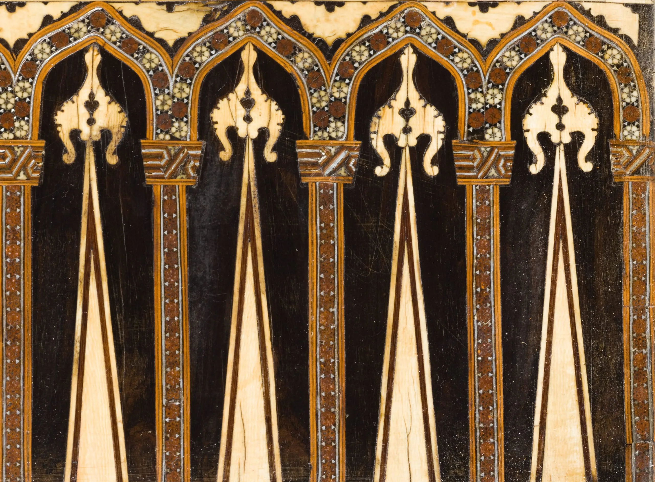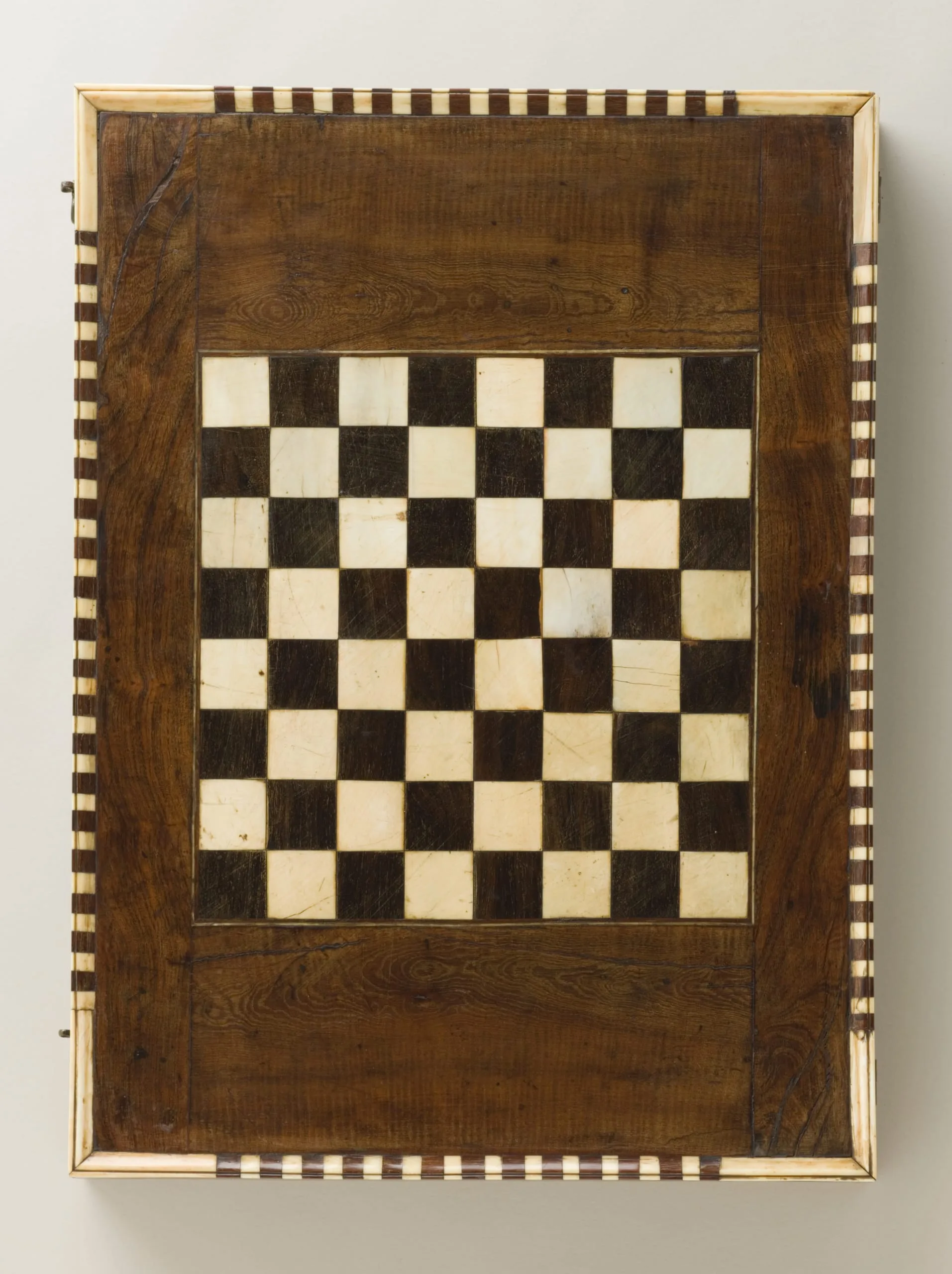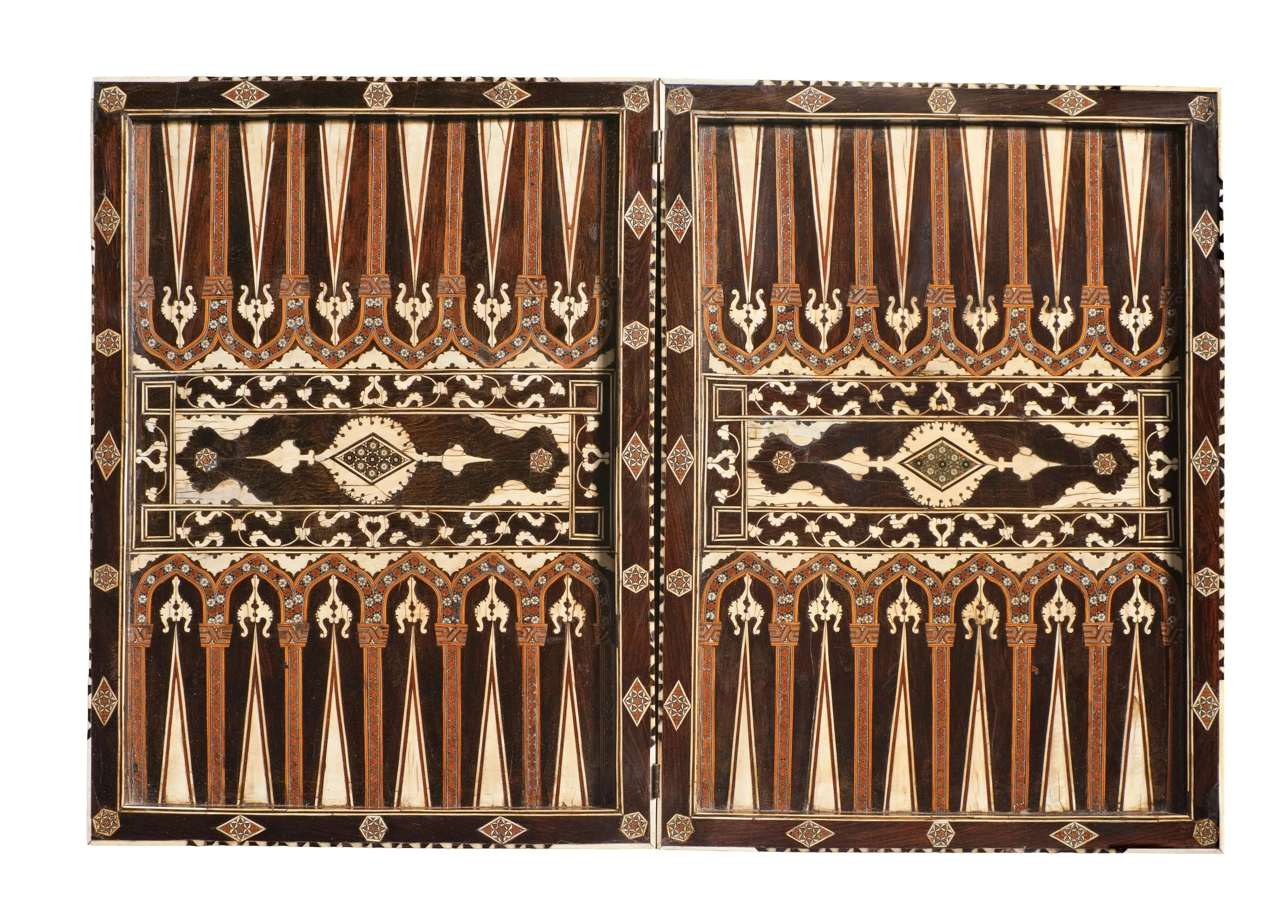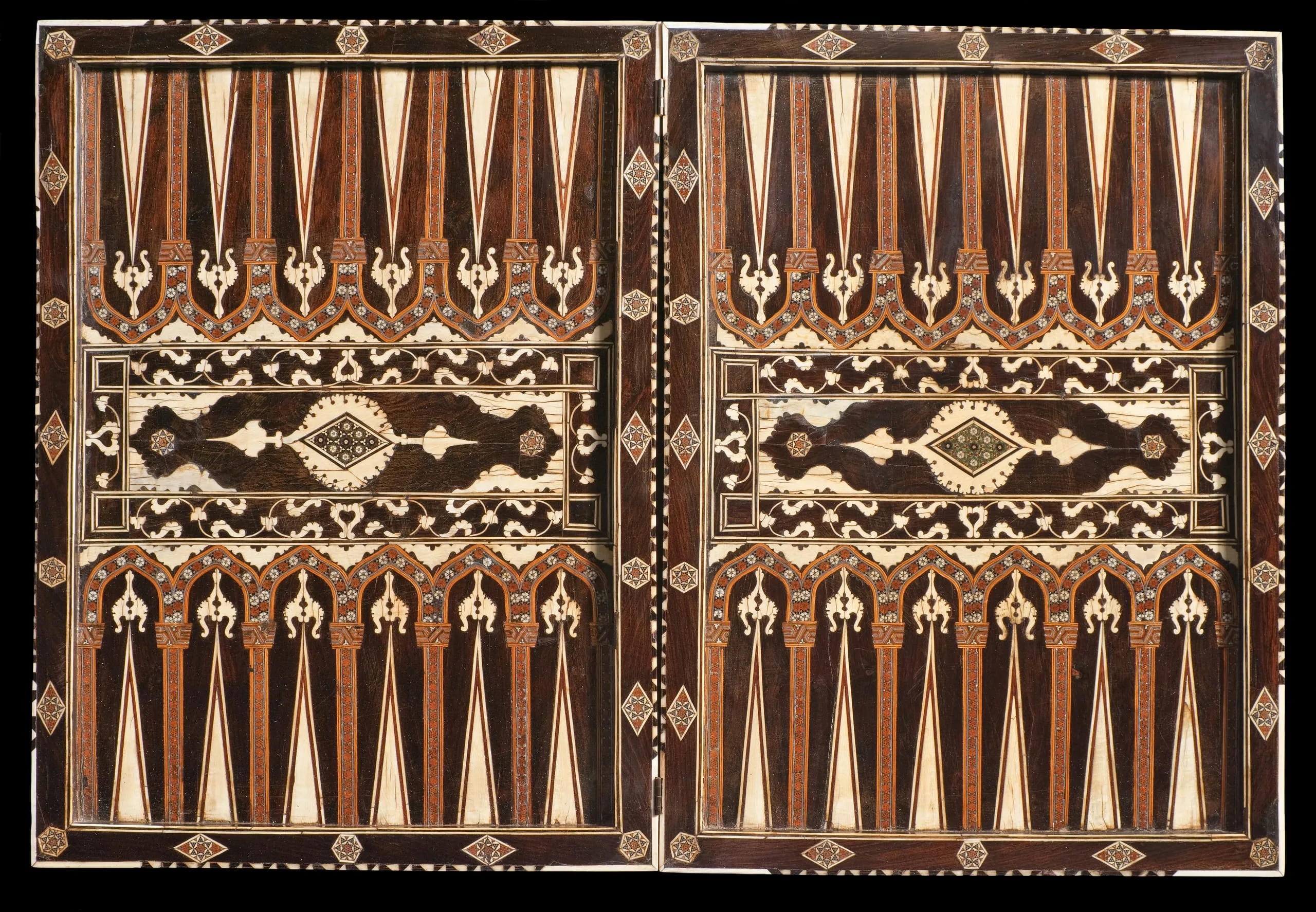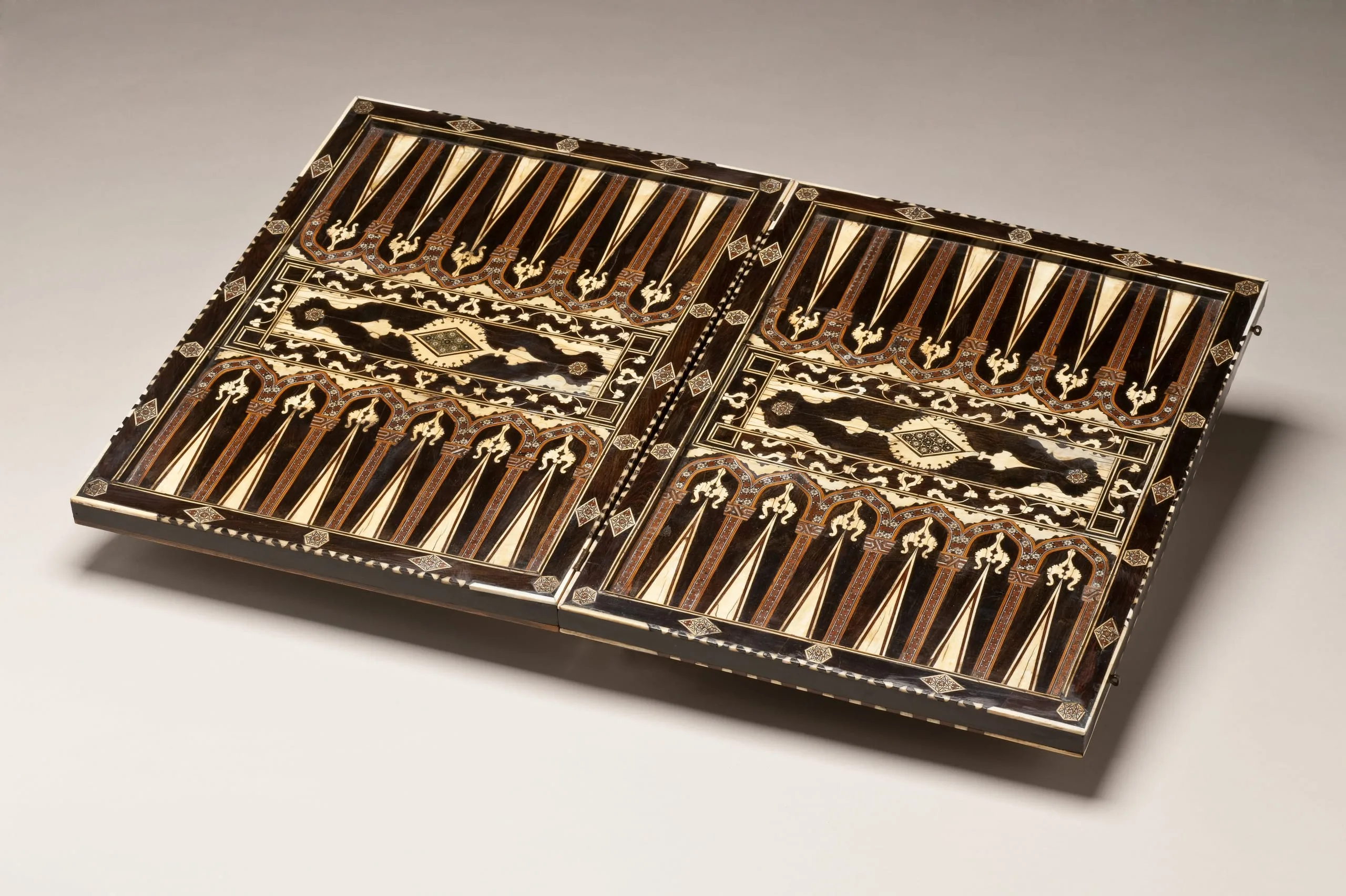Luxury wooden objects—furniture and furnishings as well as architectural fittings inlaid with precious materials such as ivory, ebony, silver, gold, mother-of-pearl, and tortoiseshell—were produced in limited quantities for the Ottoman court beginning in the early sixteenth century. This rare and spectacular games board provides a wonderful example of this medium. When open, it offers a backgammon board rendered in ivory and ebony inlays with details of silver and tiny mosaics; when closed, it provides two more gaming opportunities, including an ivory- and ebony-inlaid chessboard.