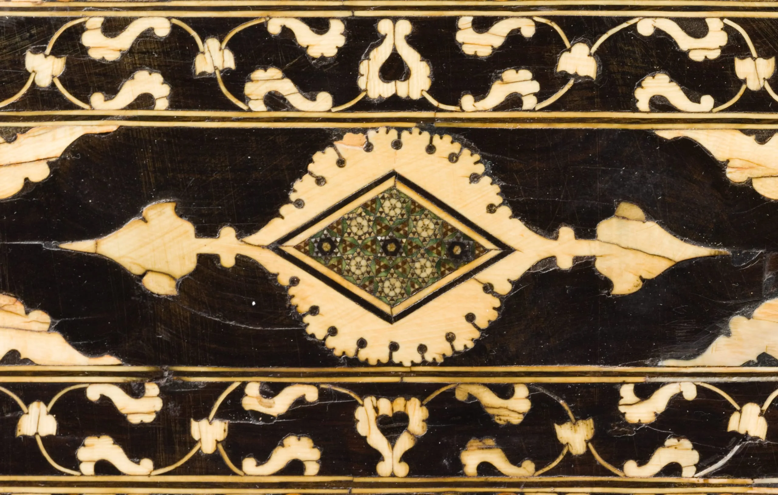- Wood inlaid with ebony, ivory, micromosaic and silver