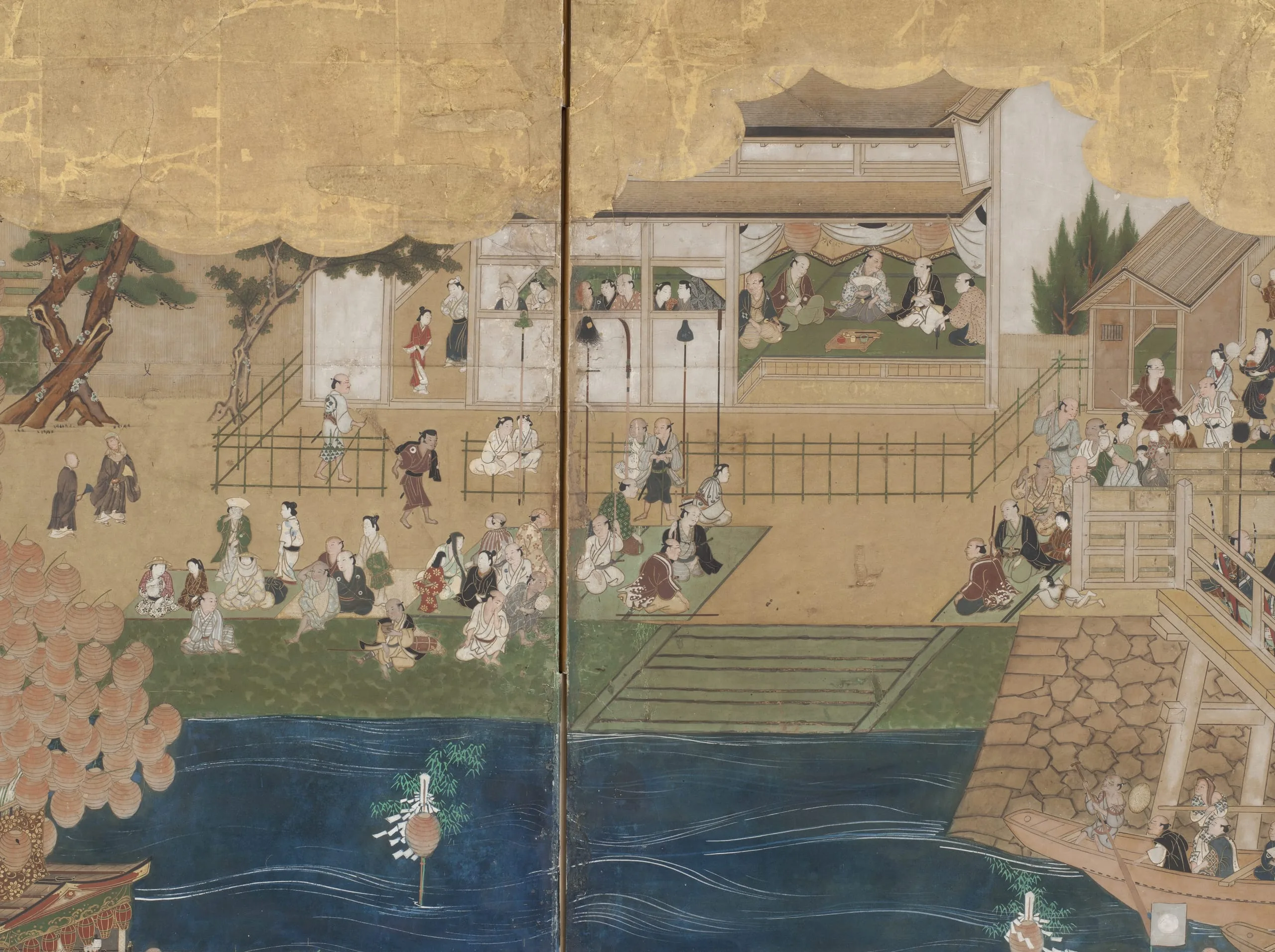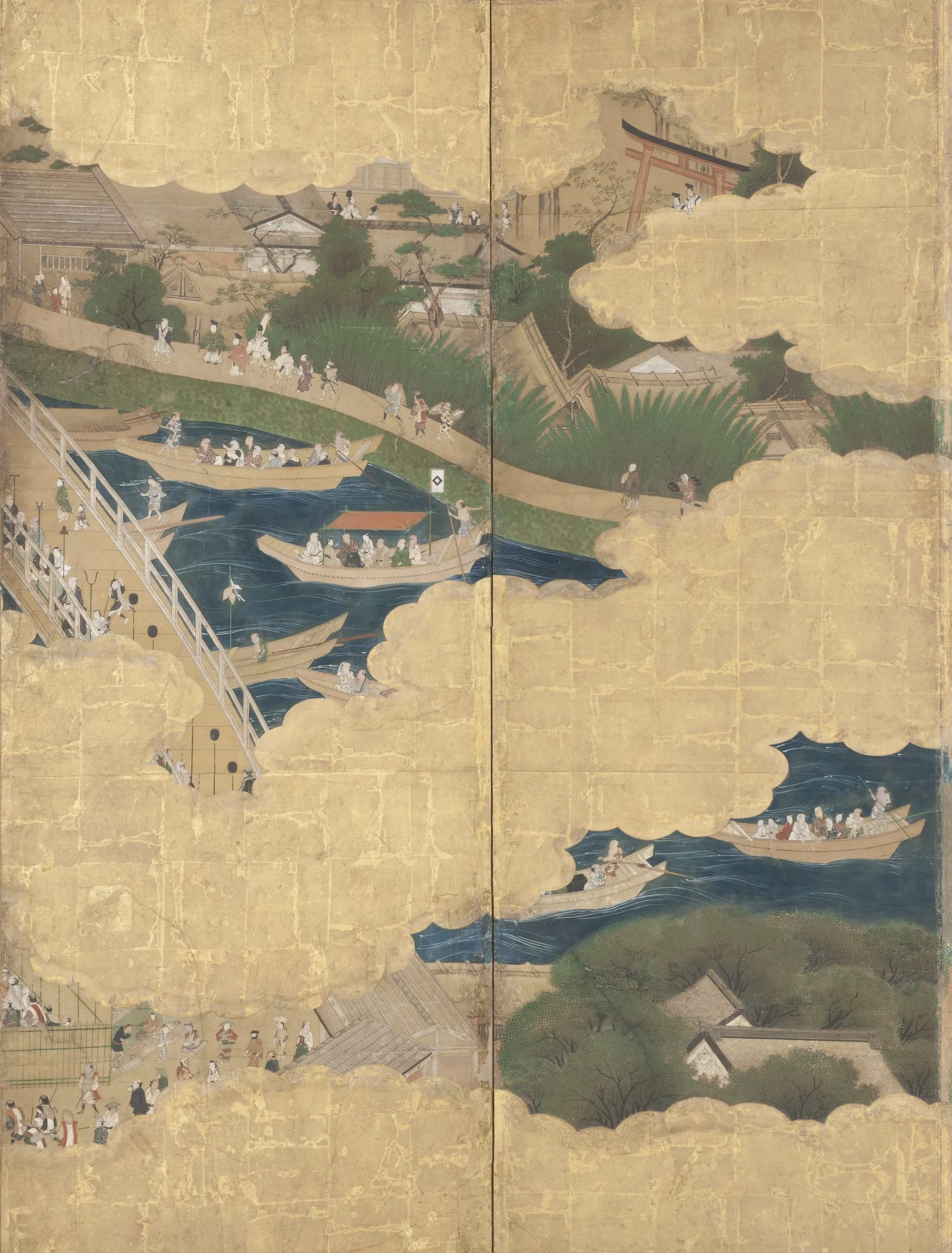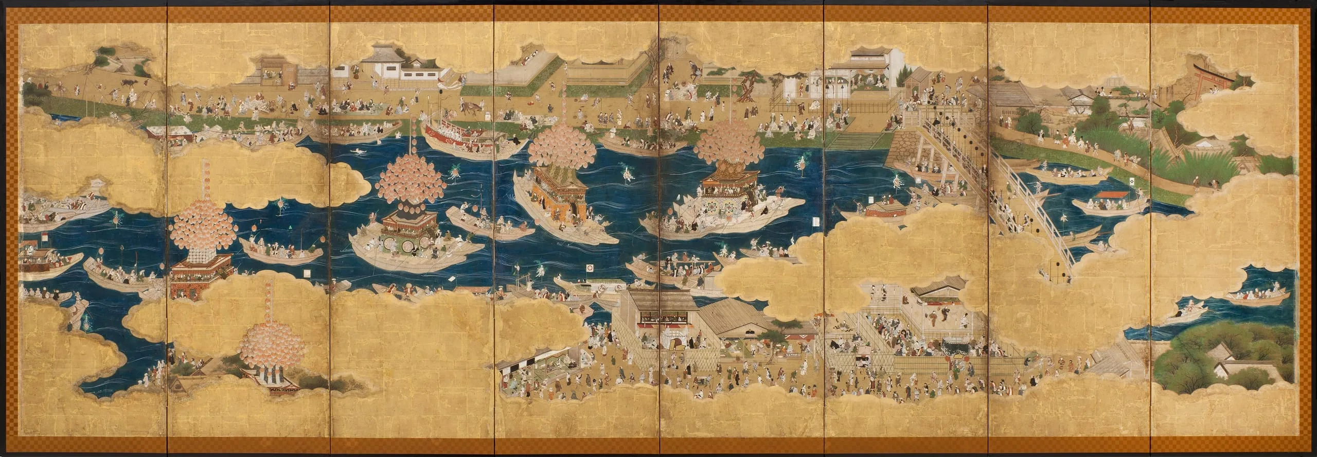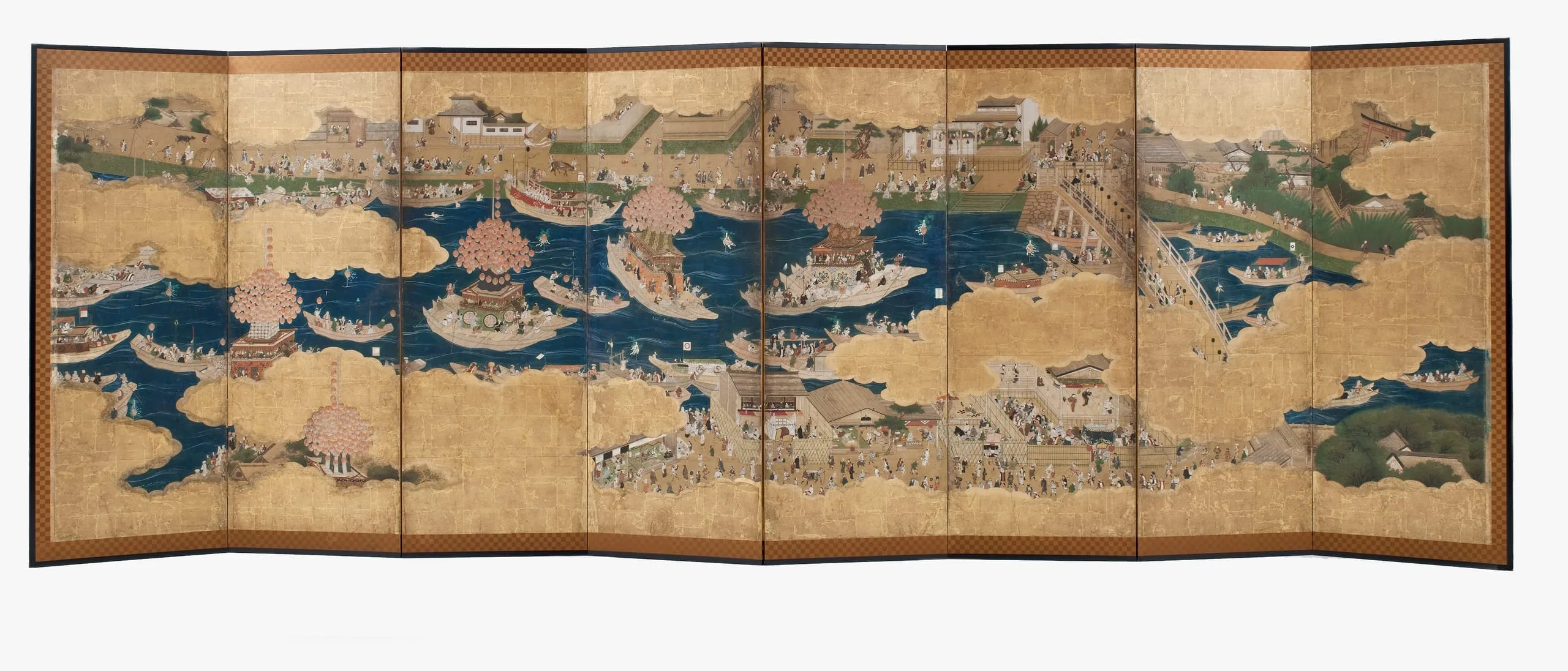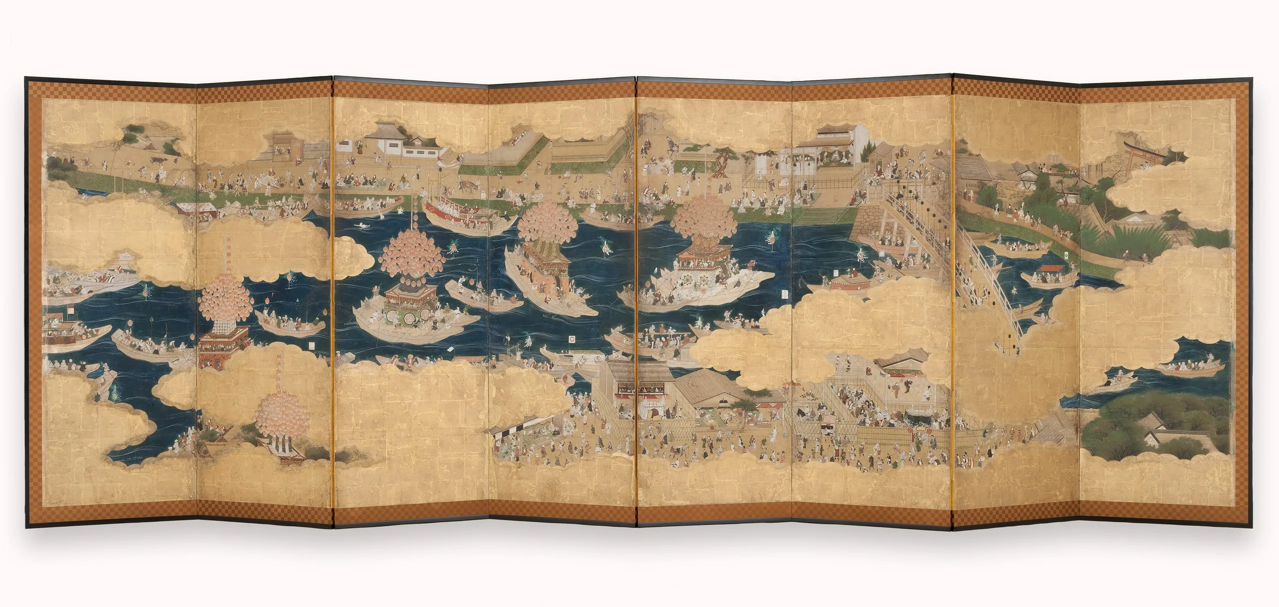 - Eight panel screen; ink, color, gold, and gold leaf on paper