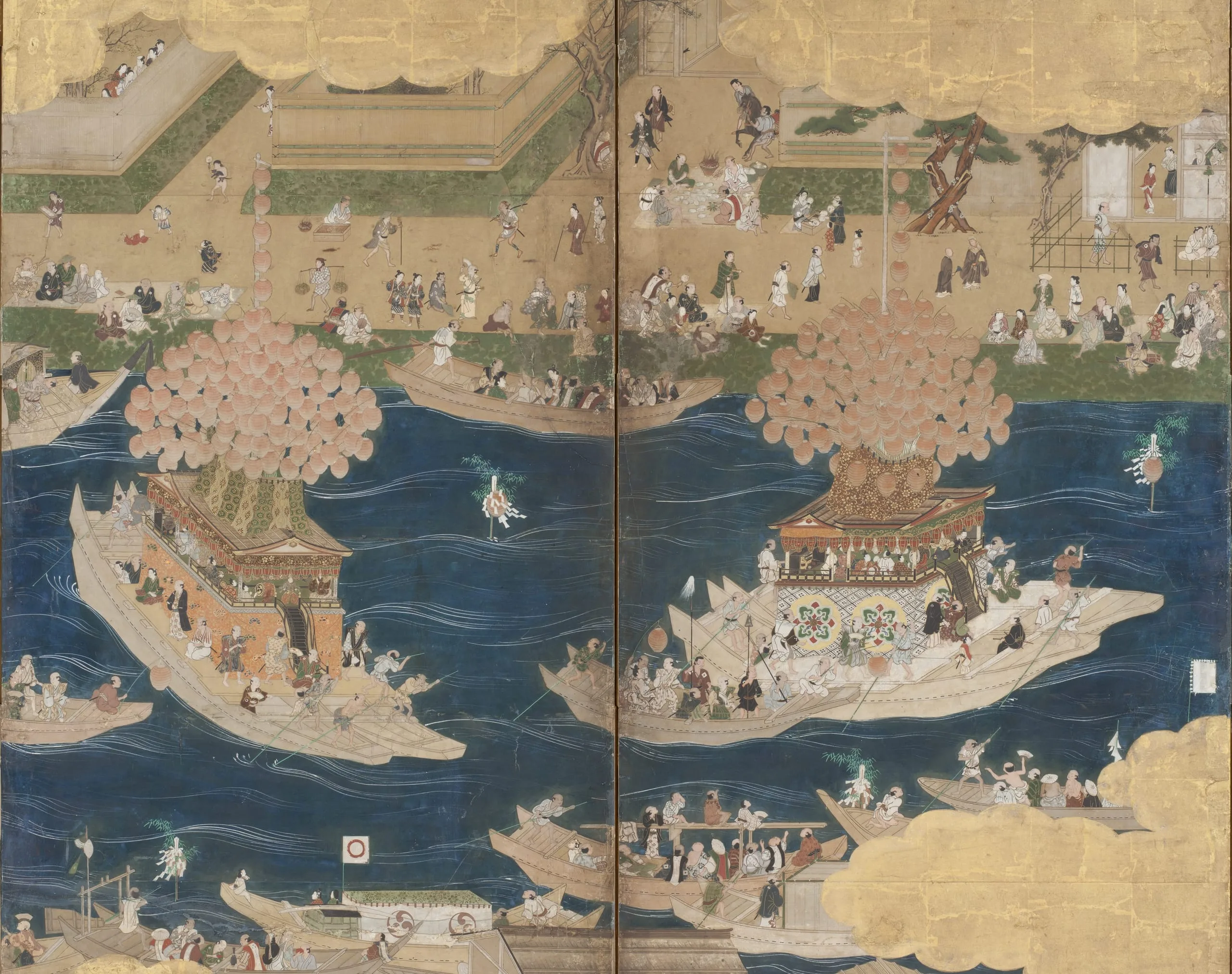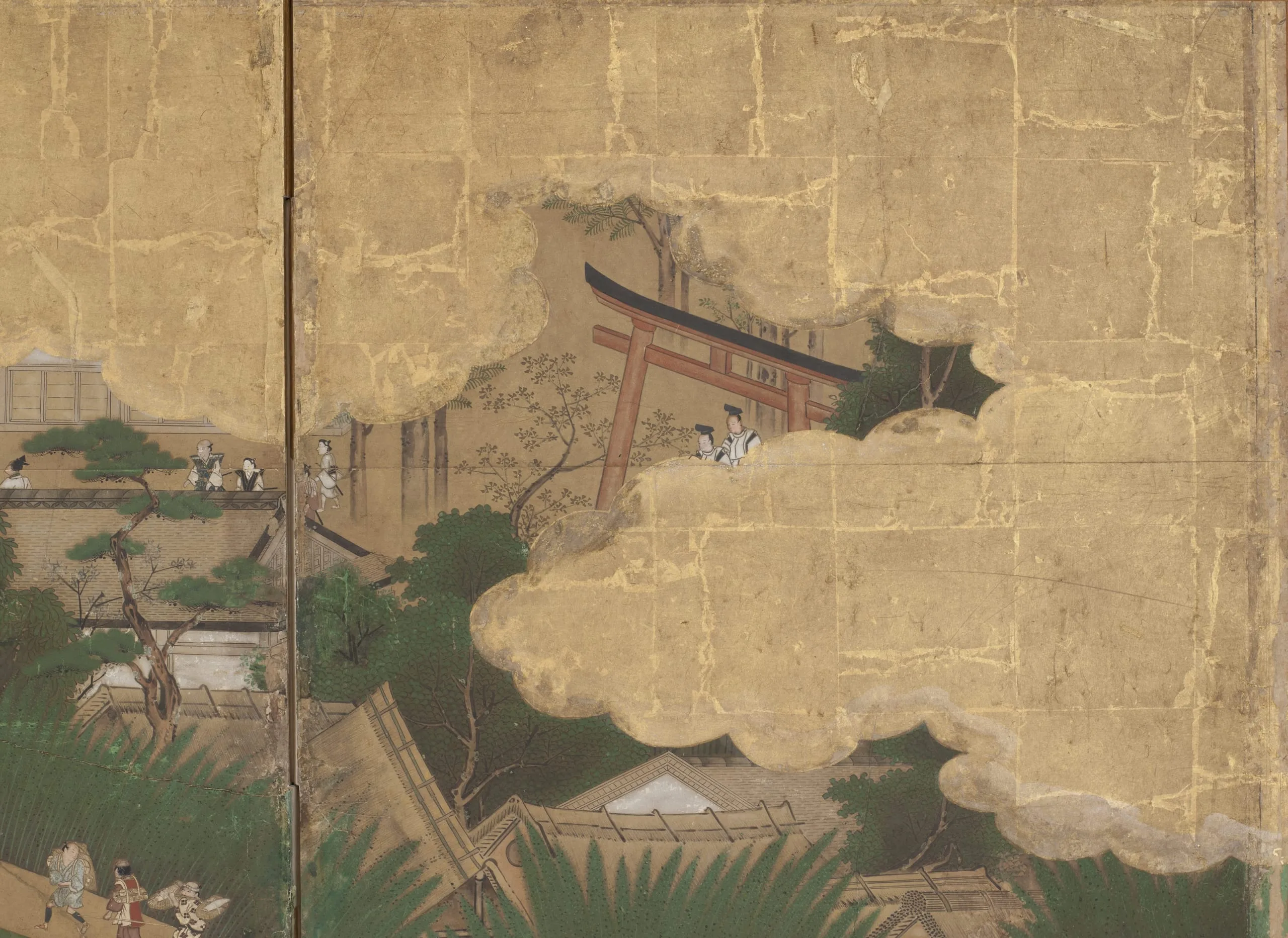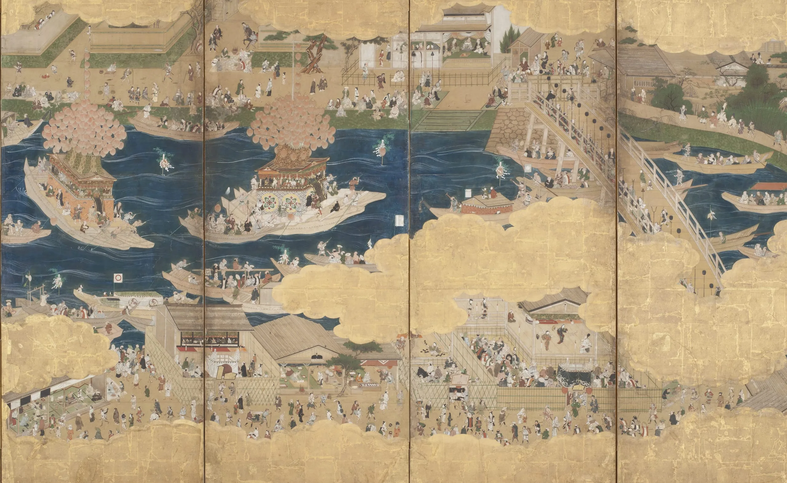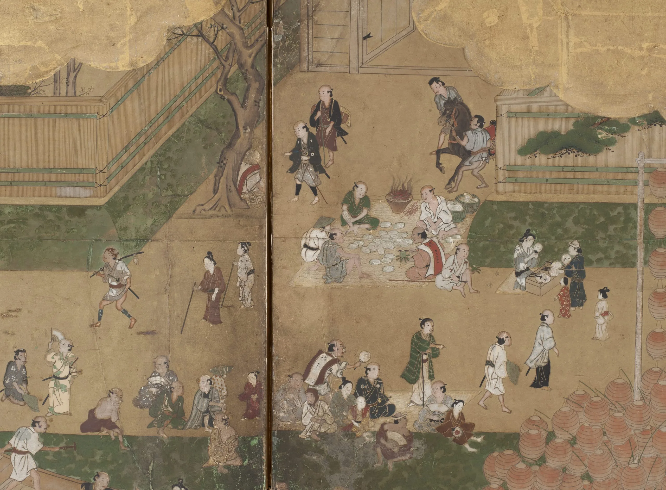 - Eight panel screen; ink, color, gold, and gold leaf on paper