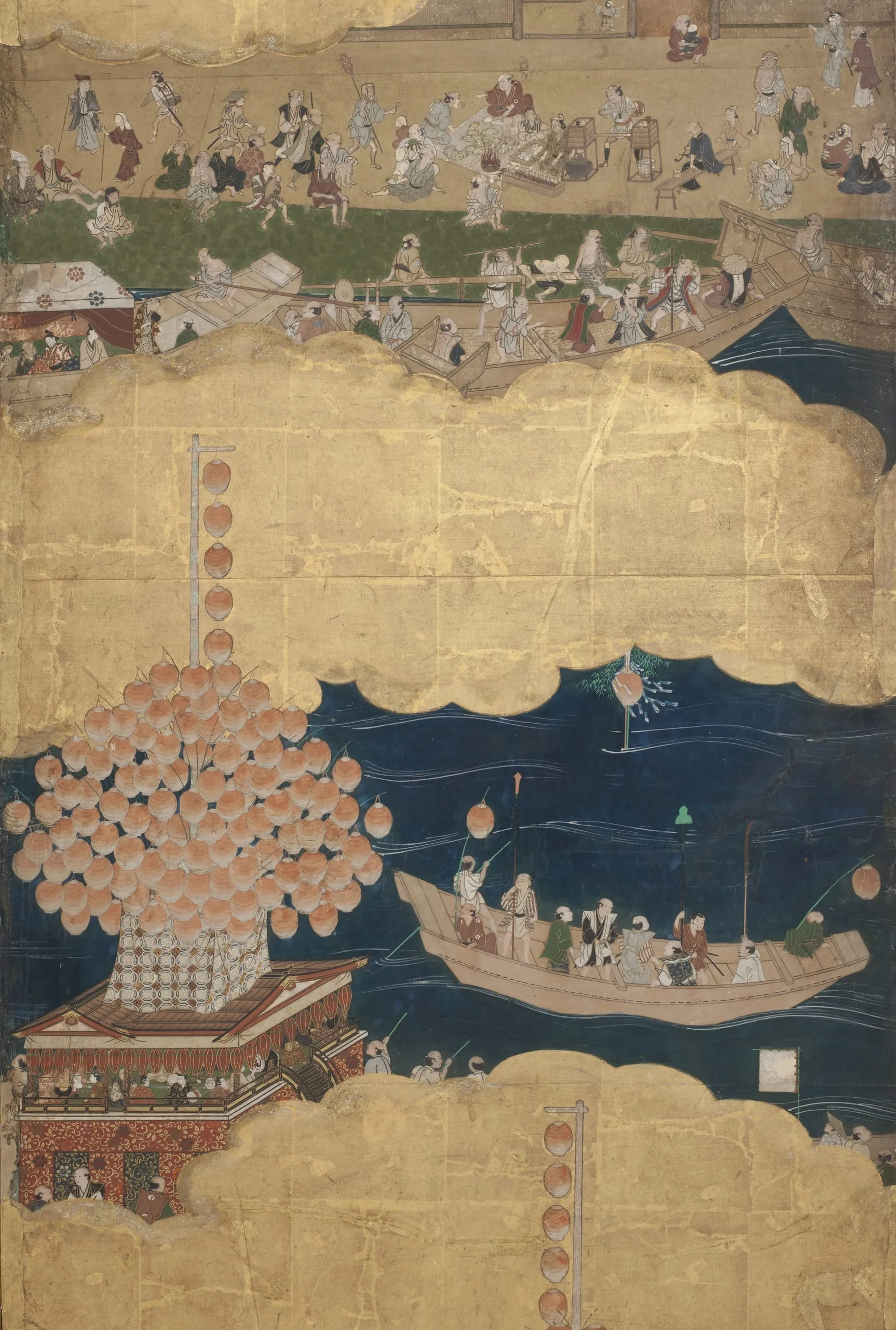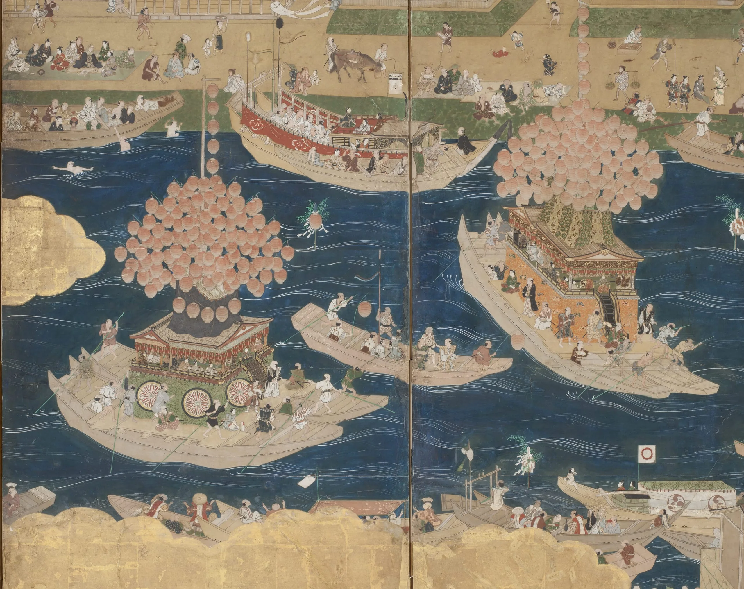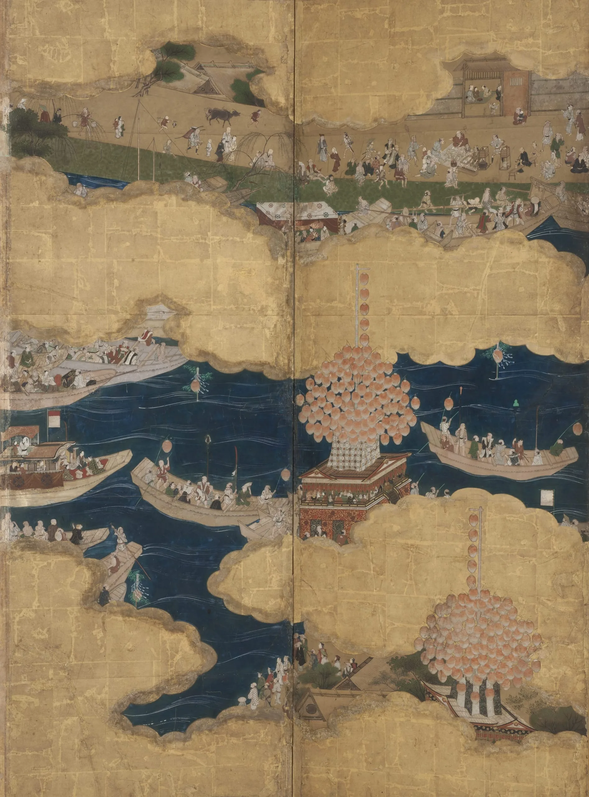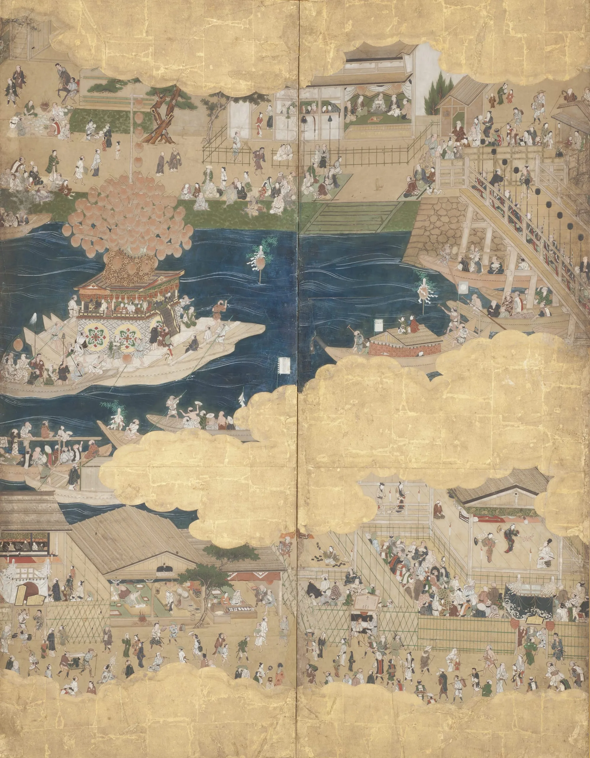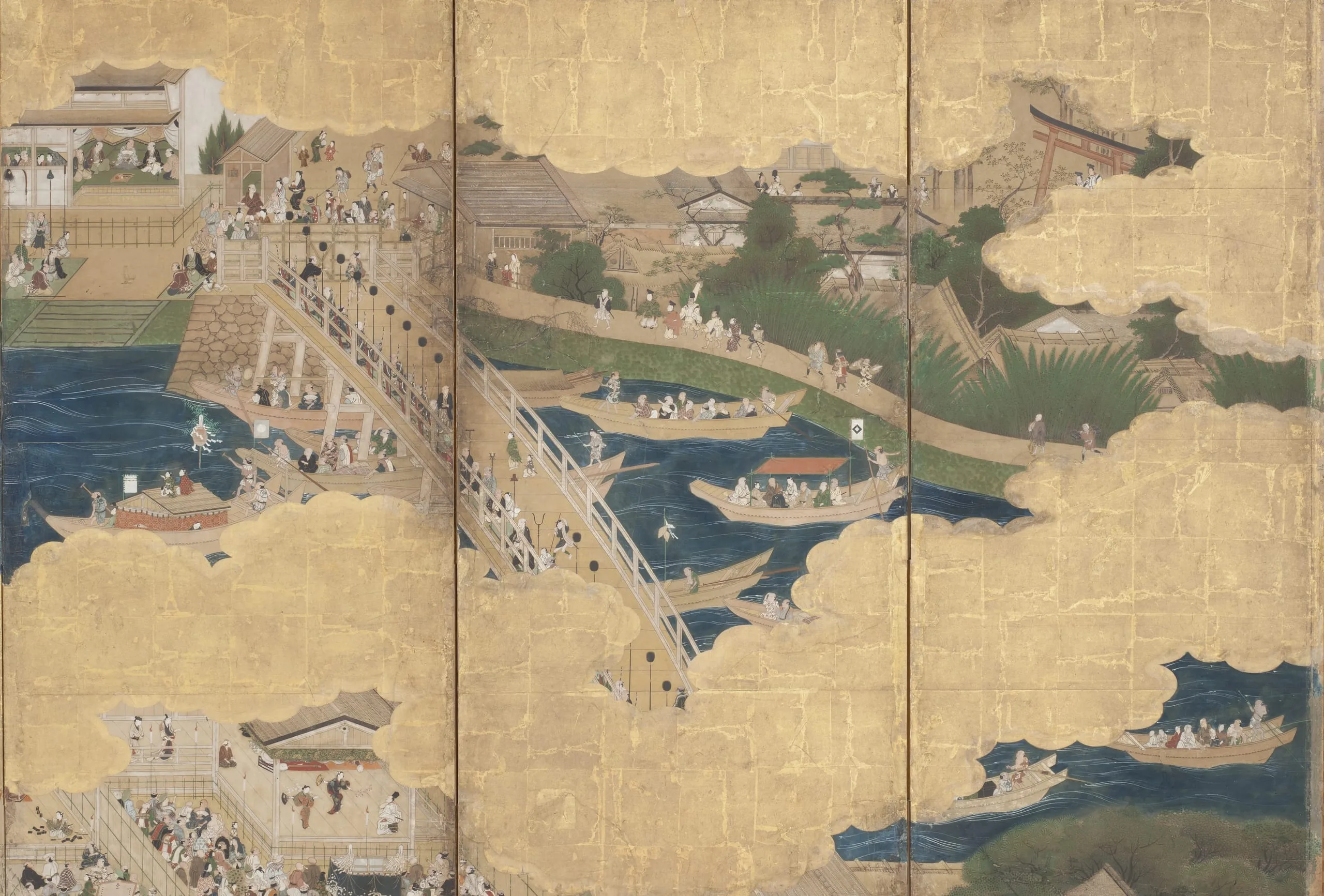 - Eight panel screen; ink, color, gold, and gold leaf on paper
