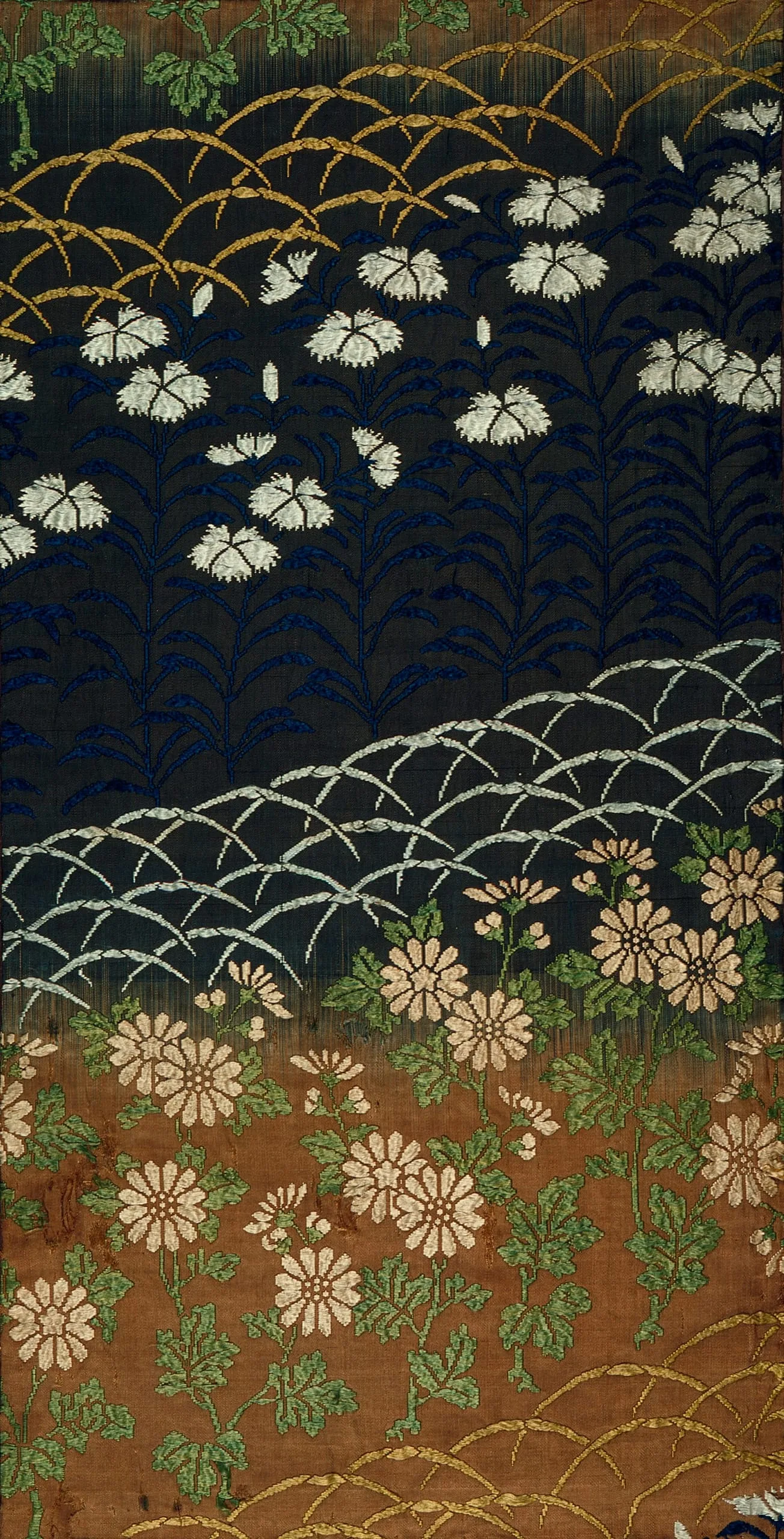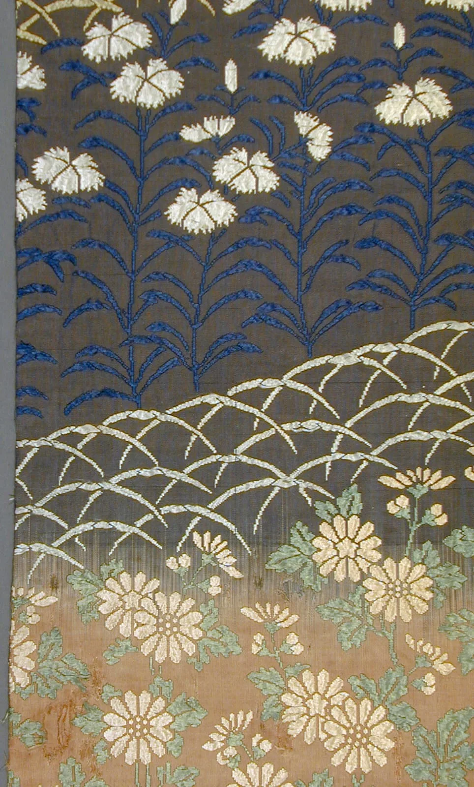 - Silk satin with silk supplementary-weft patterning bound in twill (lampas)