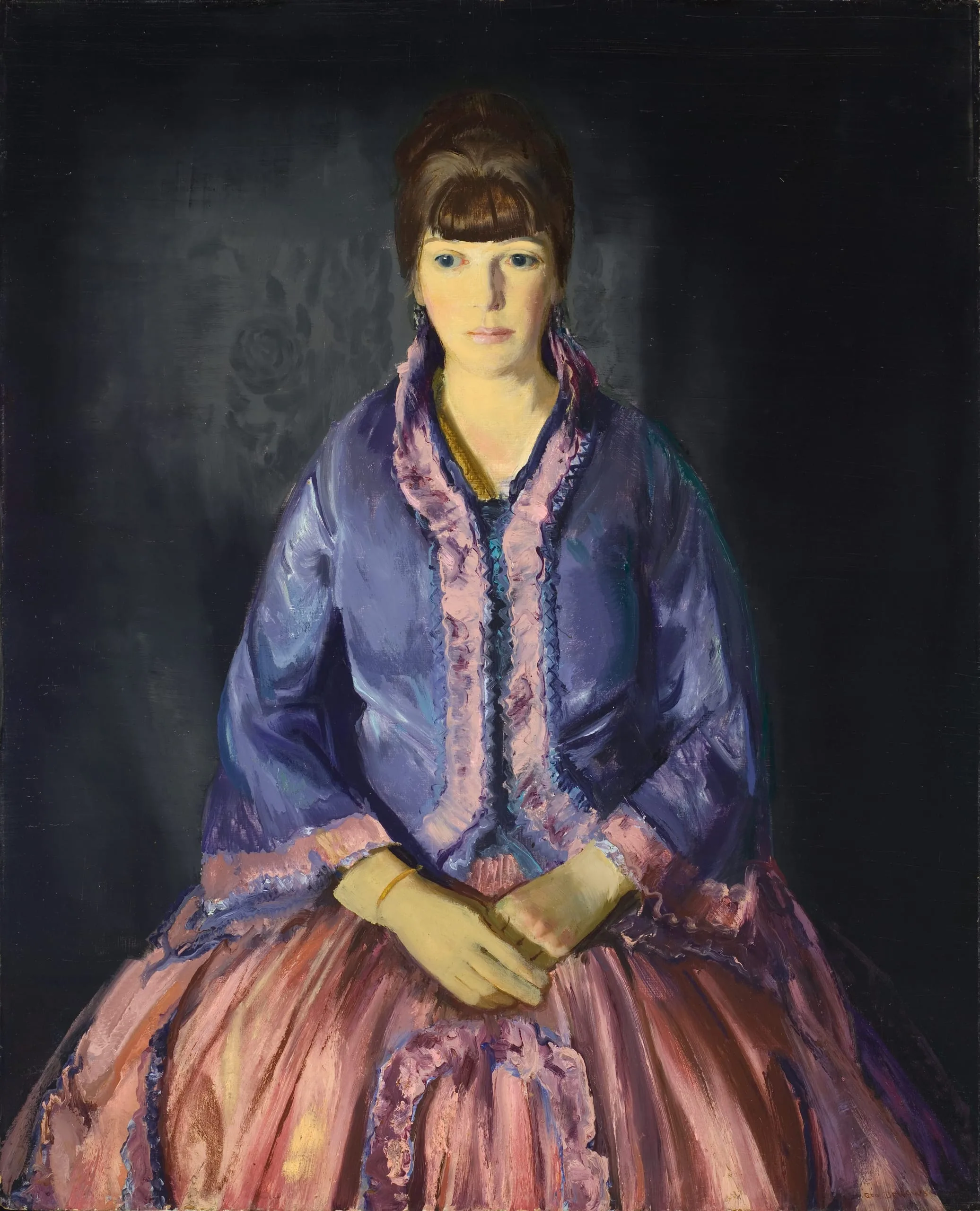 Emma in the Purple Dress points to a new direction in Bellowss art. His formal portraits of the 1920s reveal a new seriousness with their balanced and severely geometrical compositions and dramatic dark backgrounds, a seriousness that relates to the art of Thomas Eakins, whose 1917 retrospective at New Yorks Metropolitan Museum of Art greatly impressed Bellows. Like Eakins, Bellows began to focus more on the character and inner life of his sitters. The quiet intensity of Emma suggests a poignancy and a sense of the heroic and tragic. It is this mood that enabled Bellows to depart from the contemporaneity of a photograph and his earlier genre paintings to create timeless images such as Emma in the Purple Dress.