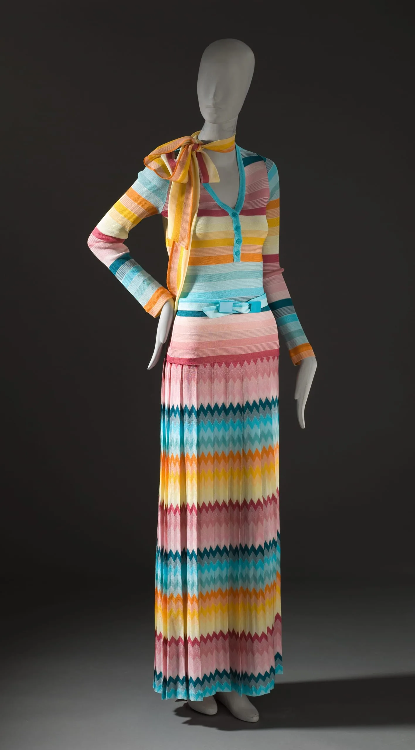 - Blouse, Rayon knit and plastic buttons; Skirt: Rayon knit; Belt: Rayon knit and plastic buckle