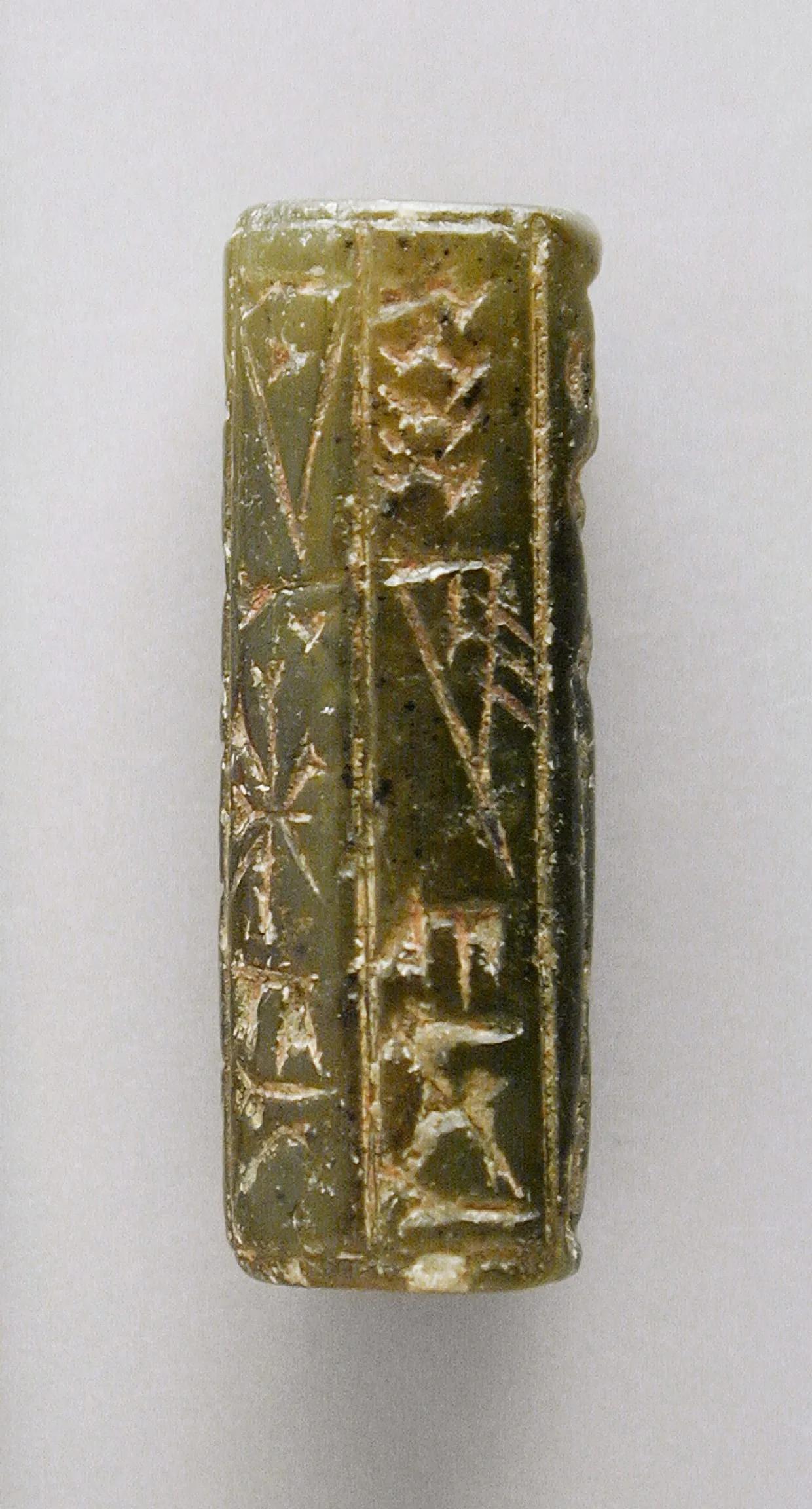 Small barrel-shaped cylinder seal in olive-green stone, incised with cuneiform script and geometric motifs, photographed at a slight angle