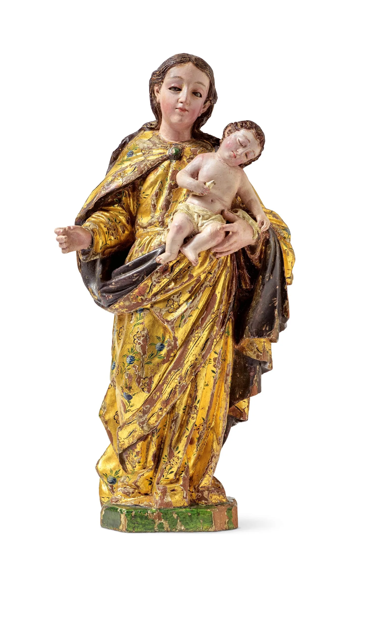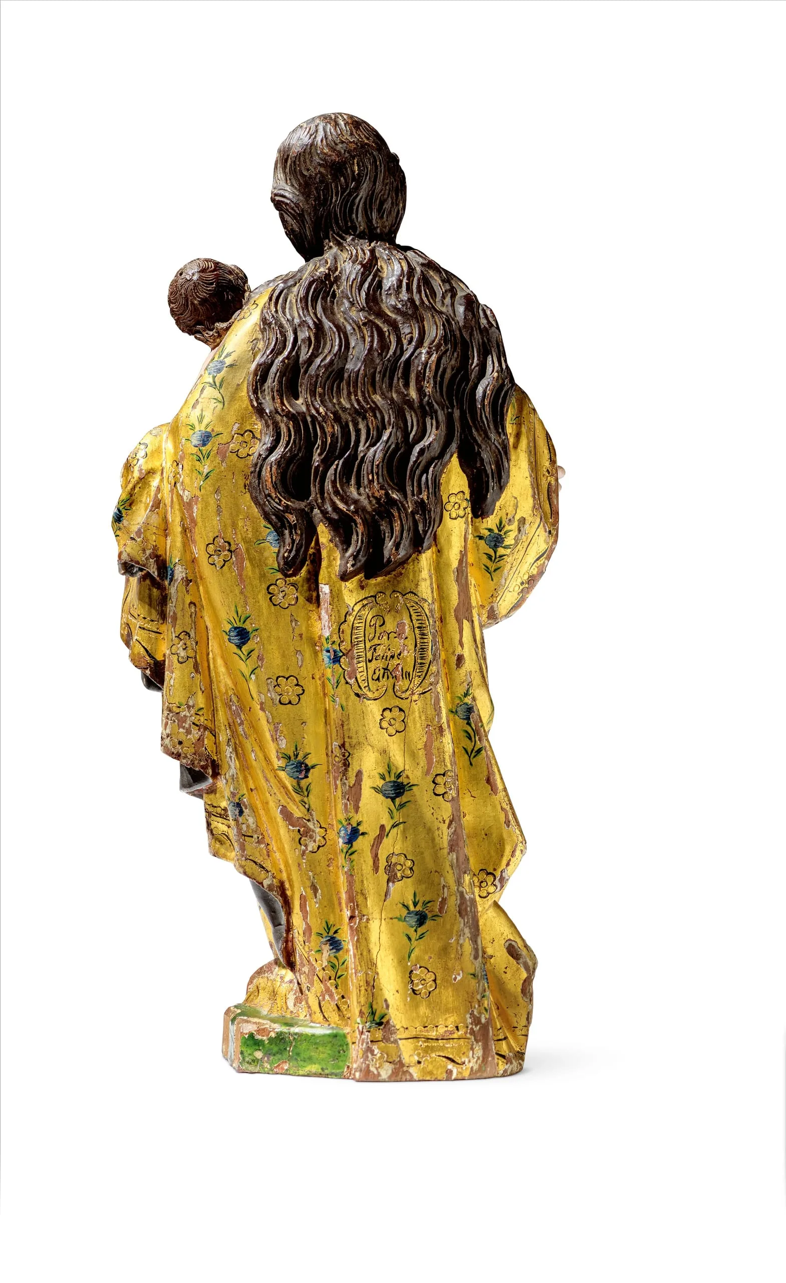 The devotion of Our Lady of the Rosary was introduced in Guatemala in the sixteenth century. A famed sculpture of the Virgin was venerated in the church of Santo Domingo in Antigua and later in Guatemala City, becoming an important reference for artists. This small image, designed for private devotion, is decorated with intricate estofados (pictorial emulations of fine fabrics). The signature on the back corresponds to the polychromer—a rare detail pointing to a pride in craft.
