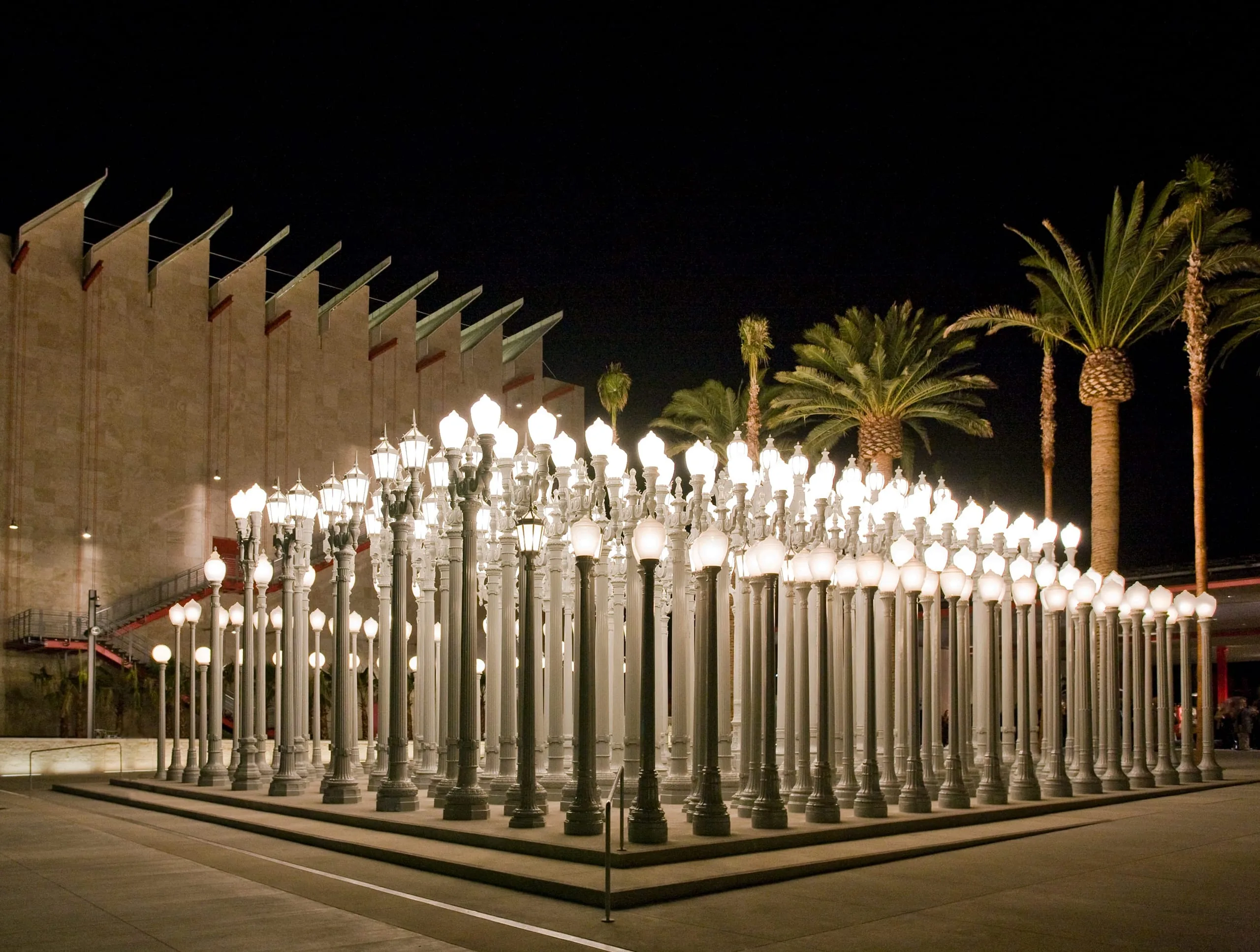 This forest of city street lights, called Urban Light was created by artist Chris Burden. Despite initial appearances, the arrangement is not a perfect grid. Depending on where the viewer stands, the lamps arrange themselves in different angles and arrays.