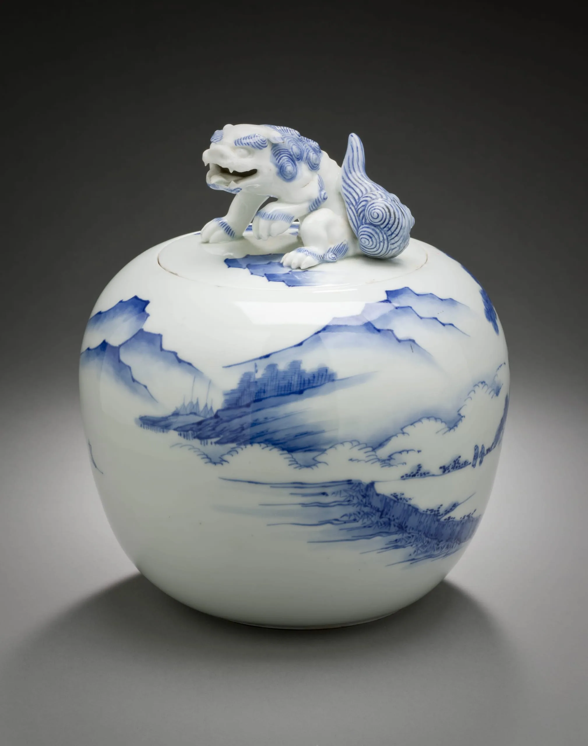 - Tea Ceremony Water Jar (Mizusashi) with Landscape; Chinese Lion Knop