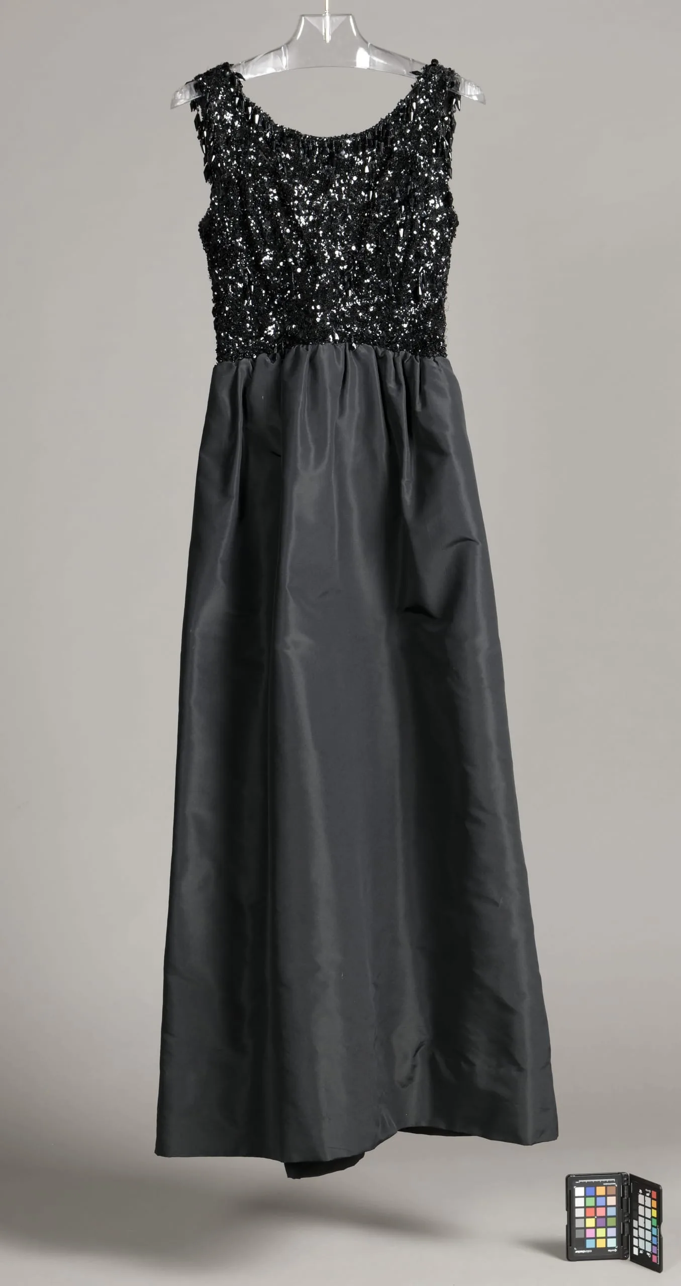 - Silk plain weave (faille), with plastic sequins, and glass and plastic beads,