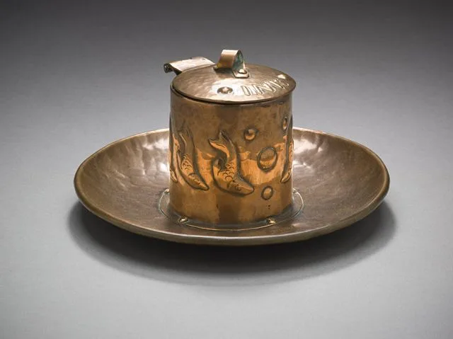 - a) Inkwell height: 2 5/8 in. (6.67 cm); a) Inkwell diameter at base: 5 1/2 in. (13.97 cm); b) Glass insert height: 1 1/4 in. (3.18 cm); b) Glass insert diameter: 1 5/8 in. (4.13 cm)
