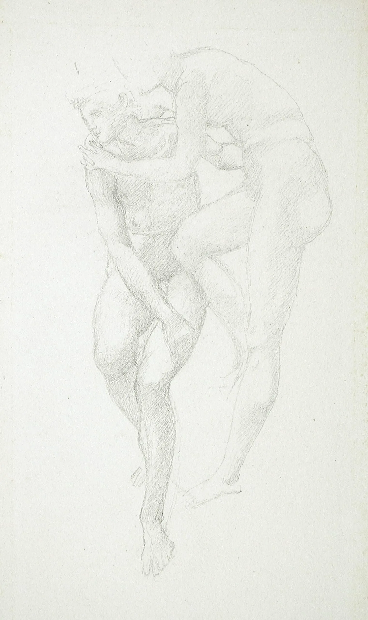 Pencil drawing on off-white paper of two intertwined nude male figures, rendered with soft hatching strokes and loose, sketchy lines