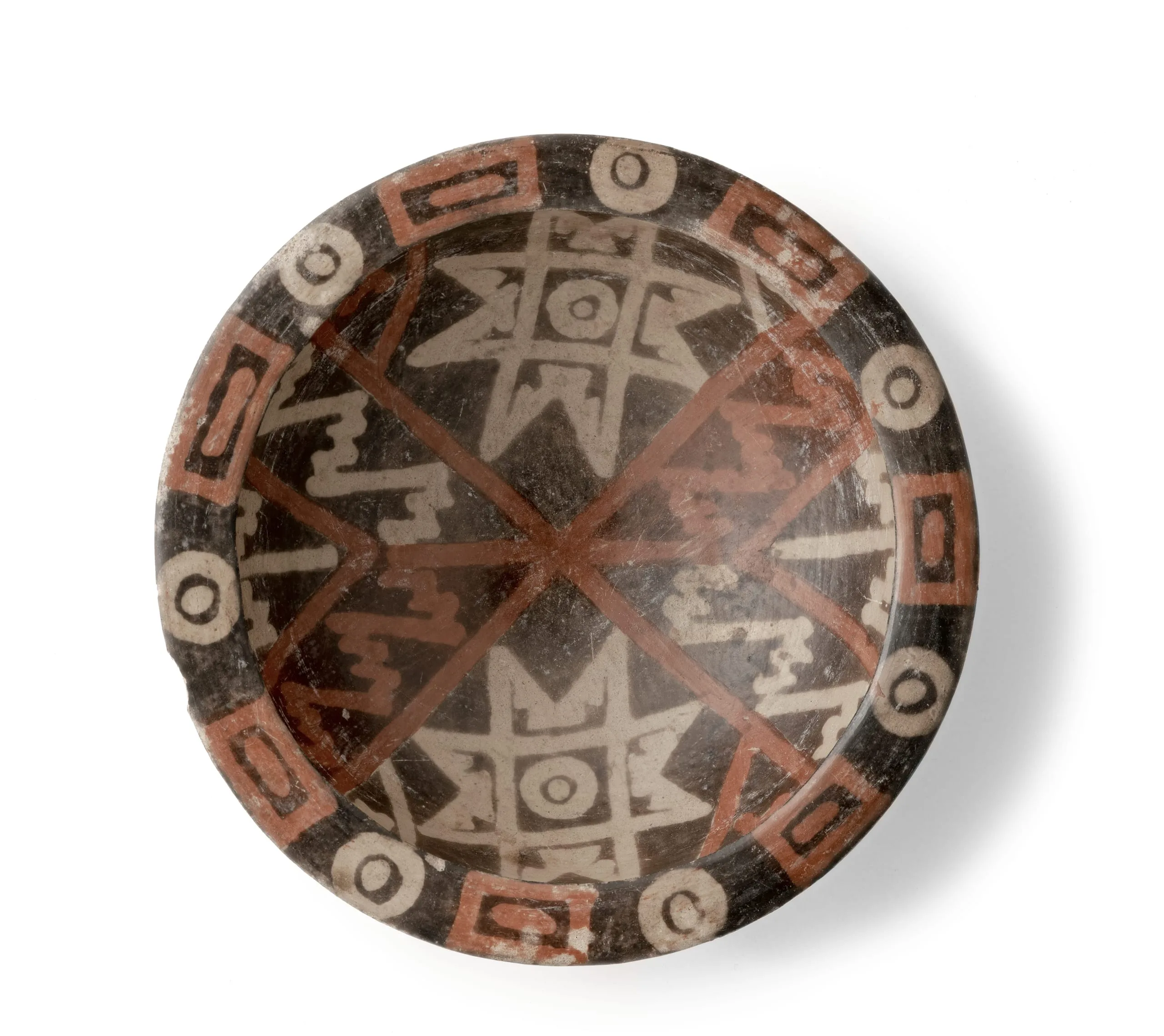 - Black, red, and cream resist-painted ceramic