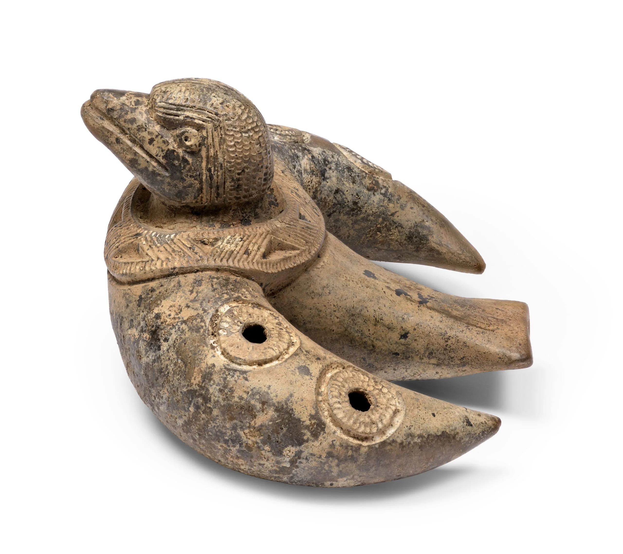 Ceramic object with two nested crescent forms and a small sculptural bird or animal figure on top, unglazed sandy clay with mottled gray-brown surface and incised decoration