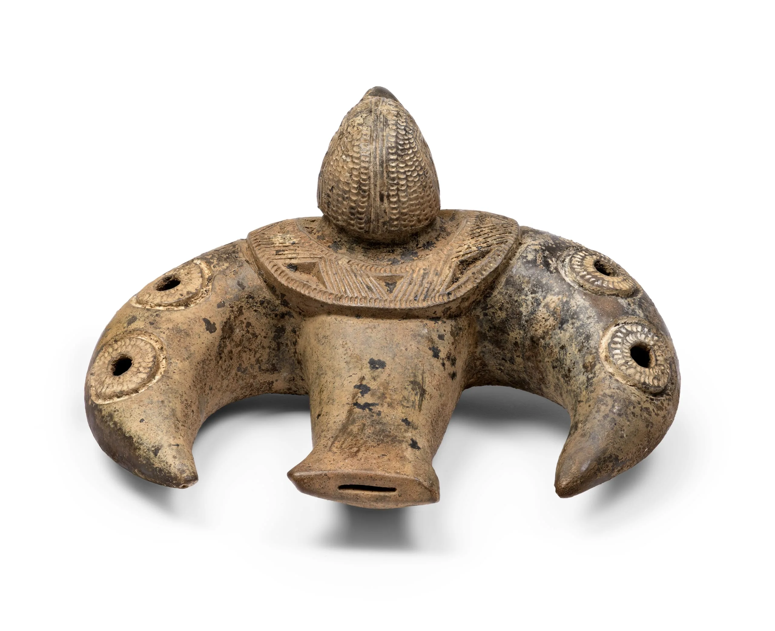 Ceramic vessel with a symmetrical crescent-shaped body flanked by two curved lobes, each decorated with concentric incised circles. A textured, scaled finial rises from the center top above a collar with incised geometric patterns. A small slot opening at the front center; warm tan and gray earthenware surface with mottled aging.
