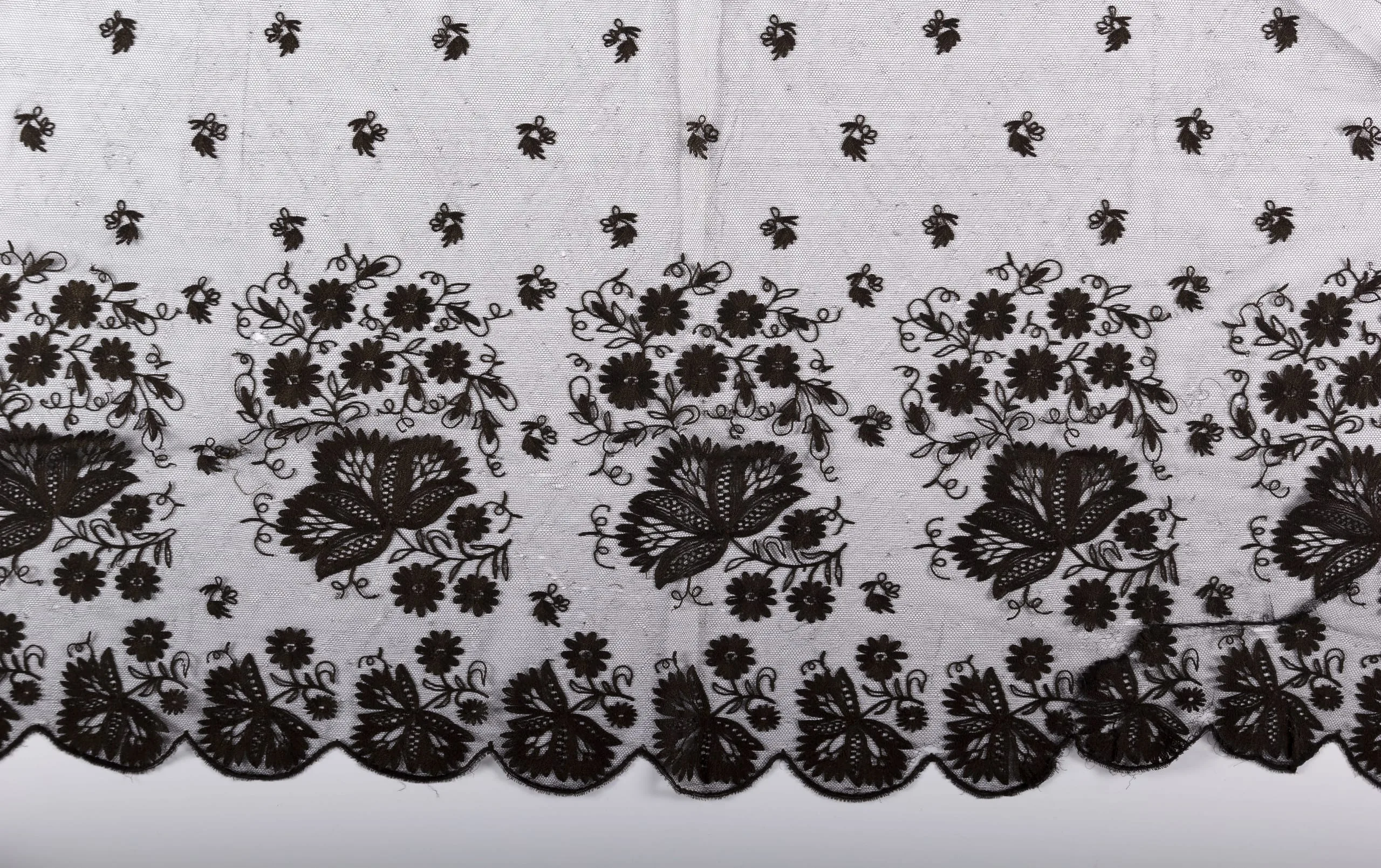 Textile fragment with black embroidery on white fabric, featuring three horizontal zones of floral motifs and a scalloped lower border with cutwork carnation-like flowers
