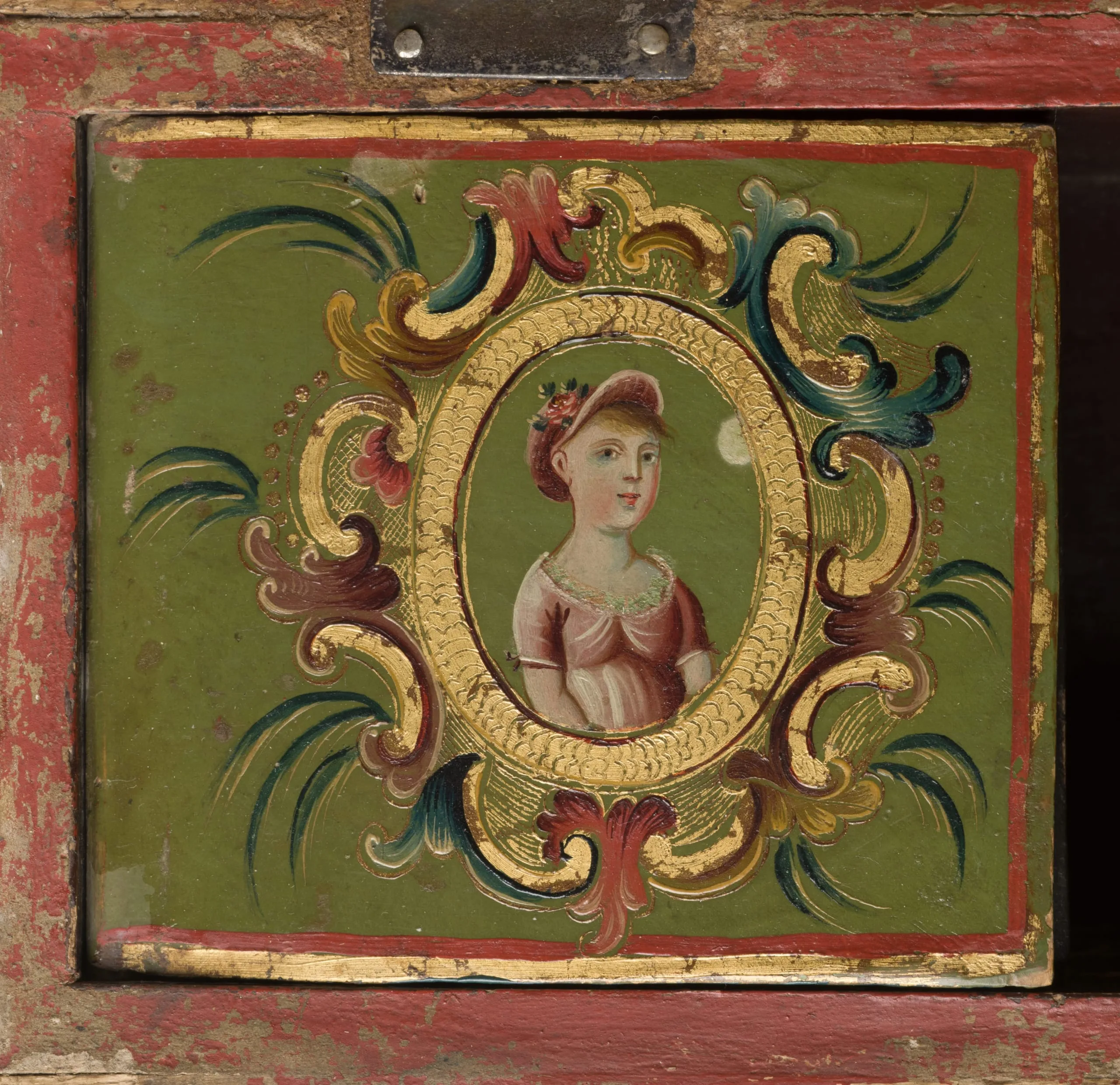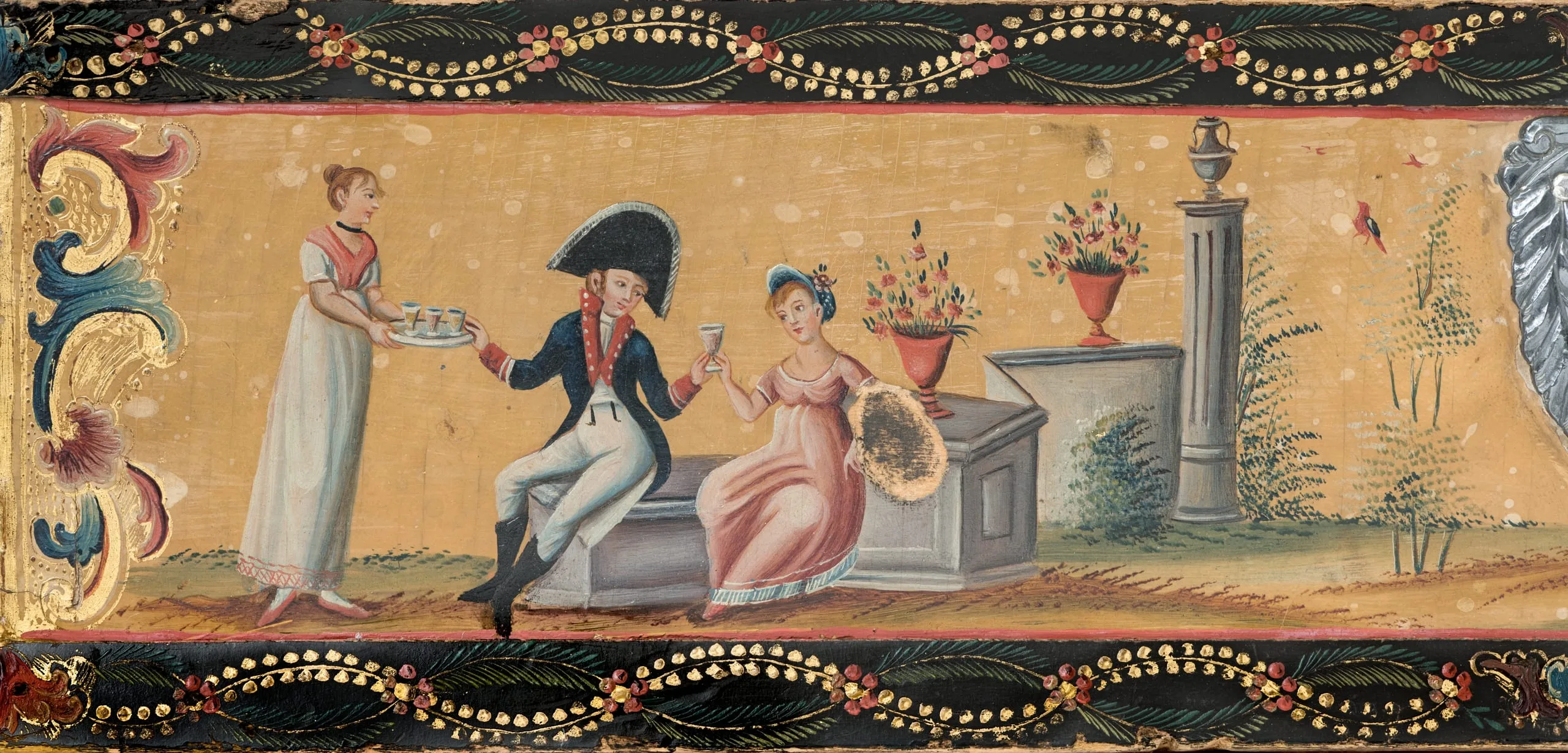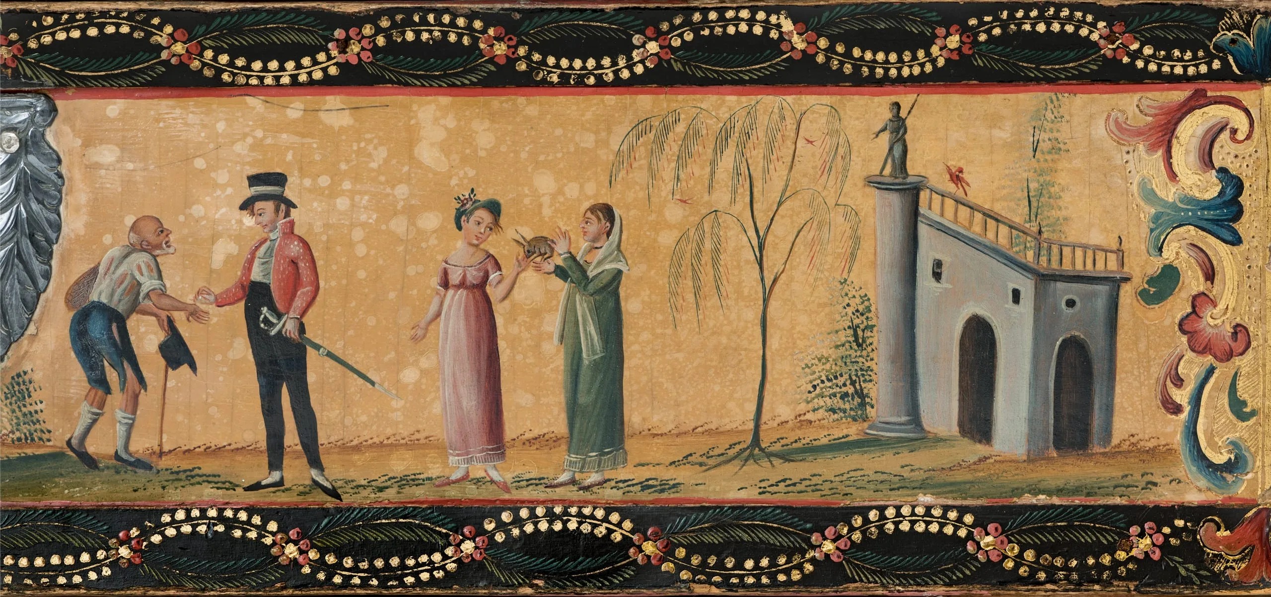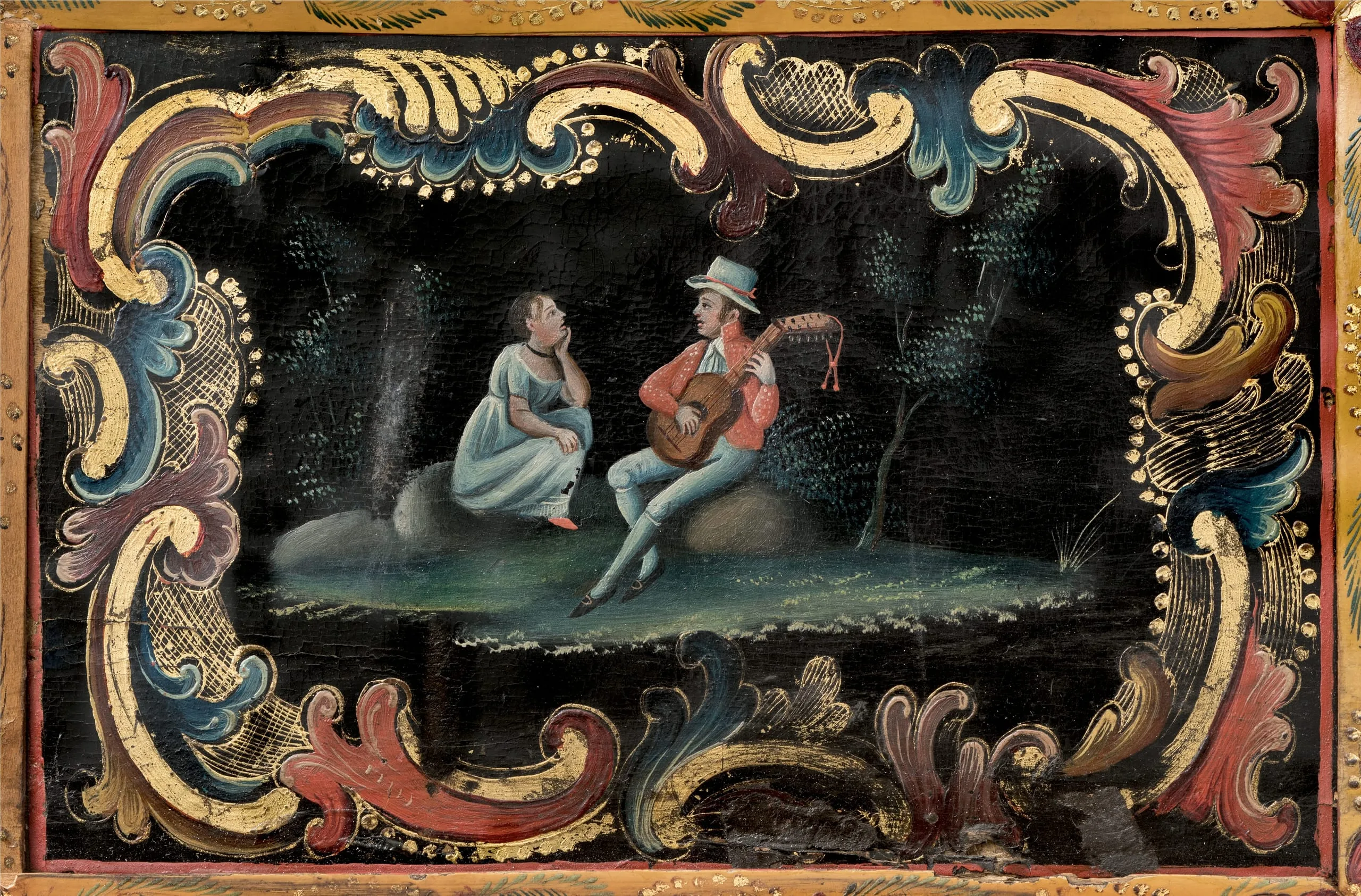 This lacquered sewing box combines Asian-inspired and European motifs, including willow trees, scenes of courtship, charity, and battle. The interior features miniature portraits of a man and a woman in fashionable European garb, while the lid depicts an Indigenous woman wearing a rebozo (shawl), signaling that this cherished luxury good that drew on multiple traditions was an unmistakable product of Mexico.