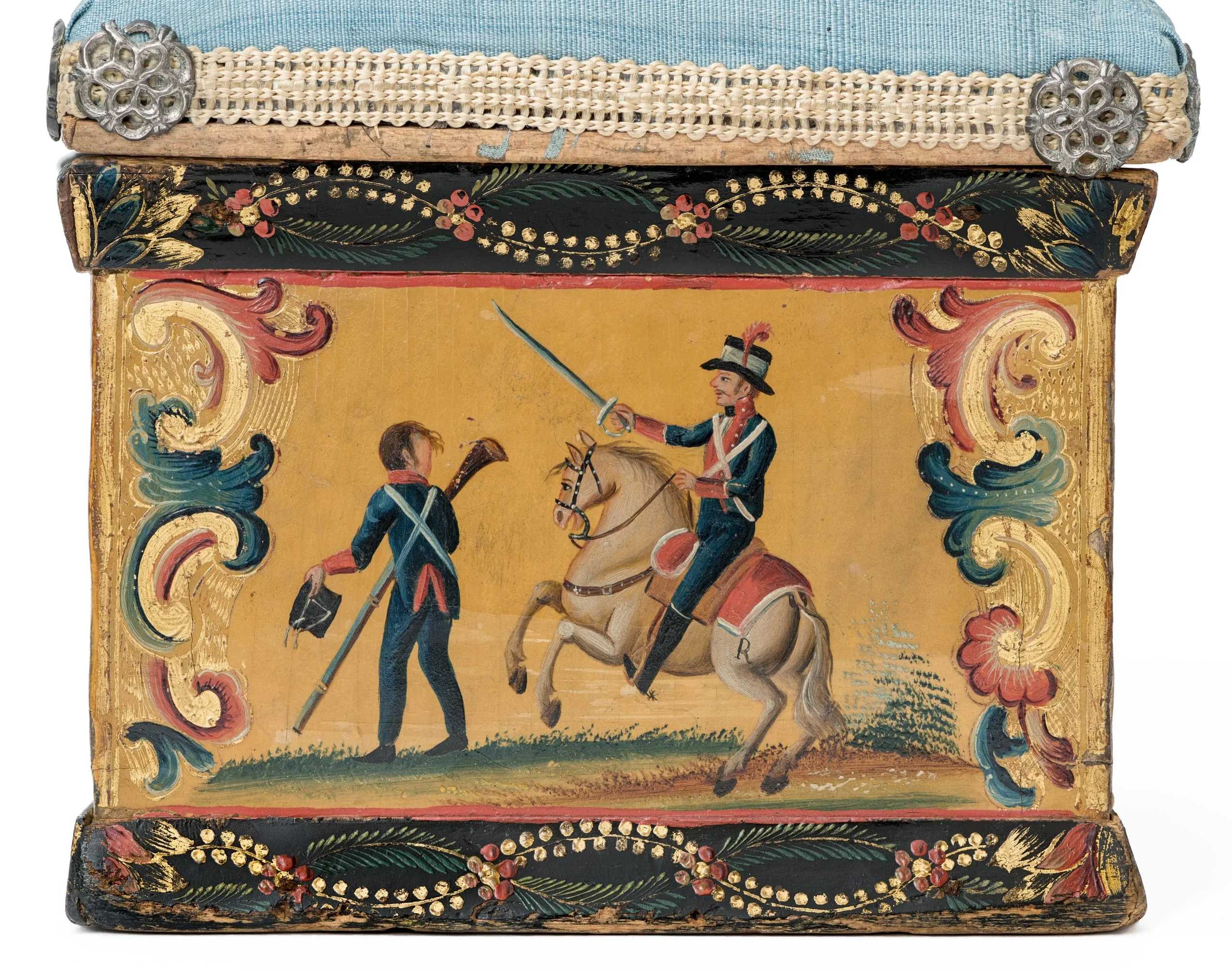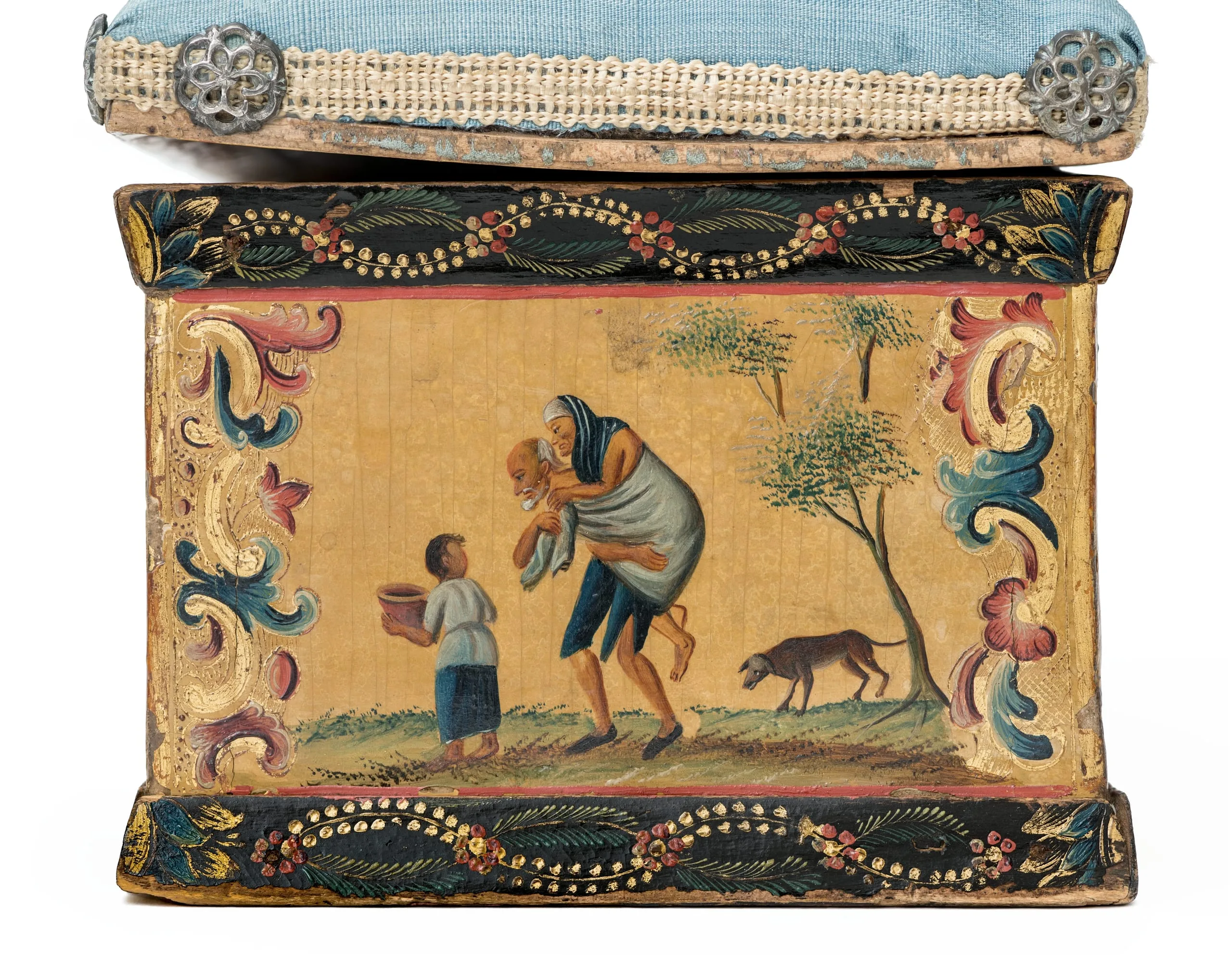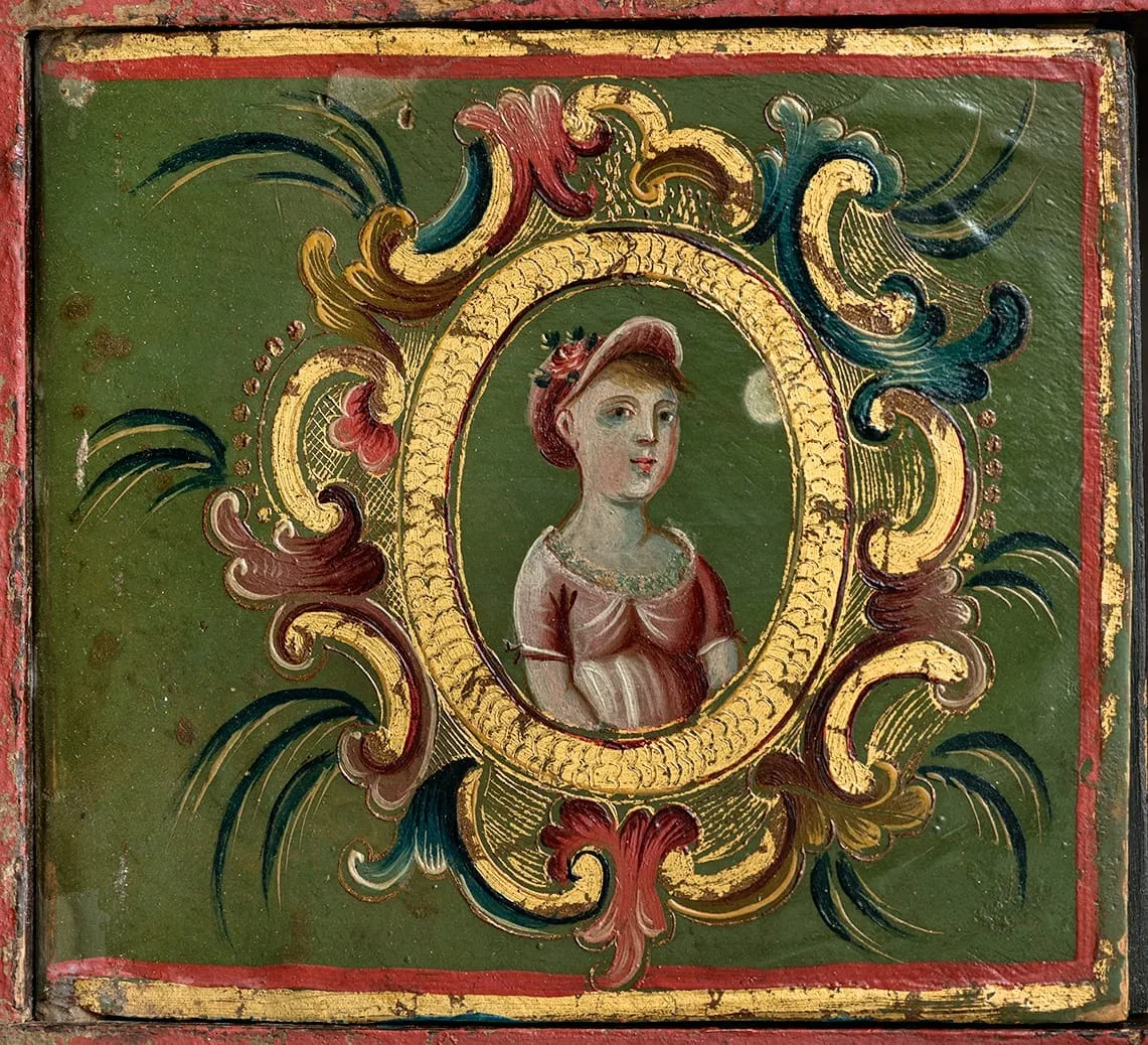 This lacquered sewing box combines Asian-inspired and European motifs, including willow trees, scenes of courtship, charity, and battle. The interior features miniature portraits of a man and a woman in fashionable European garb, while the lid depicts an Indigenous woman wearing a rebozo (shawl), signaling that this cherished luxury good that drew on multiple traditions was an unmistakable product of Mexico.