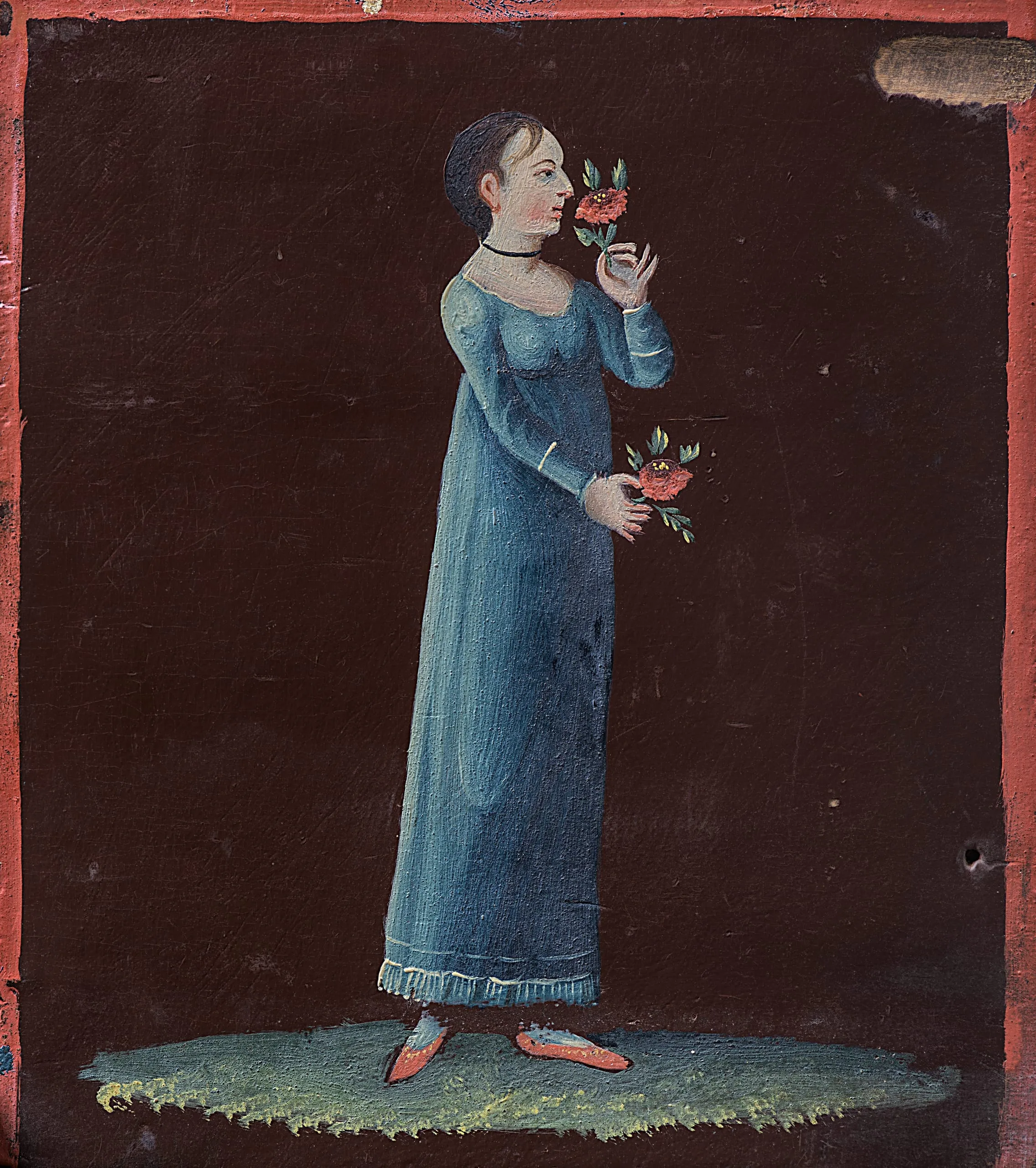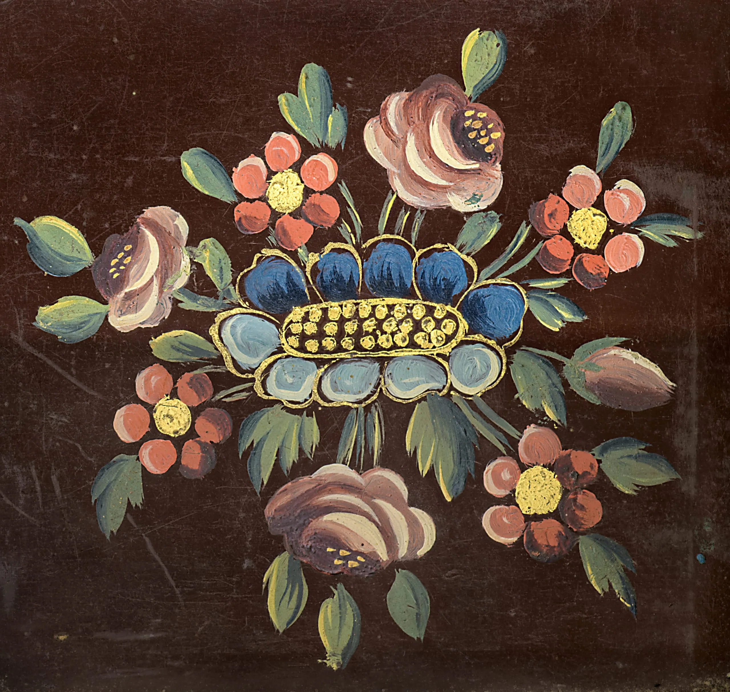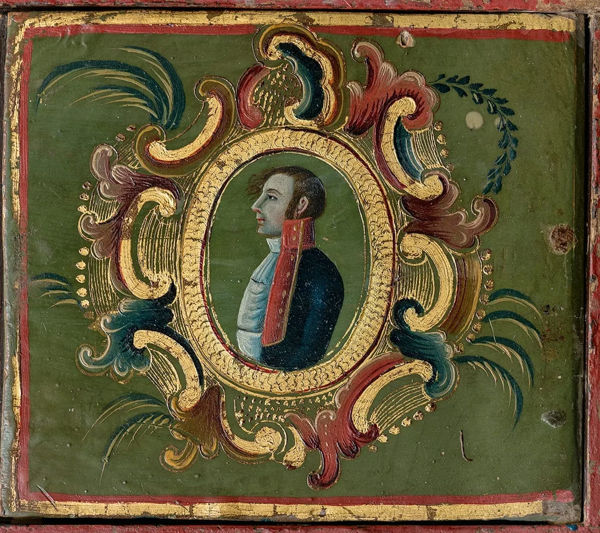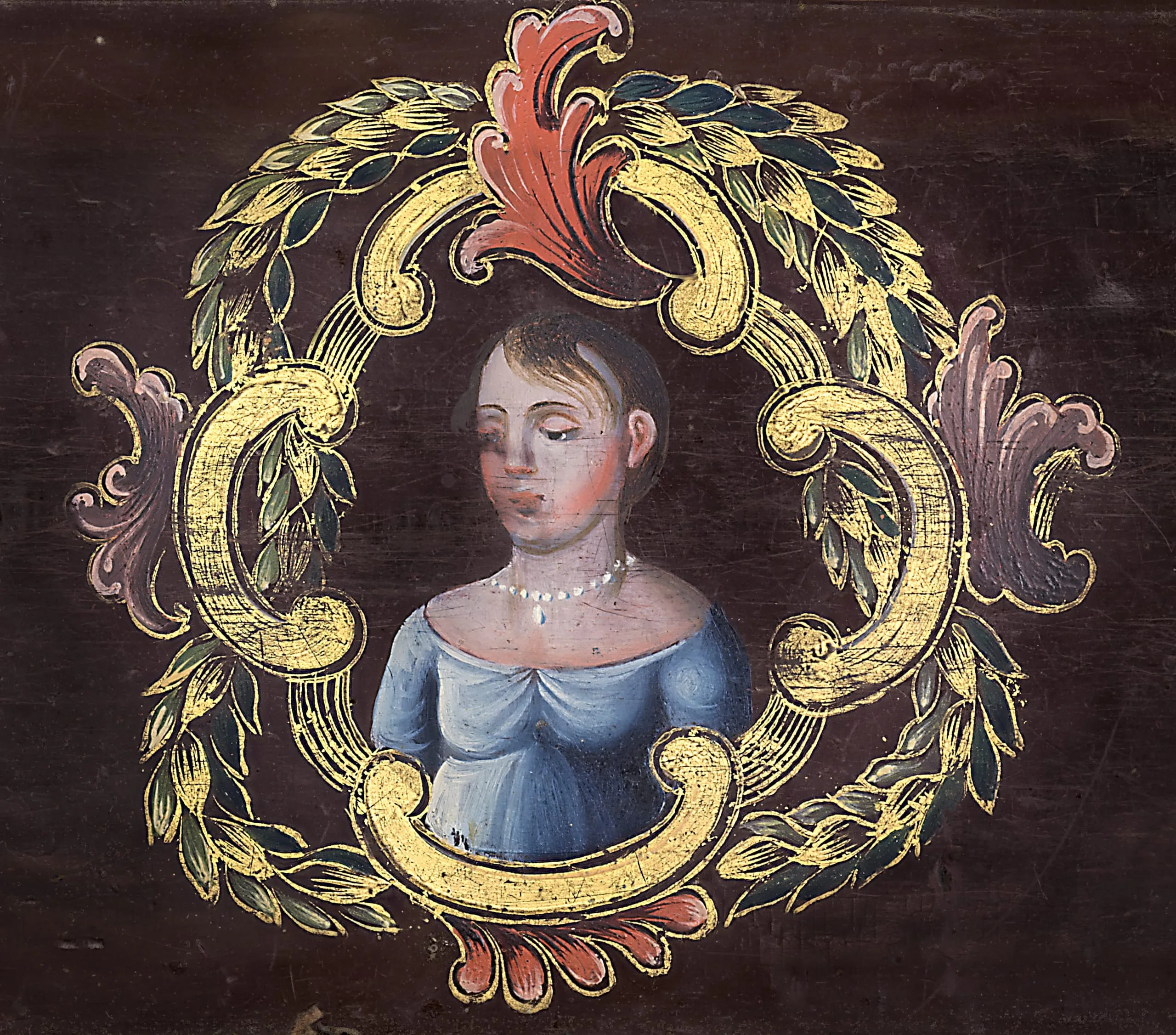 This lacquered sewing box combines Asian-inspired and European motifs, including willow trees, scenes of courtship, charity, and battle. The interior features miniature portraits of a man and a woman in fashionable European garb, while the lid depicts an Indigenous woman wearing a rebozo (shawl), signaling that this cherished luxury good that drew on multiple traditions was an unmistakable product of Mexico.