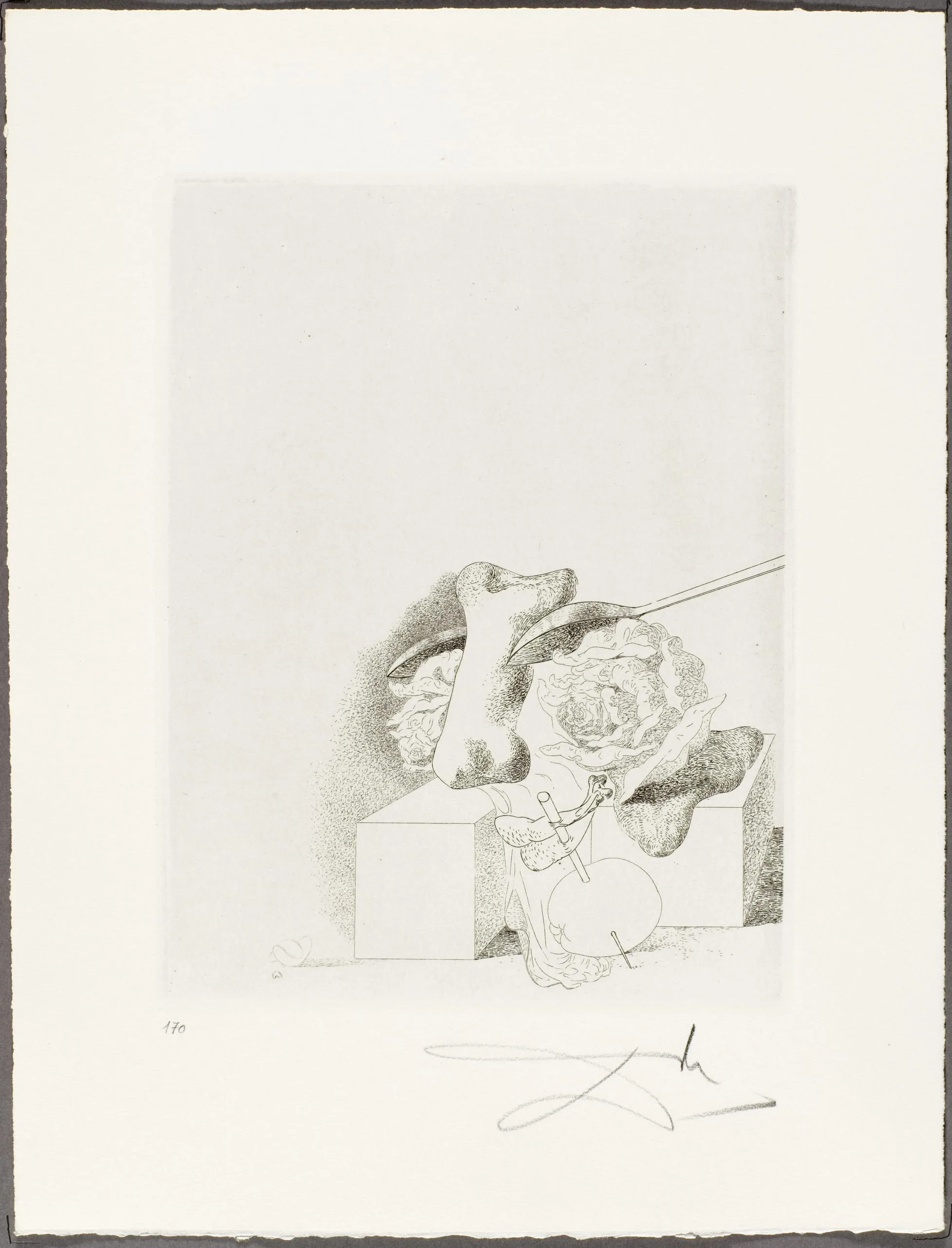 Intaglio print with fine lines and stippling, surreal composition of bone, rose-like forms, and geometric boxes on cream paper, with a cursive signature below