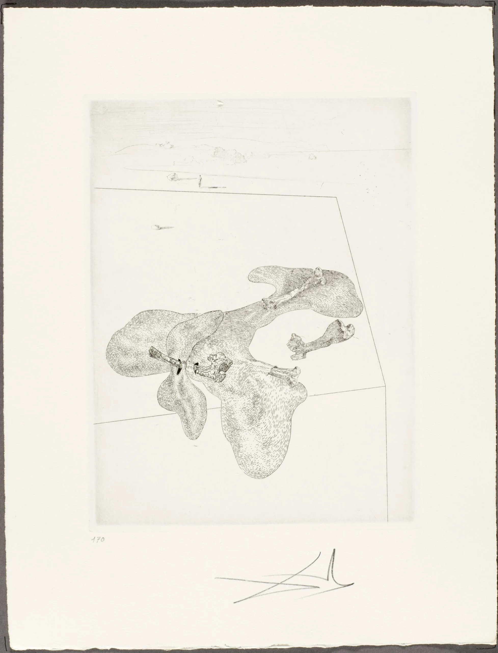 Intaglio print with stippled organic forms suggesting a reclining animal mass on a flat surface, with small mechanical details at center and a bold signature in the lower right margin