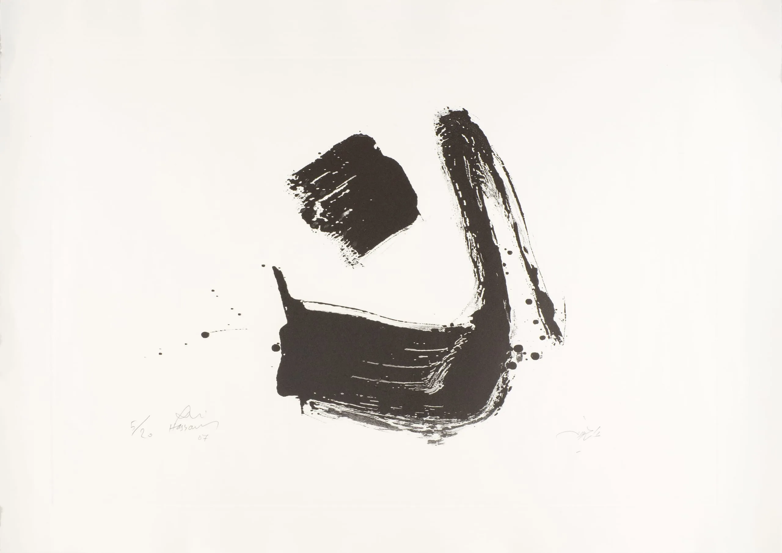 Arabic writing is a consistent and powerful theme in classical Islamic art. It also resonates with contemporary artists as both an art form and an expression of their cultural or religious identity. In his work Ali Hassan focuses only on the single letter nun (N). The bold, black letter, dramatically offset against the light paper, recalls the black inscriptions on a white ground that characterize tenth-century Islamic ceramic wares.