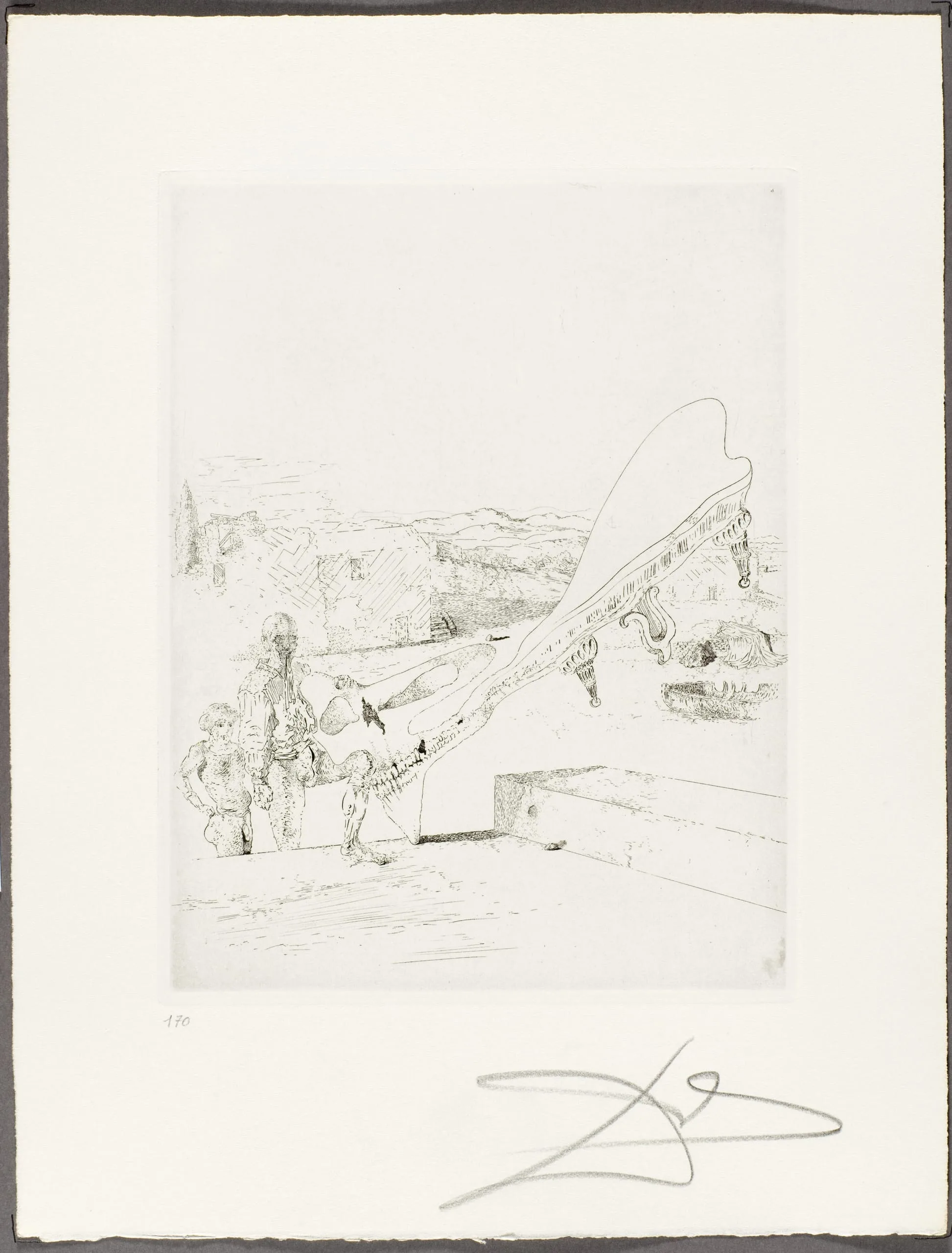 Etching on cream paper with surreal imagery: an elongated, jaw-like form arches across the composition above a low ledge, with loosely sketched human figures to the left and a hilly landscape behind