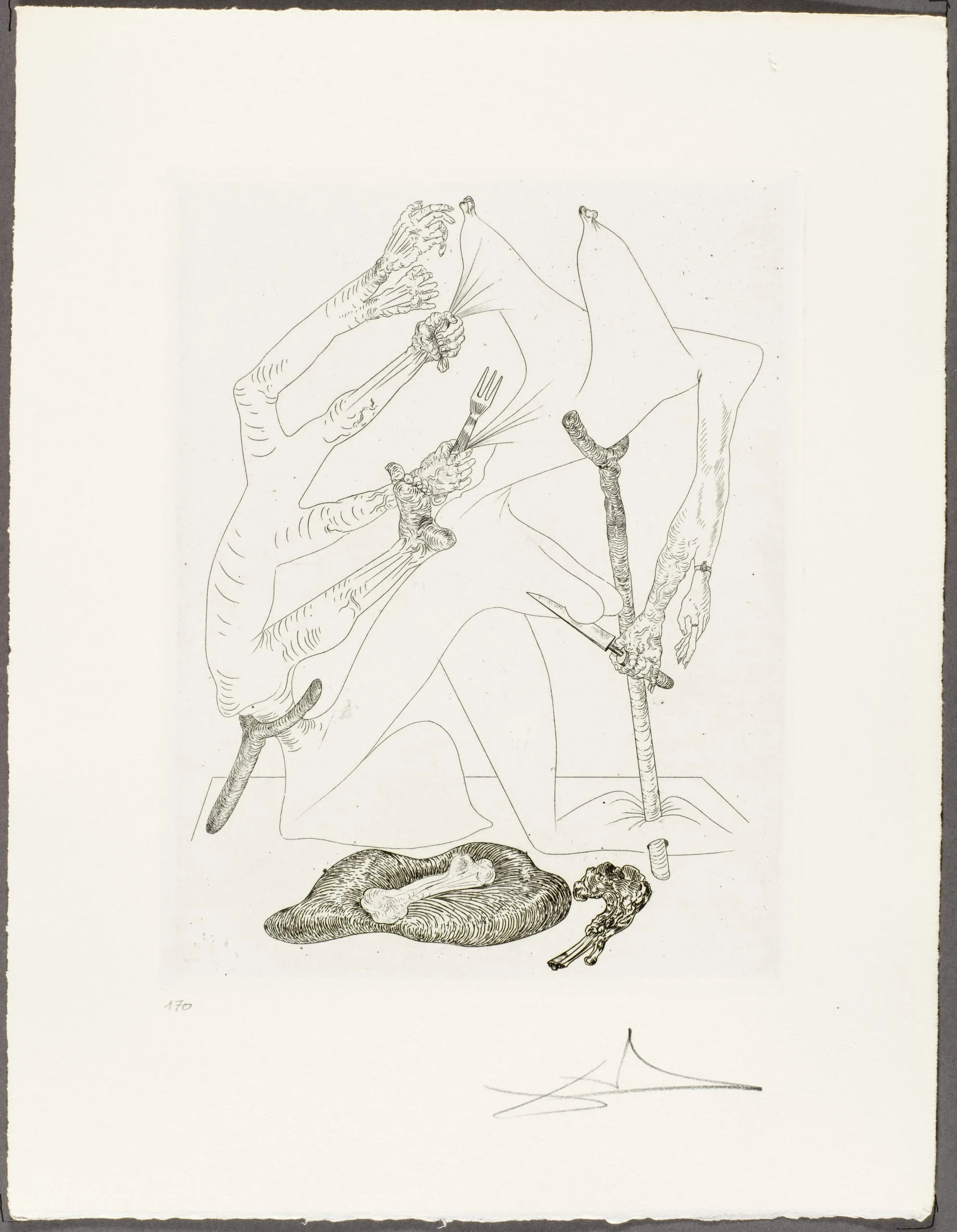 Engraving on cream paper with surreal composition of disembodied hands, a forked branch, bound cylinders, and a dark organic mass with bone-like forms