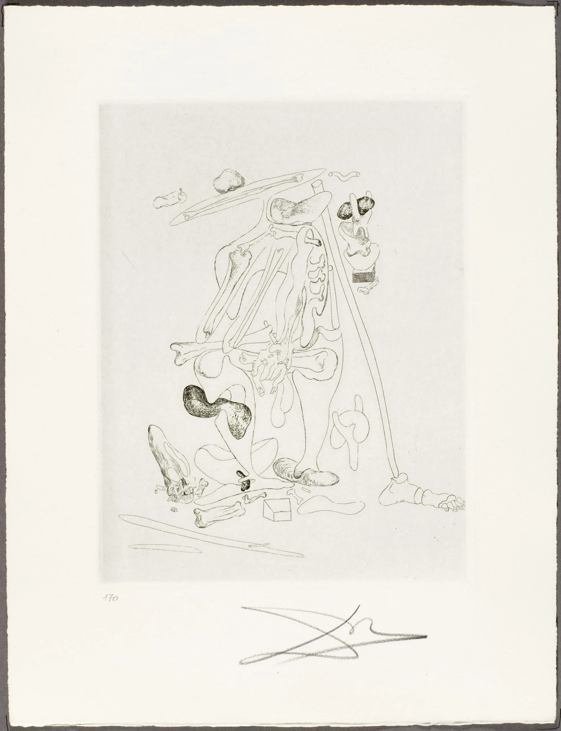 Intaglio print on cream paper depicting a disassembled skeletal figure with scattered bone forms, biomorphic shapes, and stilted legs, with a bold cursive signature below