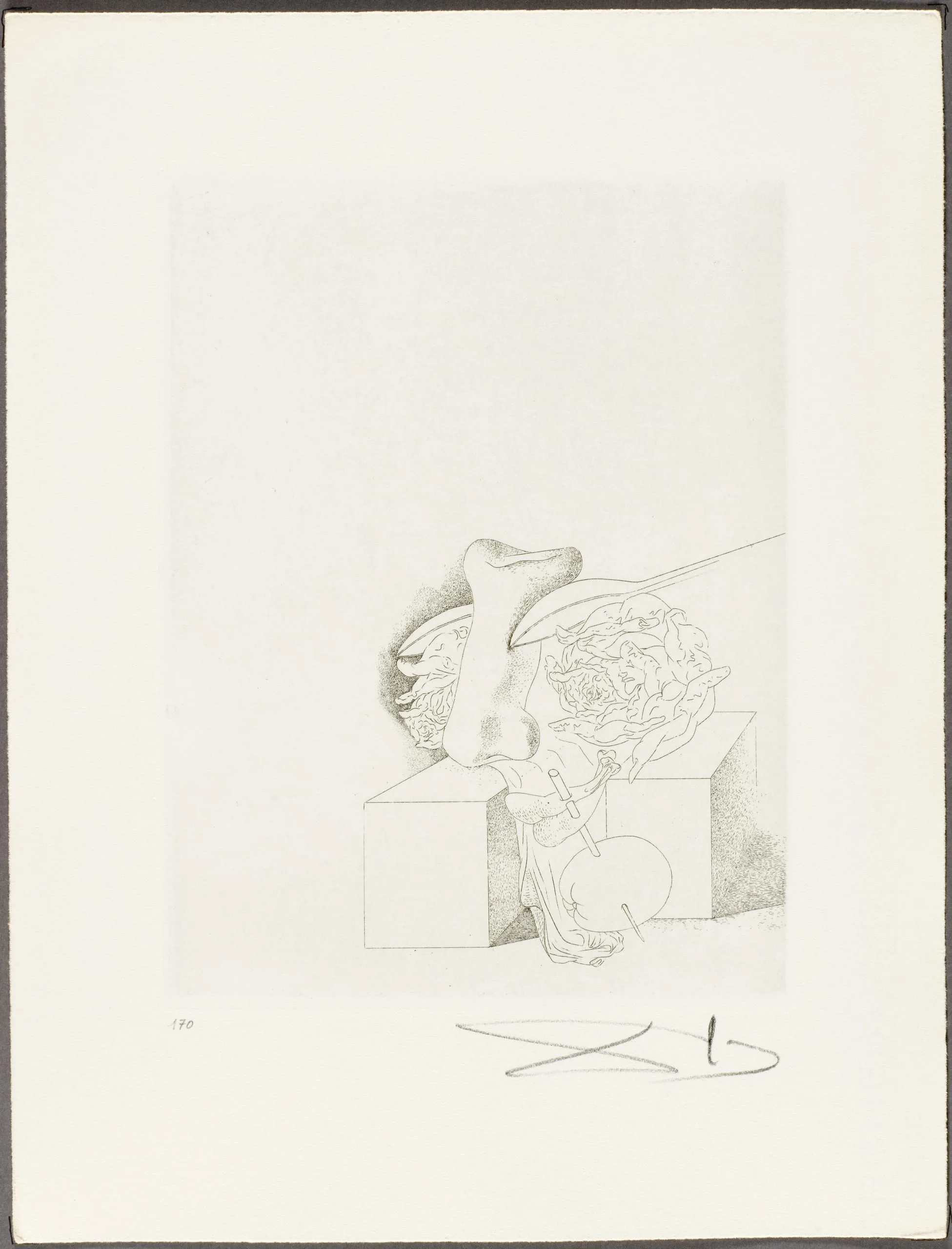Intaglio print with fine gray lines on cream paper, depicting surreal bone-like and floral forms arranged between two geometric cubes, with a pencil signature below