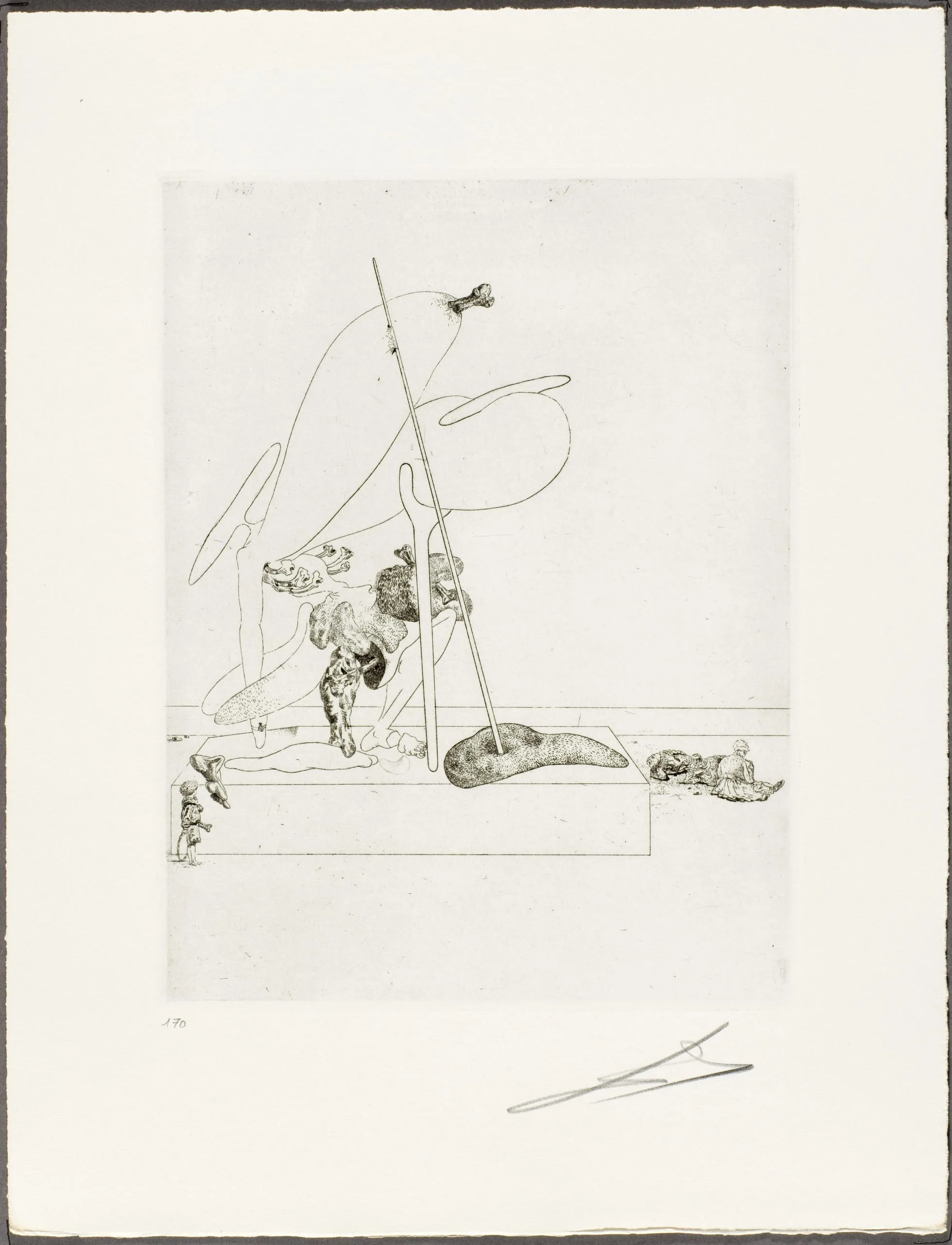 Etching with surreal figures: a detailed quadruped animal at center, looping contour lines suggesting a larger creature, small gnome-like figures along a ruled ground line, and a bold signature below the image on cream paper