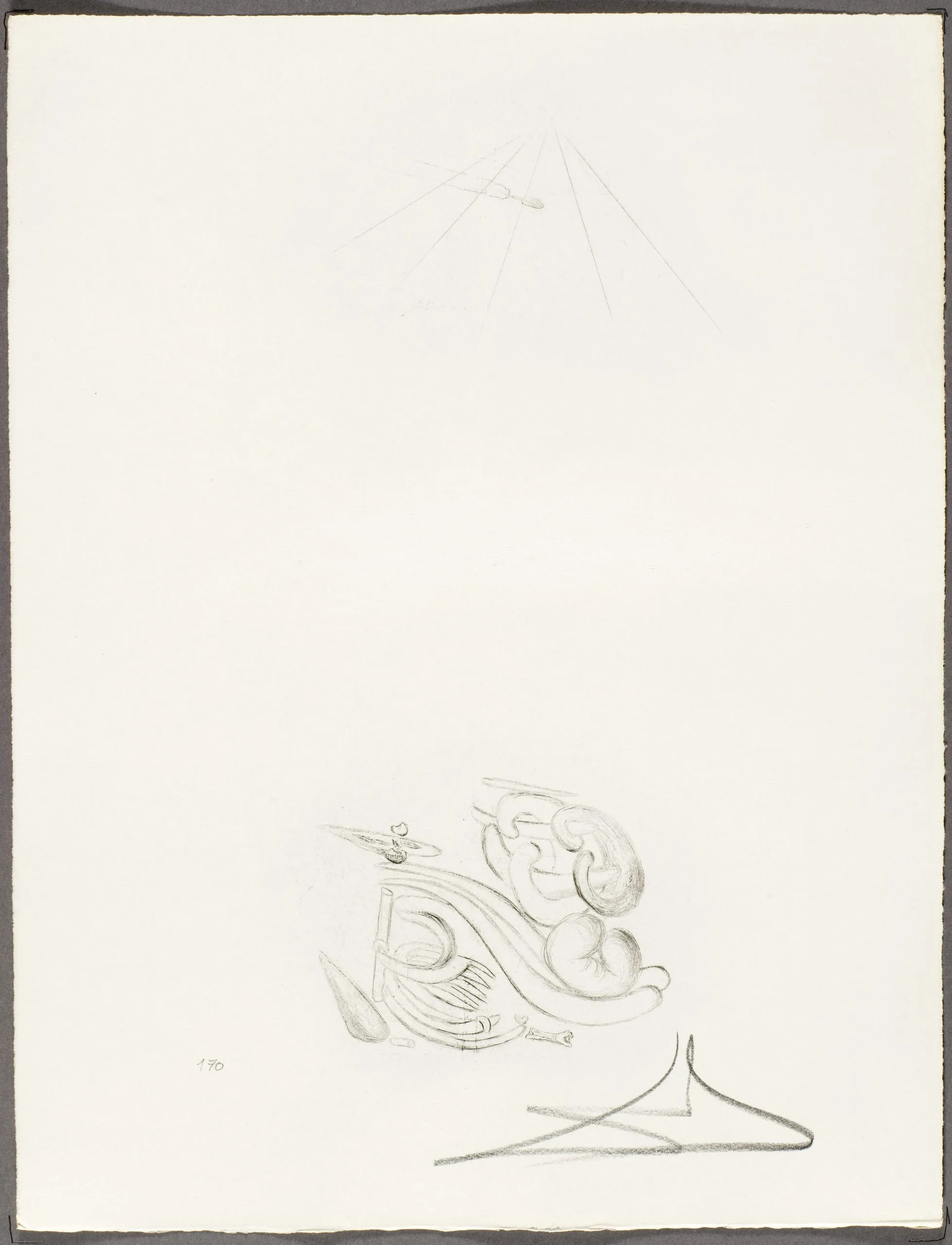 Intaglio print on cream paper with three sparse ink groupings: faint radiating lines forming a triangle near the top, a dense swirl of ribbon-like abstract forms at center-left, and a simple angular line figure at lower right