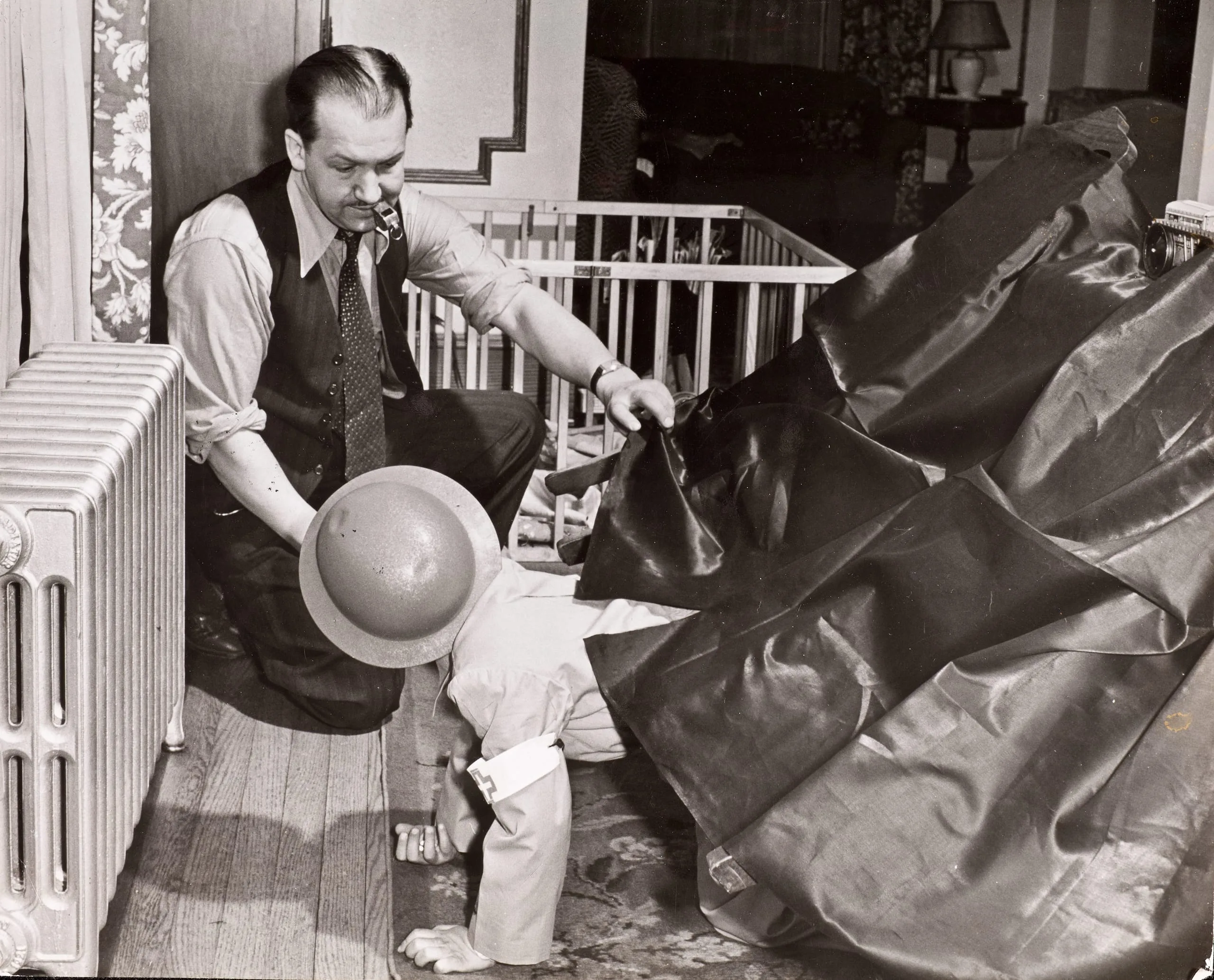 - Eugene Mott using whistle to teach his children instinctive recognition of air raid signals, Queens Village, NY, 1941