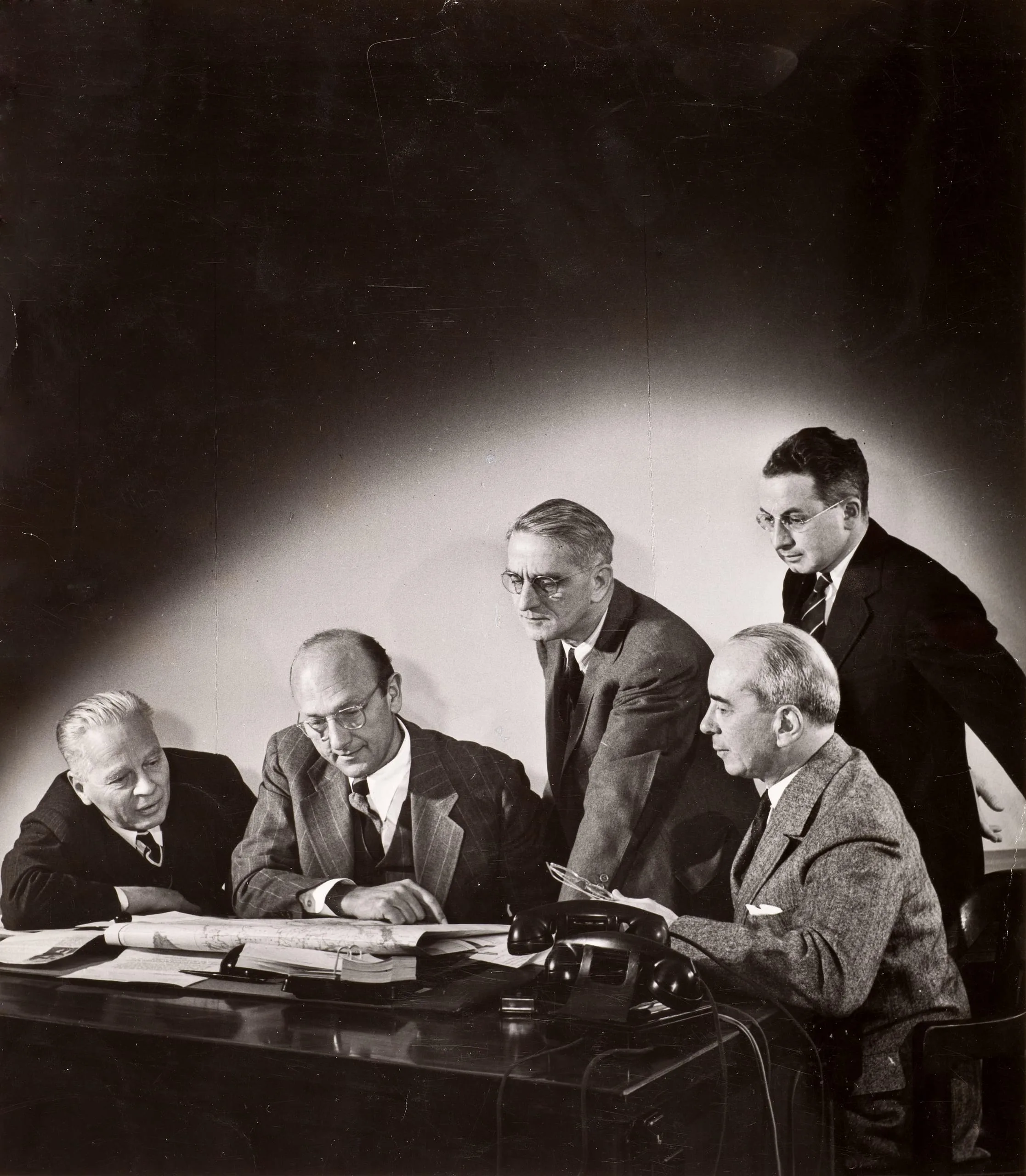 - Meeting of Atomic Energy Commission: (L-R) Sumner Pike, Chairman David Lilienthal, William Waymack, Lewis Strauss and Robert Bacher. Washington, DC, 1946