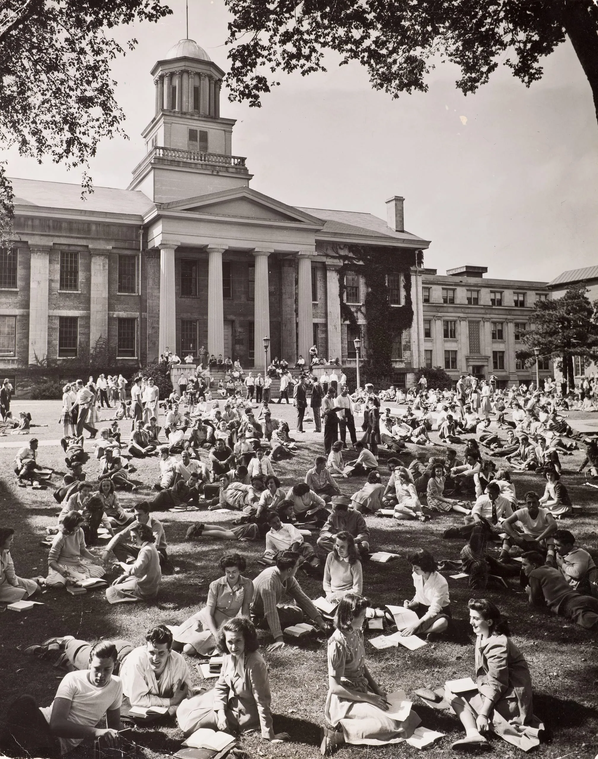 - University of Iowa student enjoying a sunny autumn day on lawn in front of Old Capitol of their beautiful campus. Iowa City, IA, 1942