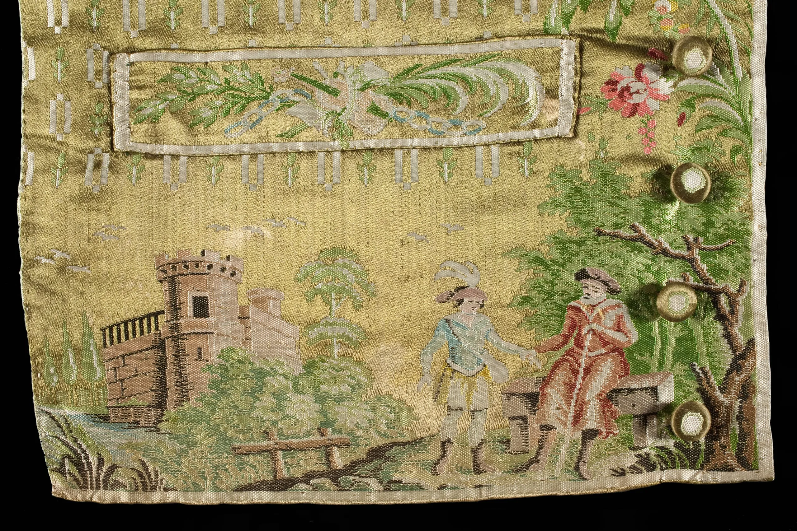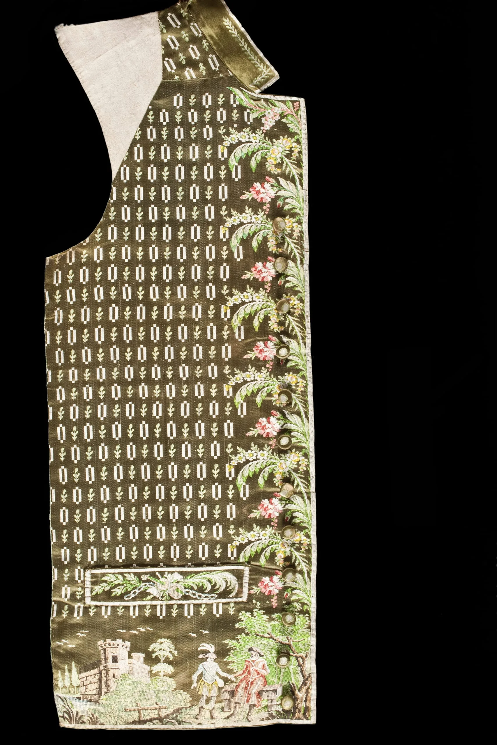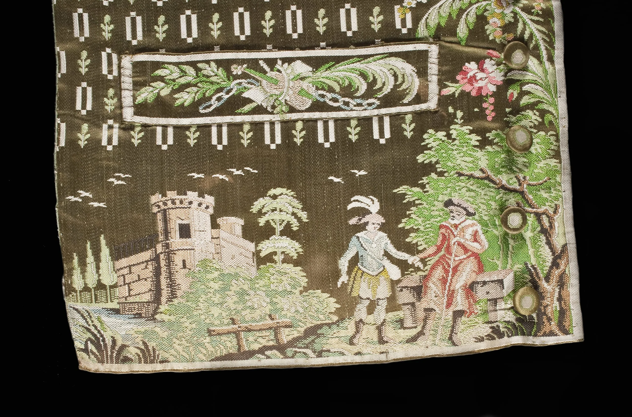 Woven silk waistcoat front panel in olive green with an allover ivory geometric and sprig pattern, a floral border with pink blooms, and a pictorial lower border depicting 18th-century figures near a castle