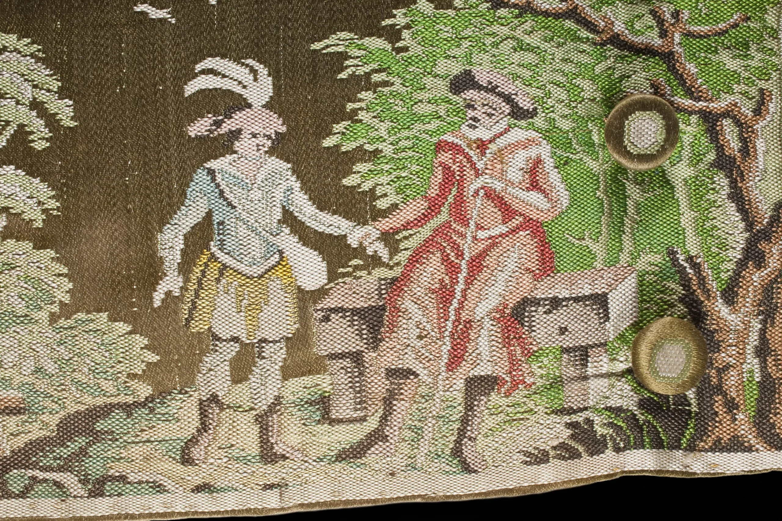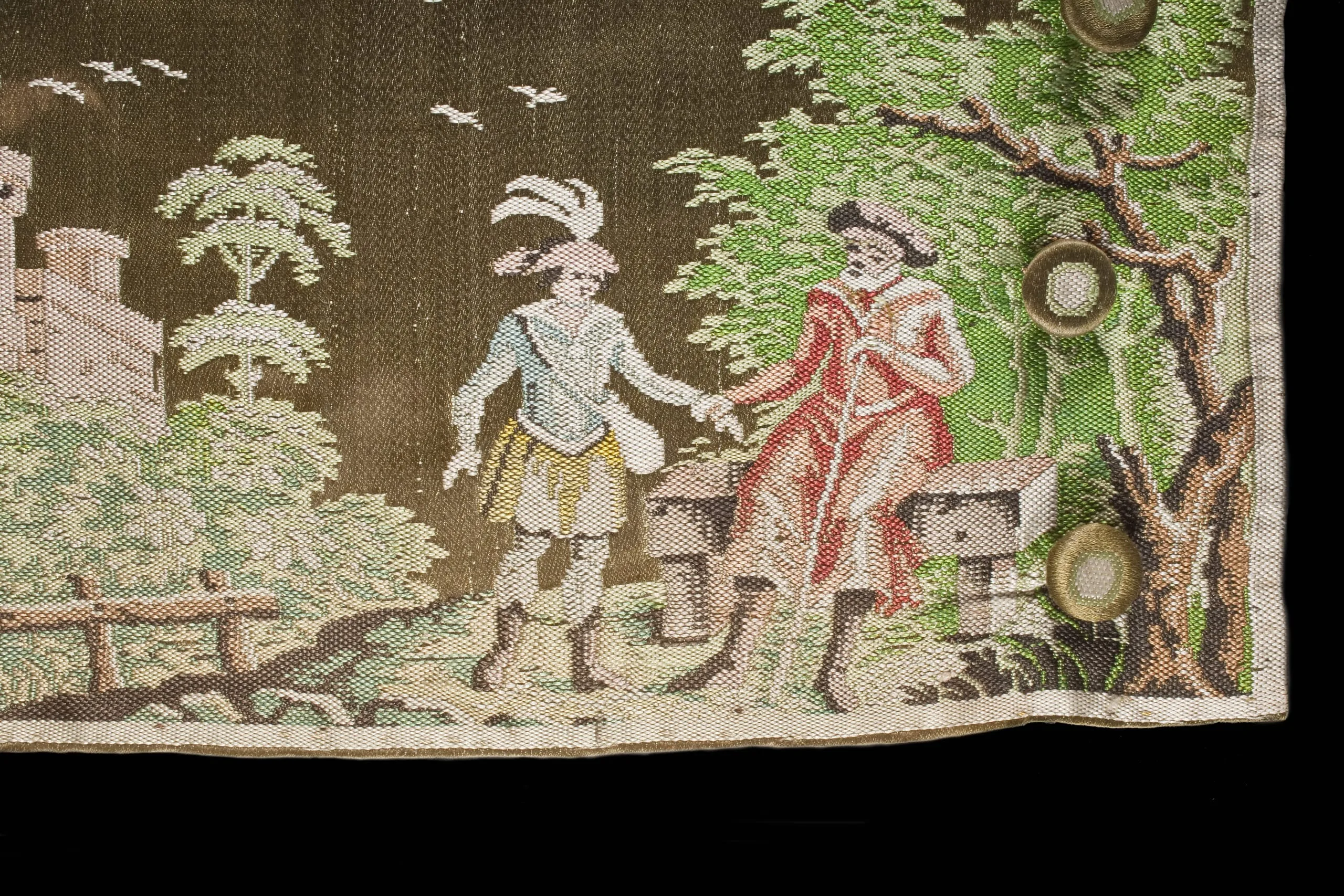 Woven textile fragment depicting two figures in 18th-century dress in a woodland setting; one in light blue with a feathered hat, another in a red coat, with green trees and brown tones throughout.