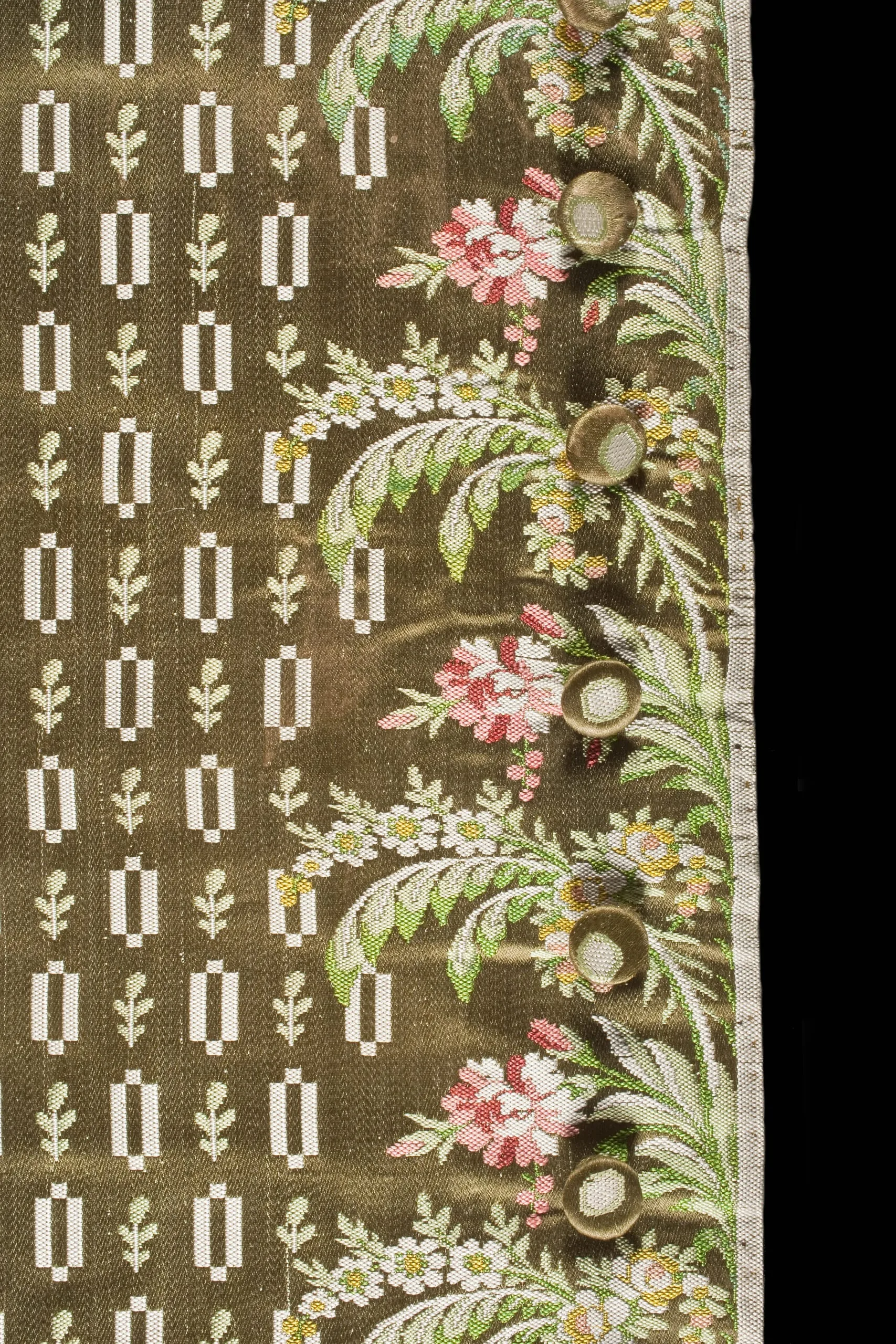 Detail of a woven silk textile in olive green, with a repeating pattern of white rectangular lozenges and small sprigs at left, and a brocaded border of pink, white, and green floral sprays with fern-like leaves at right, trimmed with small fabric-covered buttons along the edge.