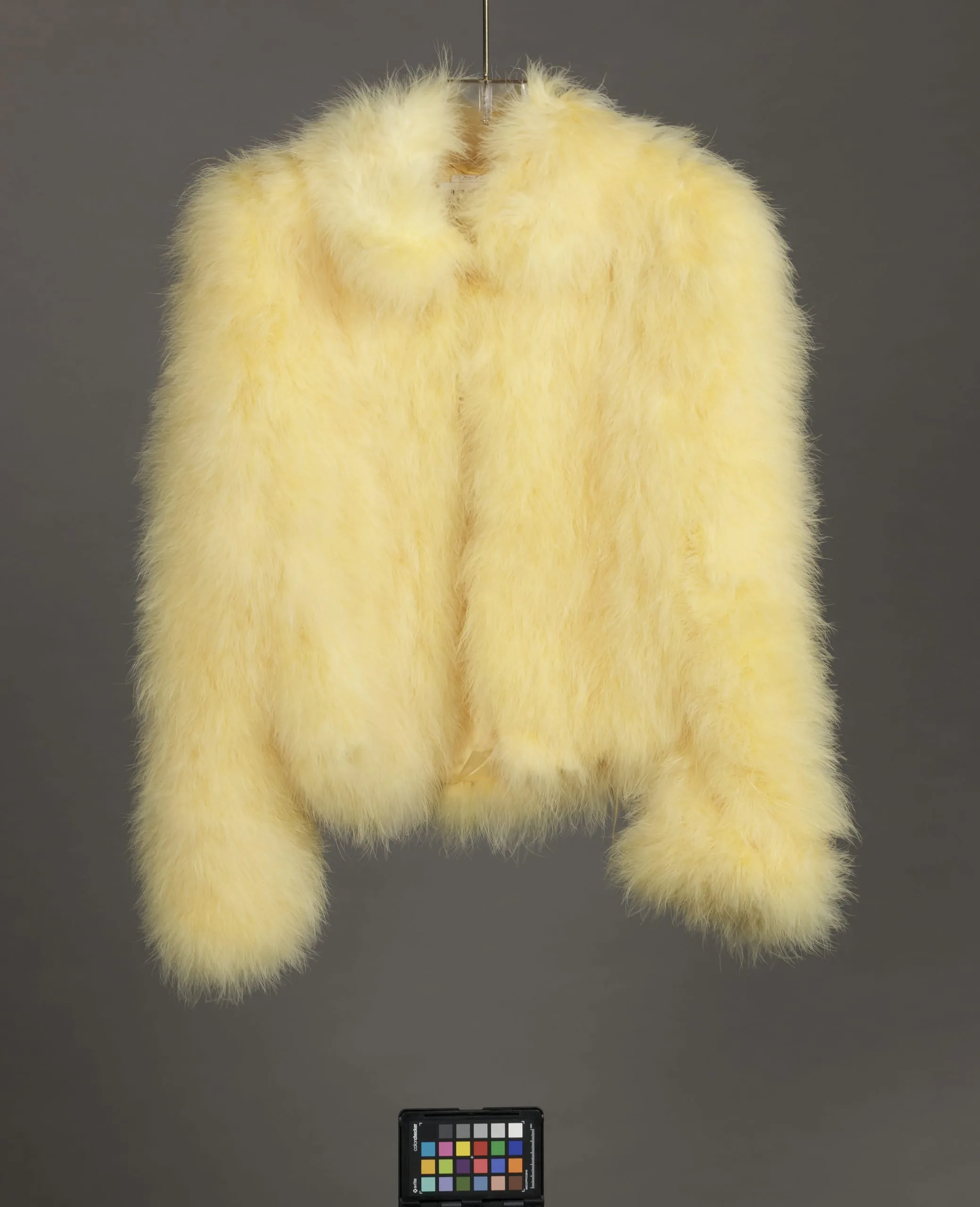 Short cropped jacket covered in pale cream-yellow marabou feathers or fur, displayed on a hanger against a gray background, with full-length sleeves and an open front