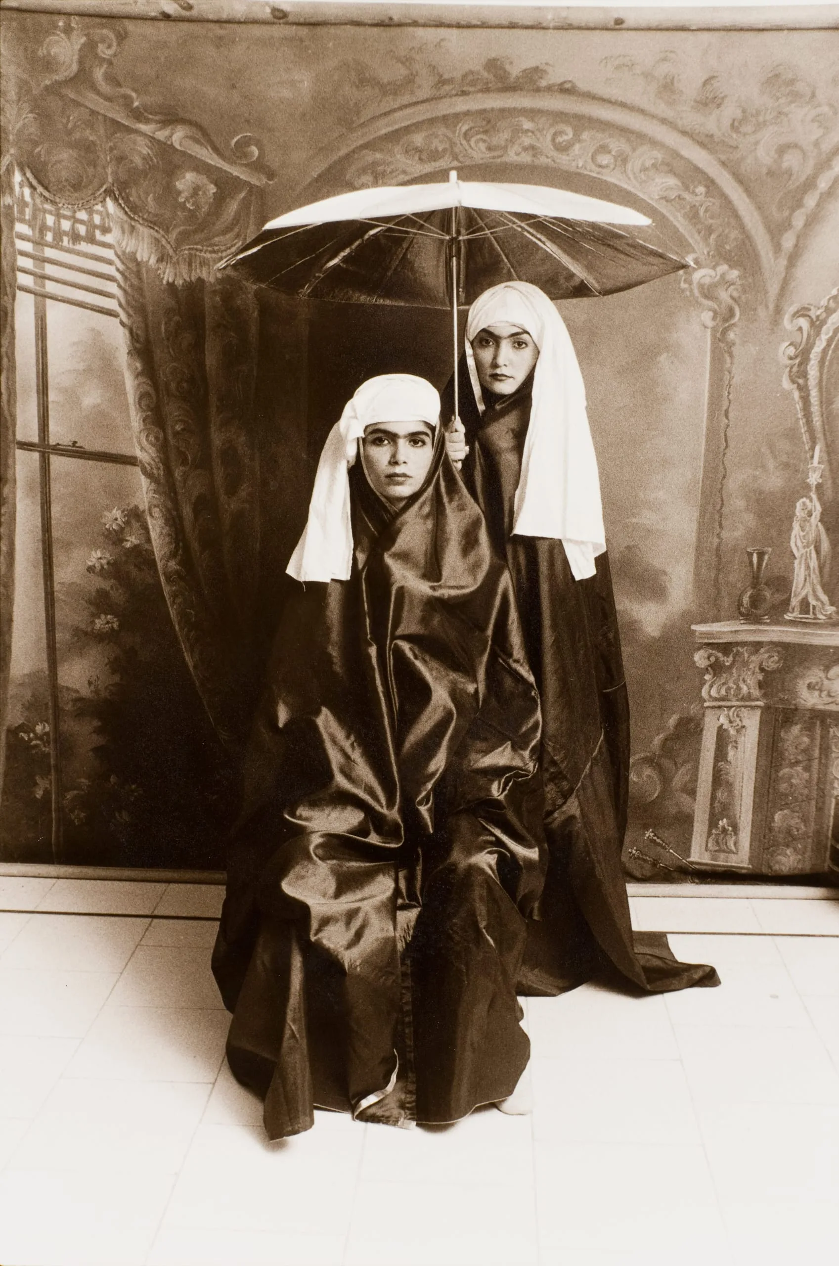 Sepia-toned studio photograph of two women in dark satin robes and white head coverings, one seated and one standing holding an open parasol, posed before a painted backdrop