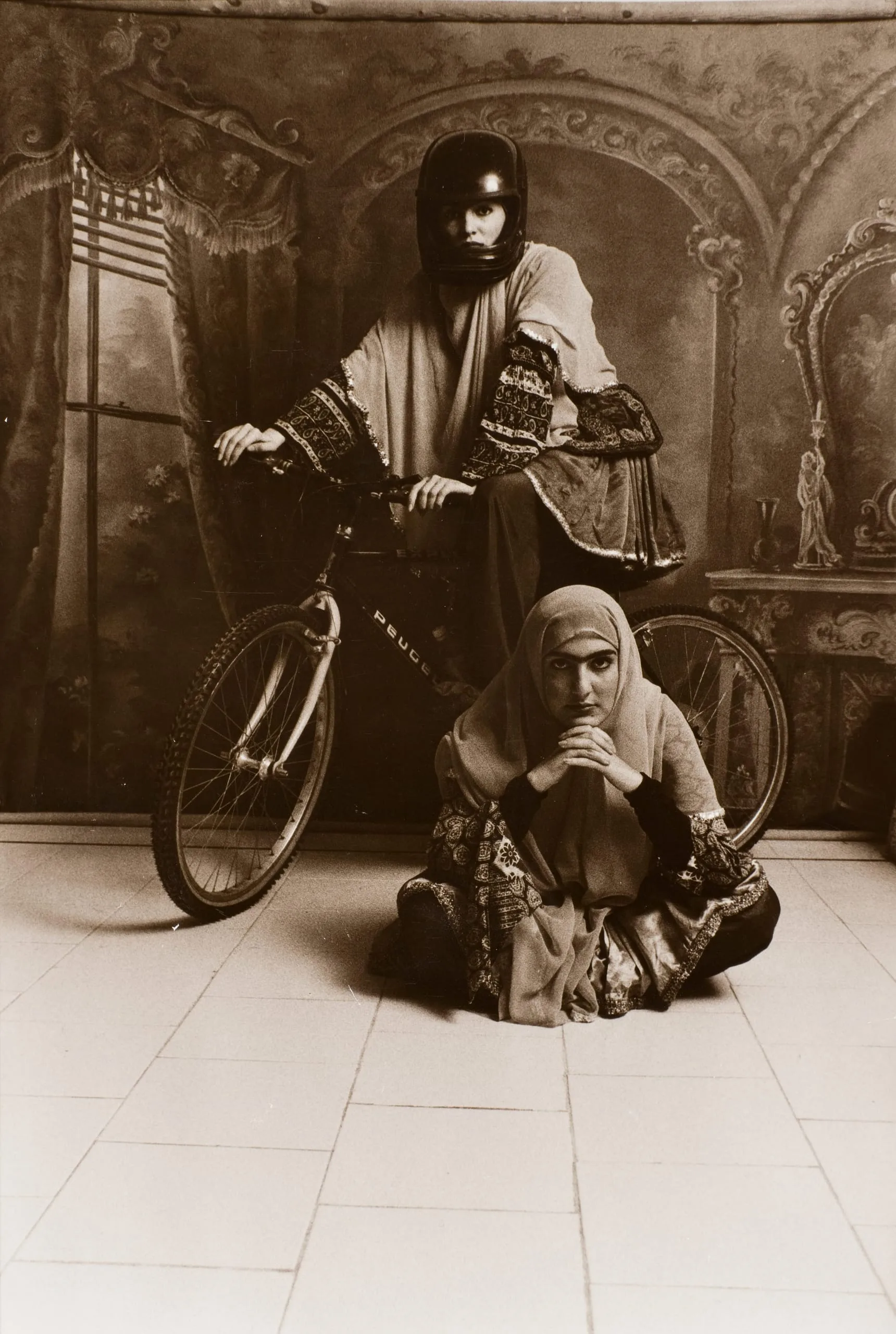 Shadi Ghadirian’s work is deeply concerned with the role of women in Iran. Her Qajar Series comments upon the paradoxical condition of women of her generation, who are caught between tradition and modernity. Growing up in the shadow of the Islamic Revolution, Ghadirian recalls witnessing forbidden activities—such as dancing, listening to music, or drinking alcohol—behind closed doors. In Qajar Series, she recreates the format of nineteenth-century studio photography but poses her sitters with contemporary objects such as newspapers, mountain bikes, and Pepsi cans, creating jarring juxtapositions of past and present that allude to the contradictions of life in contemporary Iran. Ghadirian