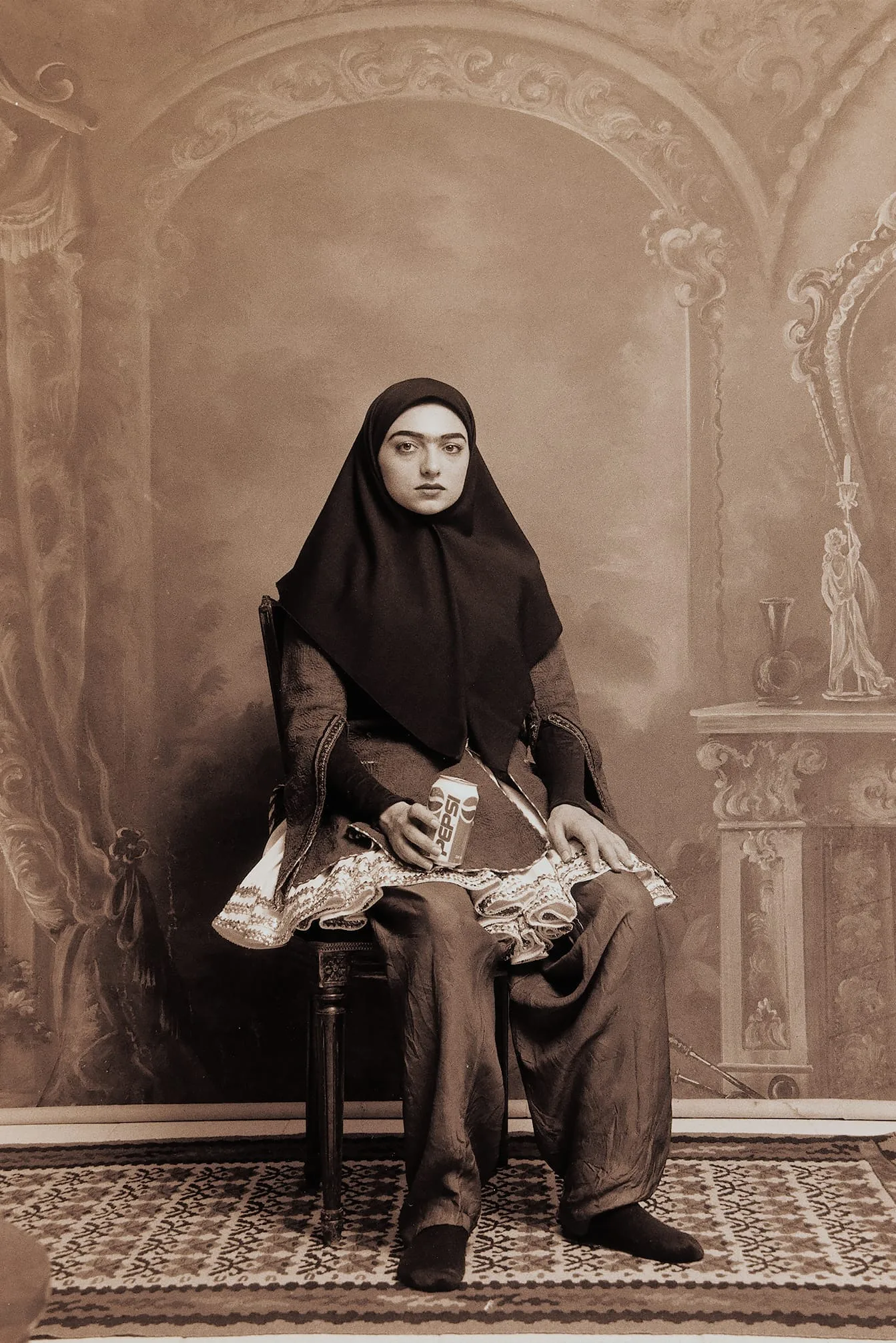 Inspired by the studio portraiture of the late nineteenth century, Shadi Ghadirian re-created the earlier settings in a set of thirty-three photographs known as the Qajar series. She employed painted backdrops and dressed her models in vintage clothes to emulate the fashion of the day—headscarves and short skirts worn over baggy trousers, and thick, black eyebrows. She added modern-day elements, such as a pair of sunglasses (M.2008.35.1), a Pepsi can (M.2008.35.9), and a single-lens reflex camera (M.2008.35.14) to create ironic imagery that reflects the tension between tradition and modernity in Iranian society.